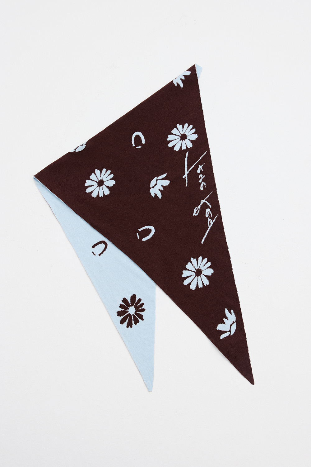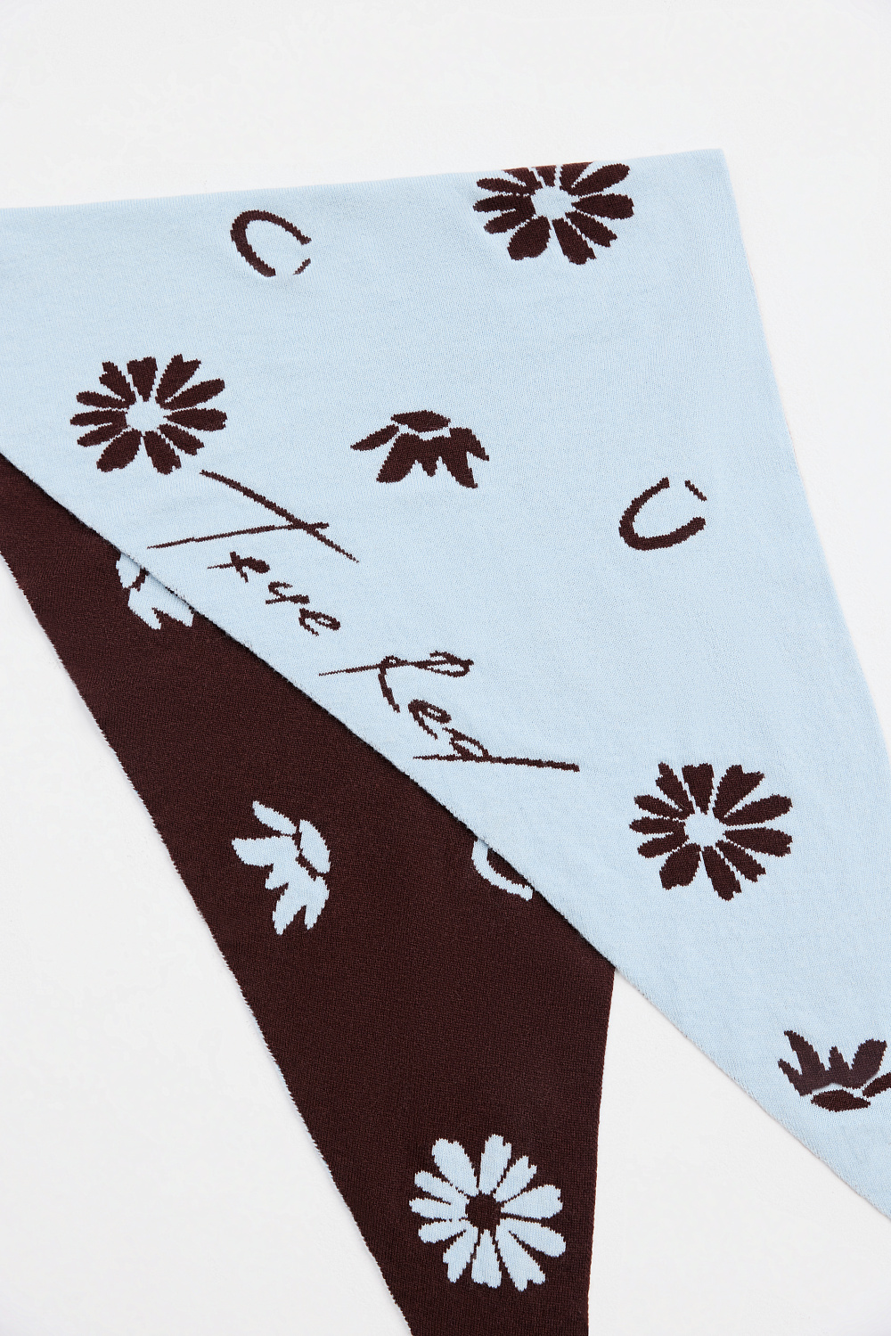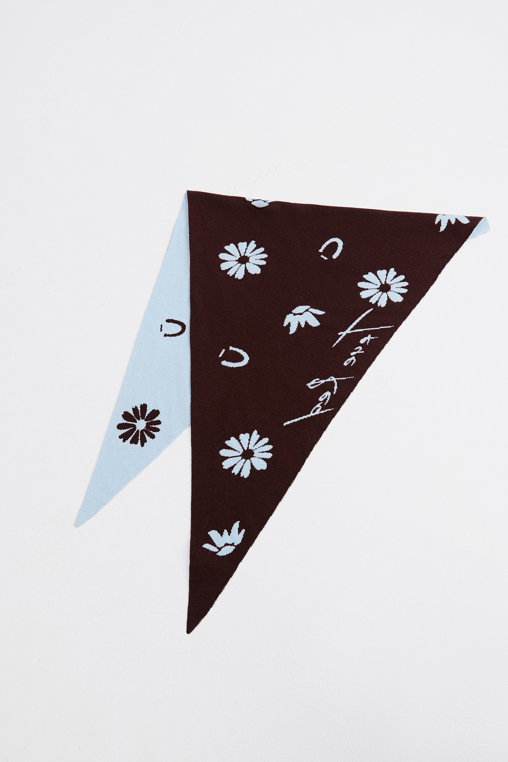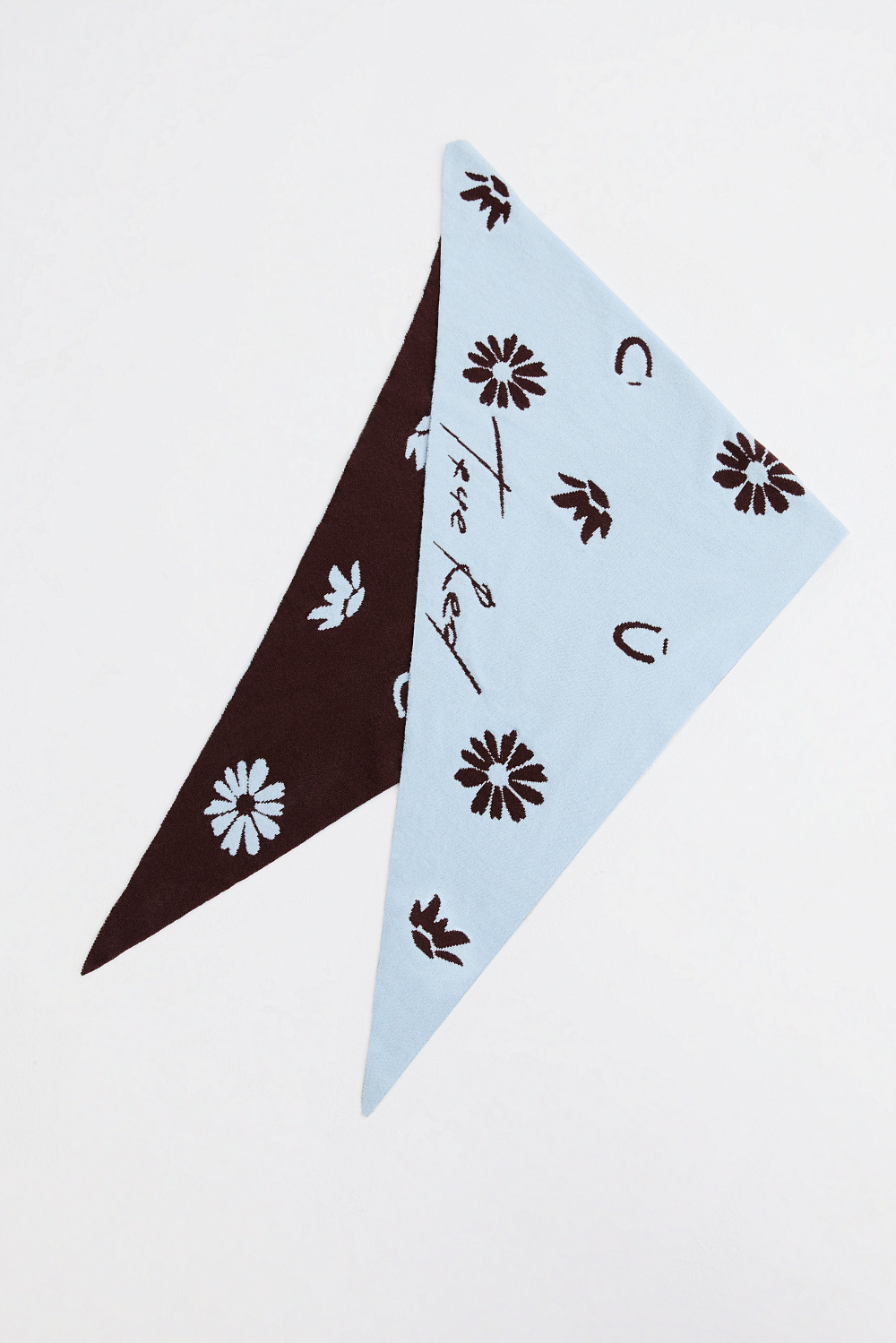 Косынка связана из мягкой и тёплой пряжи с шерстью, кашемиром и нежной вискозой. Косынка двухсторонняя, с вязаным цветочным принтом и логотипом бренда. Включите косынку в свой образ: повяжите на голову, накиньте как согревающий шарф или акцентный аксессуар со свитером, пальто или пуховиком.