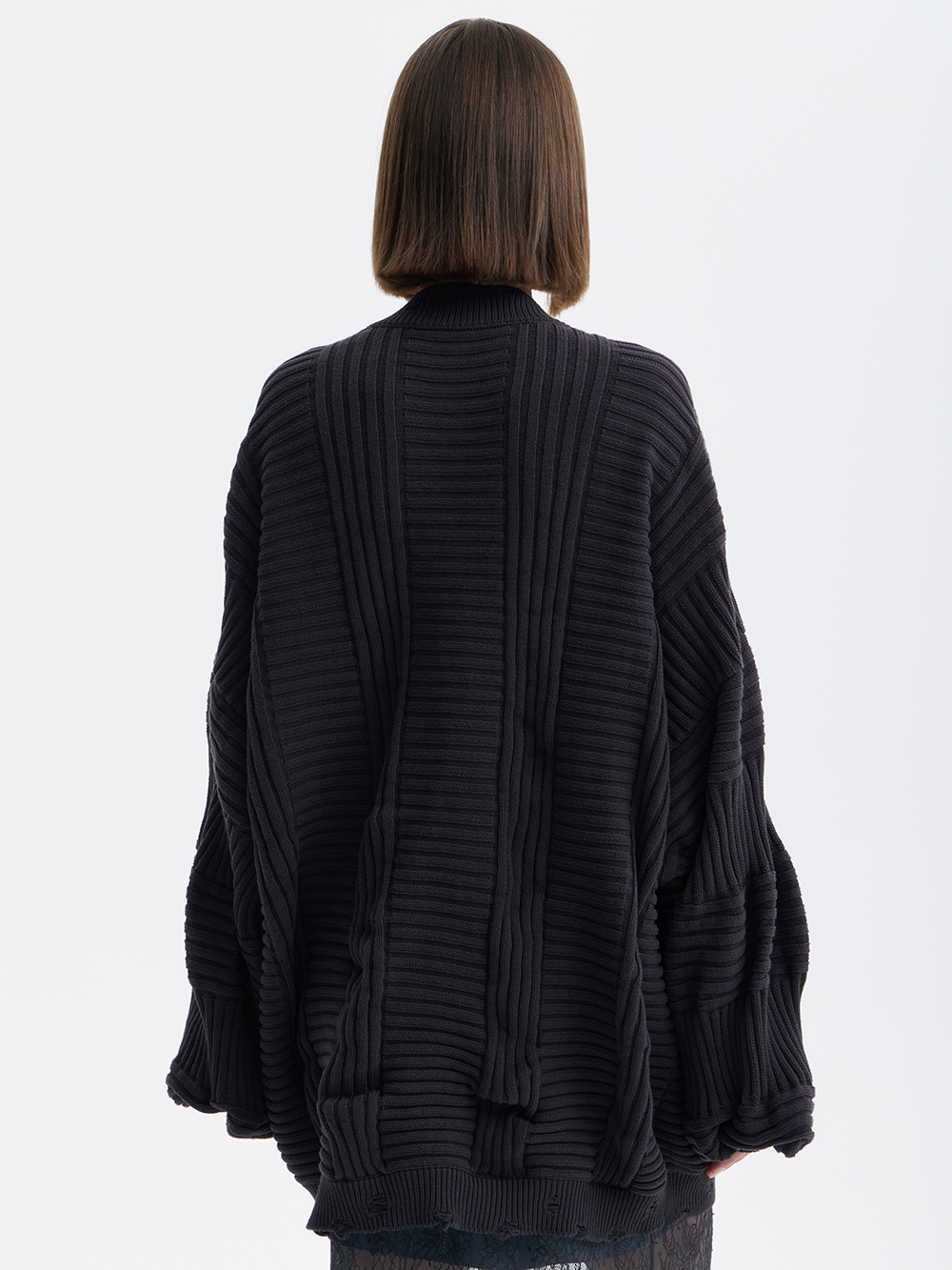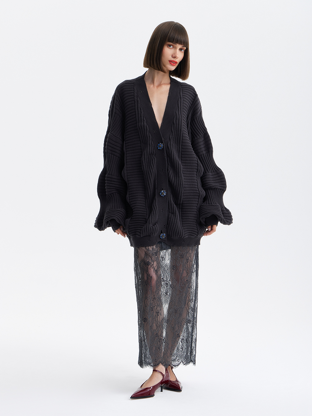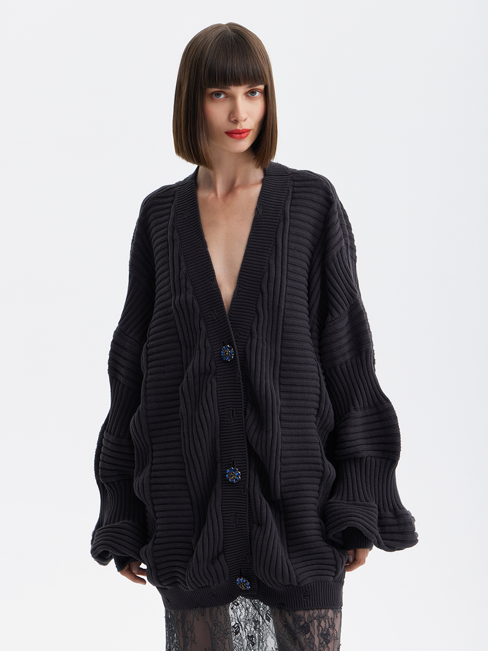 Свободный кардиган фактурной вязки создан для многослойных образов и интересен своей сложной формой. При едином размере и объёме кардиган красиво садится на любой тип фигуры; он приятно тяжёлый, выглядит эстетично и убедительно, но не массивно. Визуальной лёгкости модели добавляет V-образный вырез, спущенное плечо и филигранно выполненные сборки на рукаве.