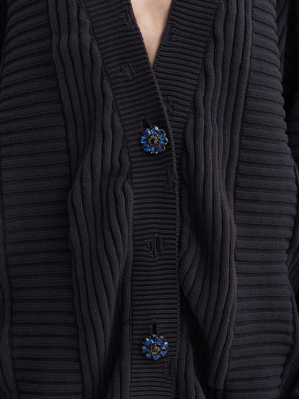 Пуговицы с кристаллами соседствуют с аккуратными элементами гранж: это делает кардиган универсальным в любом векторе стилизации. Мы выбрали хлопковую пряжу превосходного качества, мягкую и приятную тактильно. Благодаря объёму и фактуре кардиган будет достаточно тёплым, чтобы сначала надевать его вместо верхней одежды, и в то же время не жарким, чтобы всю зиму носить его в помещении.