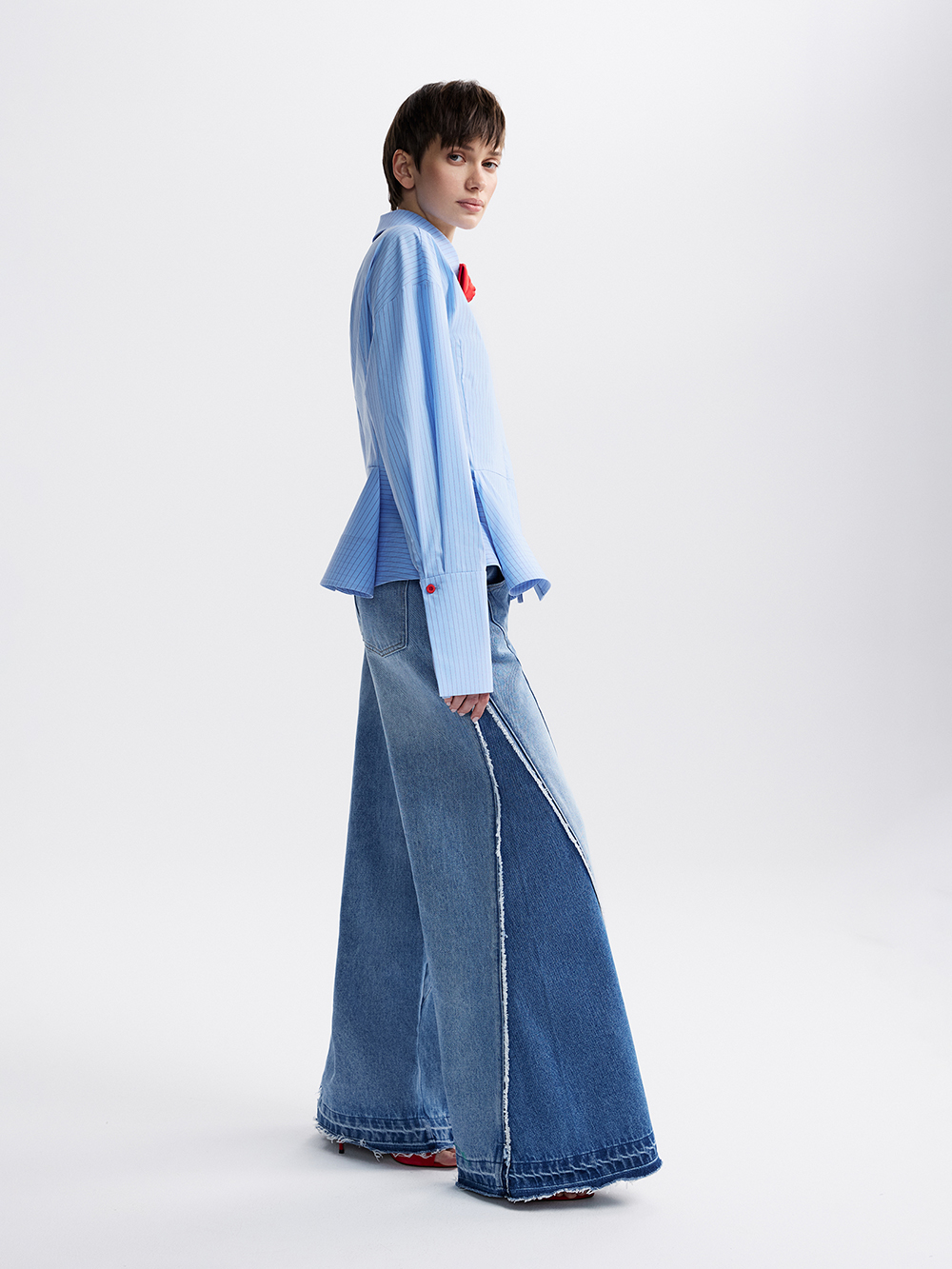 Рубашка с баской украшена вышивкой и розой, выполненной в технике оригами. Роза крепится на петлю и пуговицу под воротником, её можно снять при желании. Выразительный силуэт с акцентом на талии: баска, собранная в складки и дополнительно уплотнённая прострочкой, перекликается с широкими манжетами. Рубашка выполнена из приятной к телу хлопковой ткани с долей искусственных волокон, чтобы ткань меньше мялась, не теряла форму и за ней было проще ухаживать.