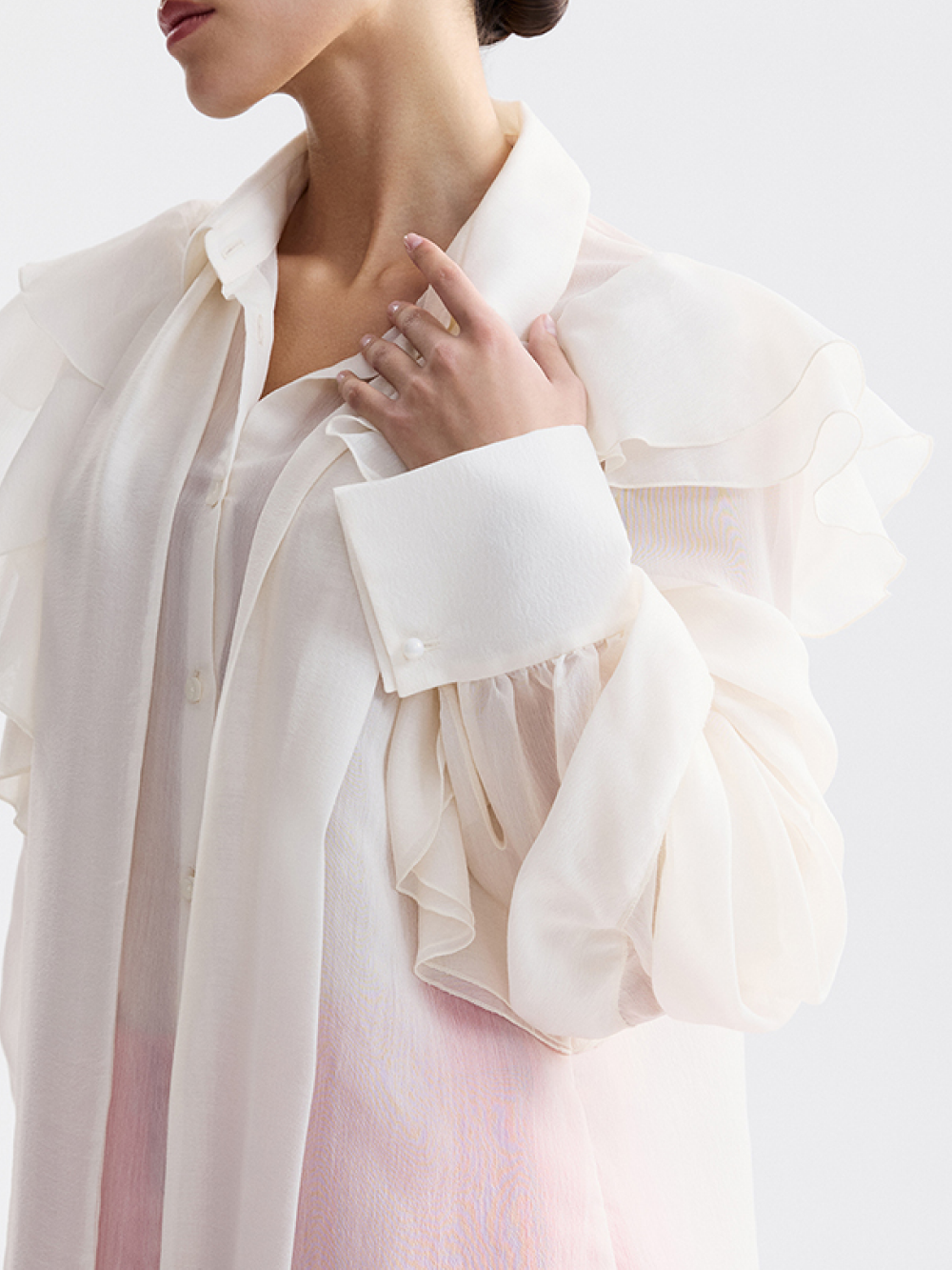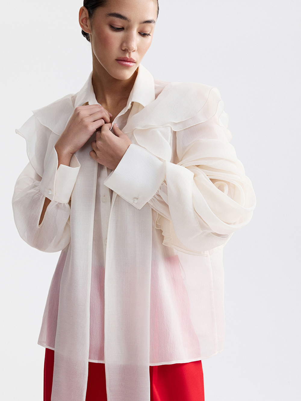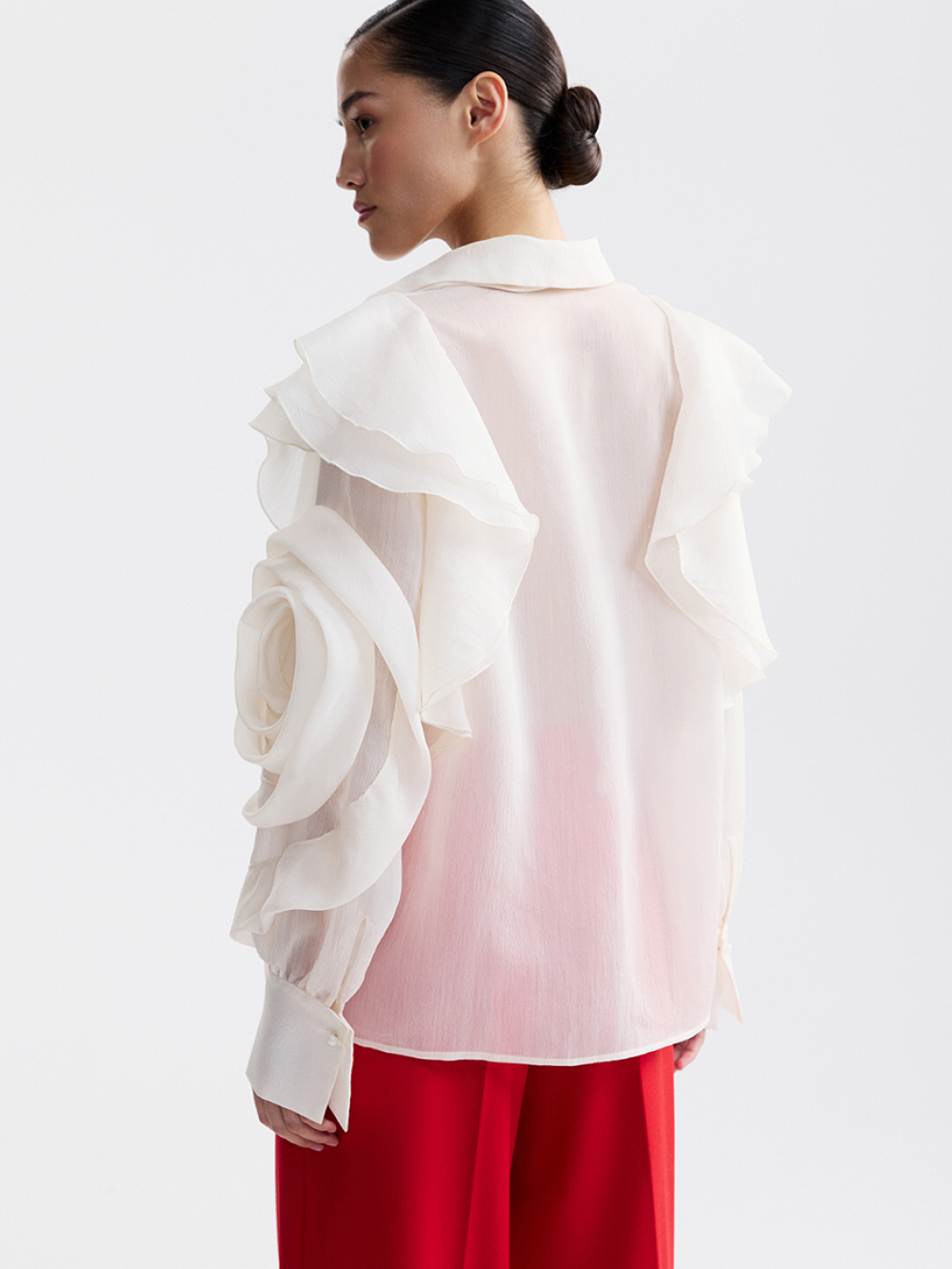 Эффектная блуза из фактурного шифона с 3D-цветком создана для особенных образов. Декоративные элементы, воланы на плечах и объёмная роза на рукаве отсылают к вечерней стилистике. Шарф можно завязать по вашему желанию или снять. В составе лёгкого шифона – 100% тенсел, натуральная дышащая ткань, комфортная, пластичная и приятная тактильно.