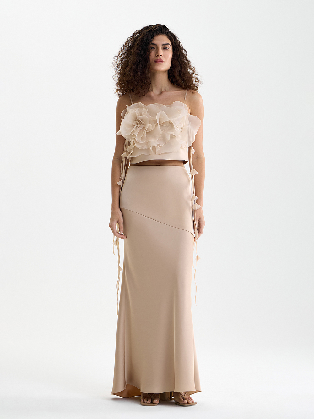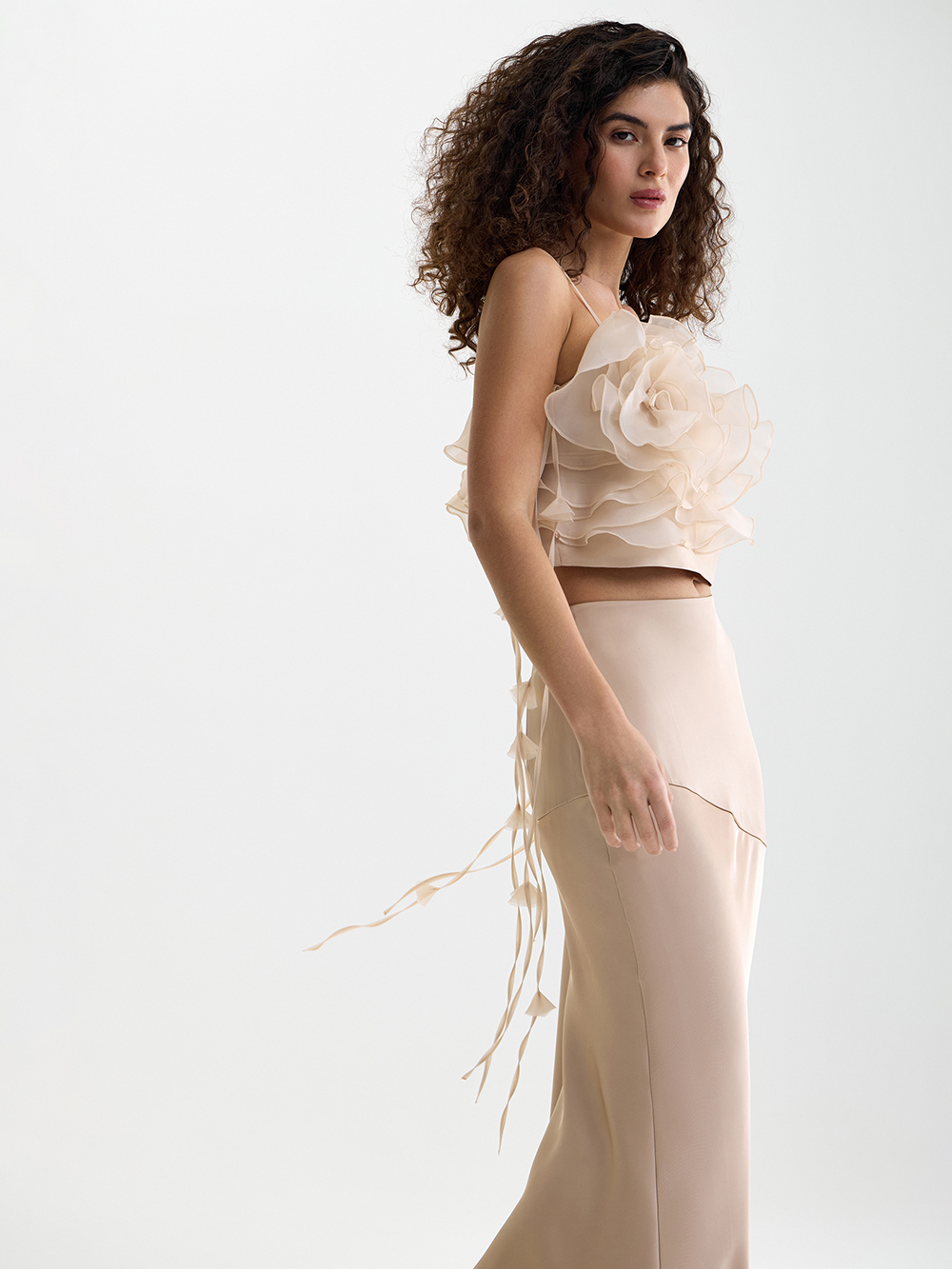 Изящный топ с камелией из органзы может послужить основой вечернего образа и украсить дневной – в сочетании с джинсами. В создании модели много сложной ручной работы, поэтому топ входит в серию limited. Топ выполнен из гладкой приятной ткани с шёлком в составе и дополнен декором из прозрачной органзы. Тонкие бретели можно регулировать по длине. Топ застёгивается на удобную молнию сбоку.
