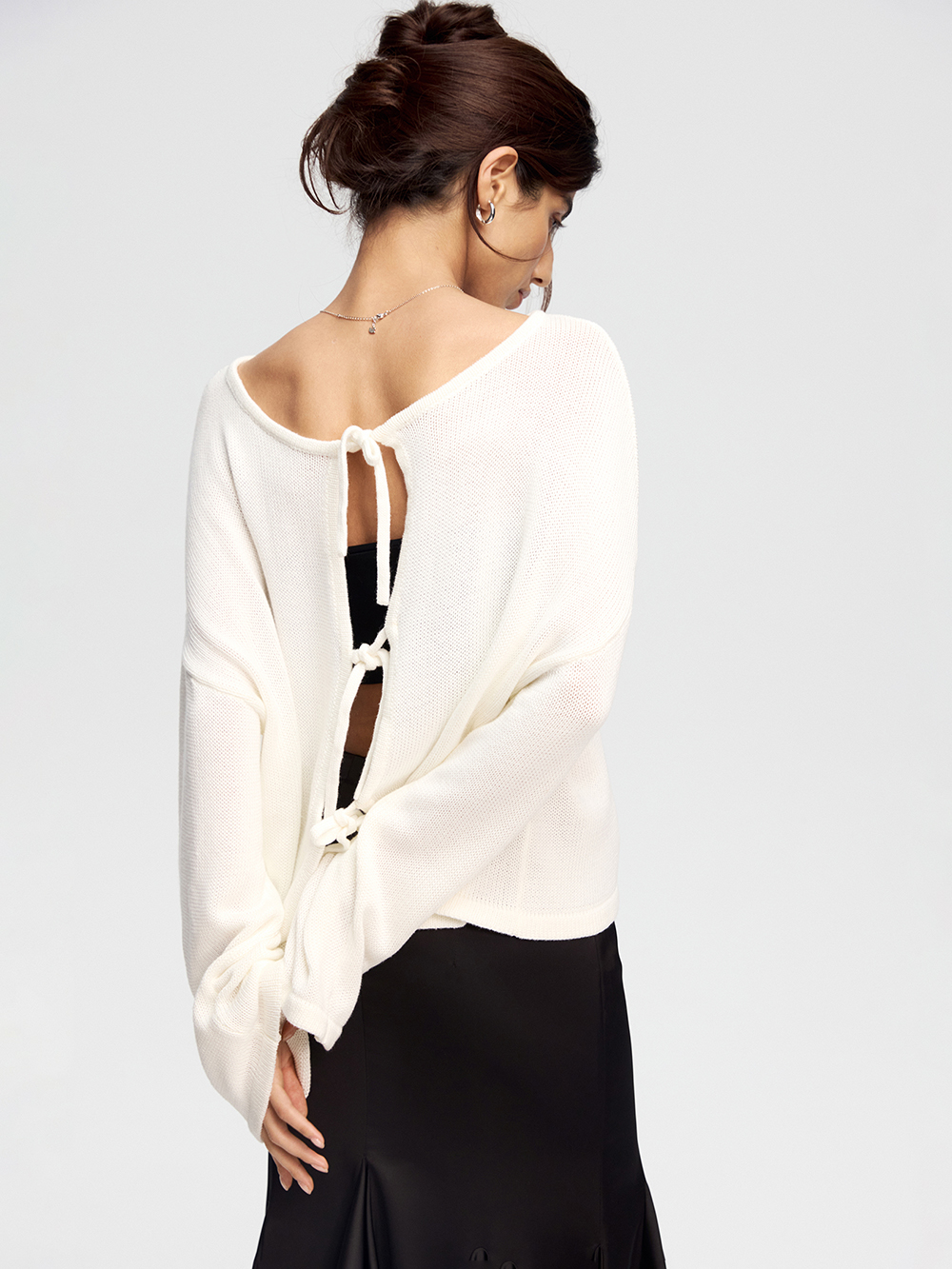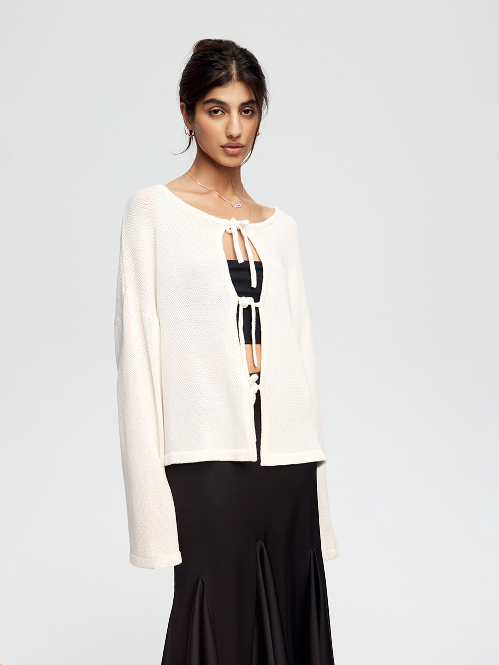 Свободный кардиган на завязках – идеальная пара для джинсов. Кардиган связан из мягкой комфортной пряжи на основе хлопка. Добавление акрила делает её легче и нежнее, а изделию помогает лучше держать форму. Спущенная линия плеча, удлинённый рукав с резинкой и воздушный объём придают кардигану красивую расслабленность.