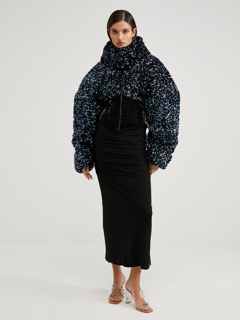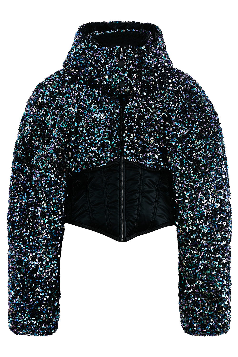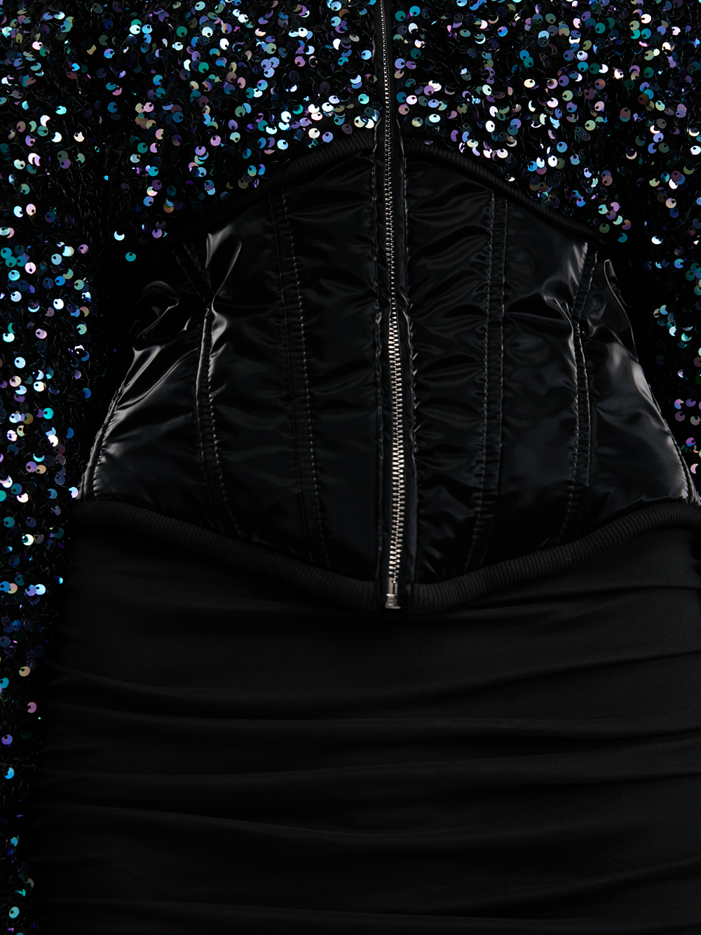 Пуховик с пайетками на корсетной основе