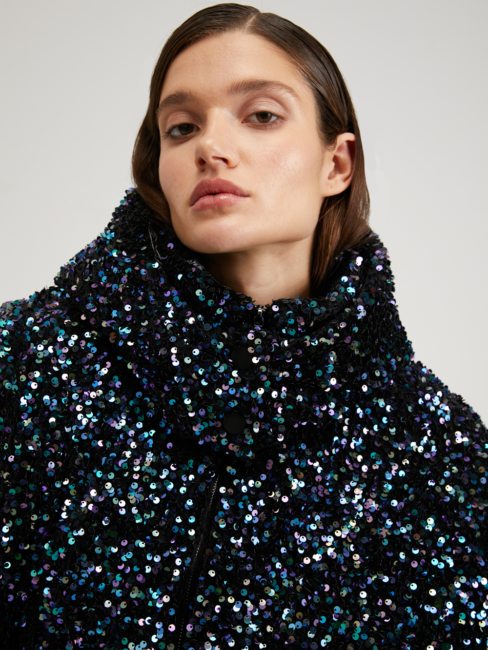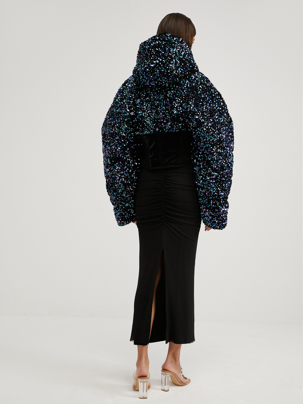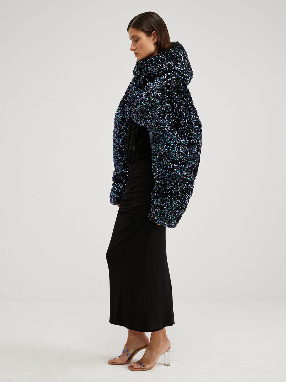 Пуховик с пайетками на корсетной основе