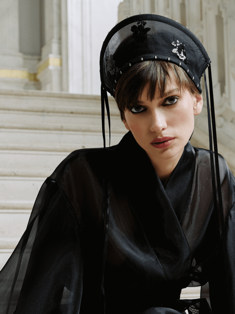 Кокошник, вошедший в новогоднюю коллекцию, – знаковый аксессуар, вдохновлённый традиционным русским головным убором. Кокошник выполнен вручную из мягкой сетки с вышивкой пайетками и украшен лентами и декором. Ткань создана специально по индивидуальным эскизам дизайнеров бренда: от рисунка до подбора пайеток и расшивки, выполненной по нашему заказу.