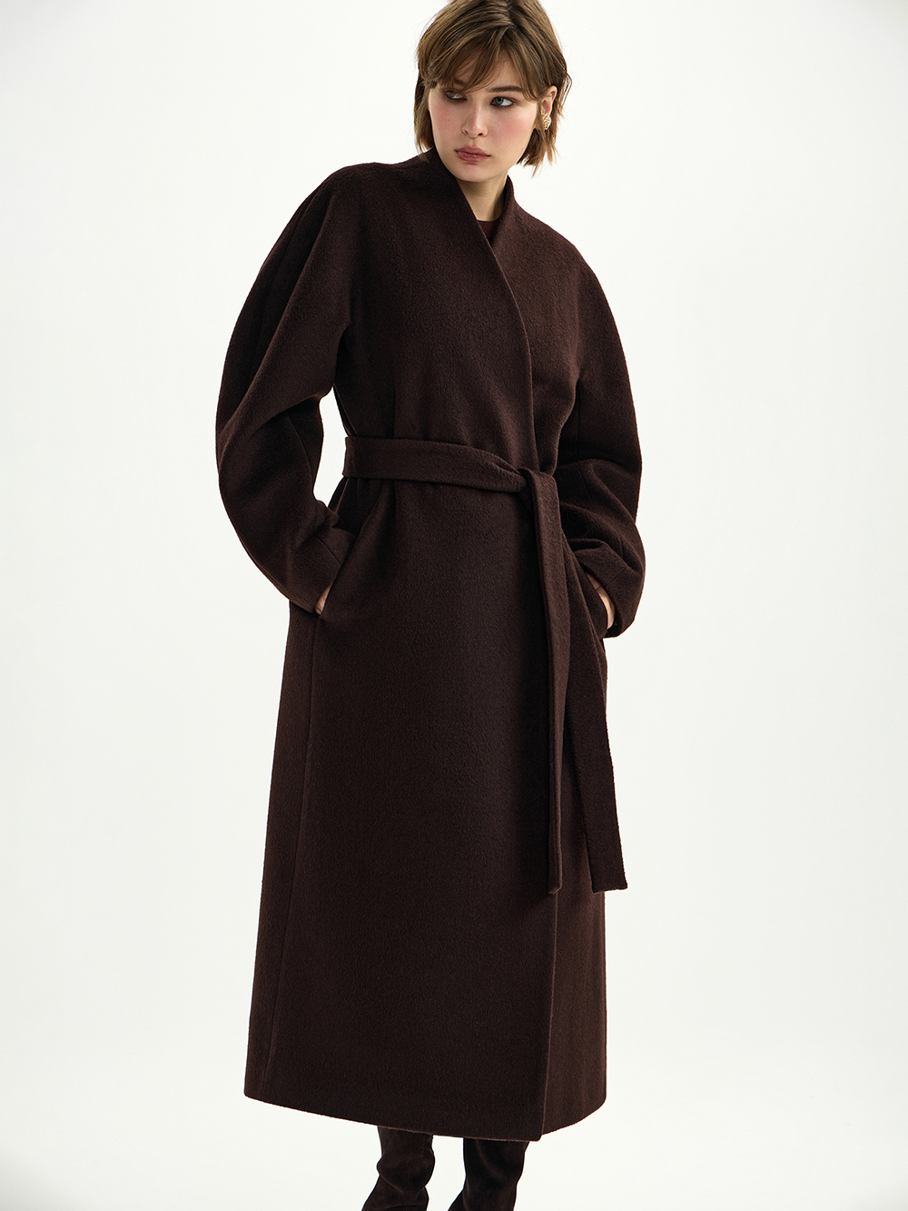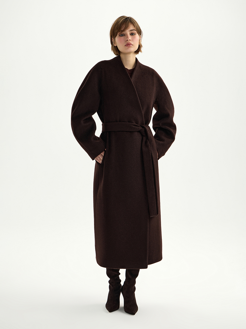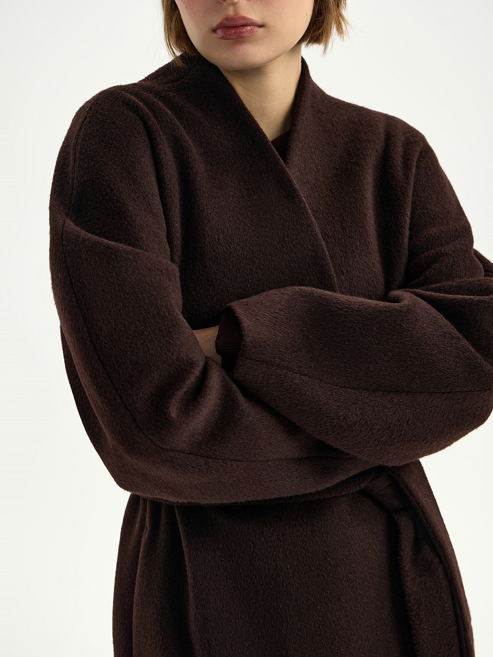 Элегантное пальто со скруглённым рукавом сшито из мягкой и тёплой ткани с высоким процентом шерсти в составе – согревающей, не колкой и очень комфортной. Свободный силуэт, мягкая линия плеча, V-образный вырез – лаконичное, актуальное пальто для любых образов. Застёгивается на две потайные кнопки, пояс в комплекте. Есть карманы. Дополнено подкладкой на основе вискозы.