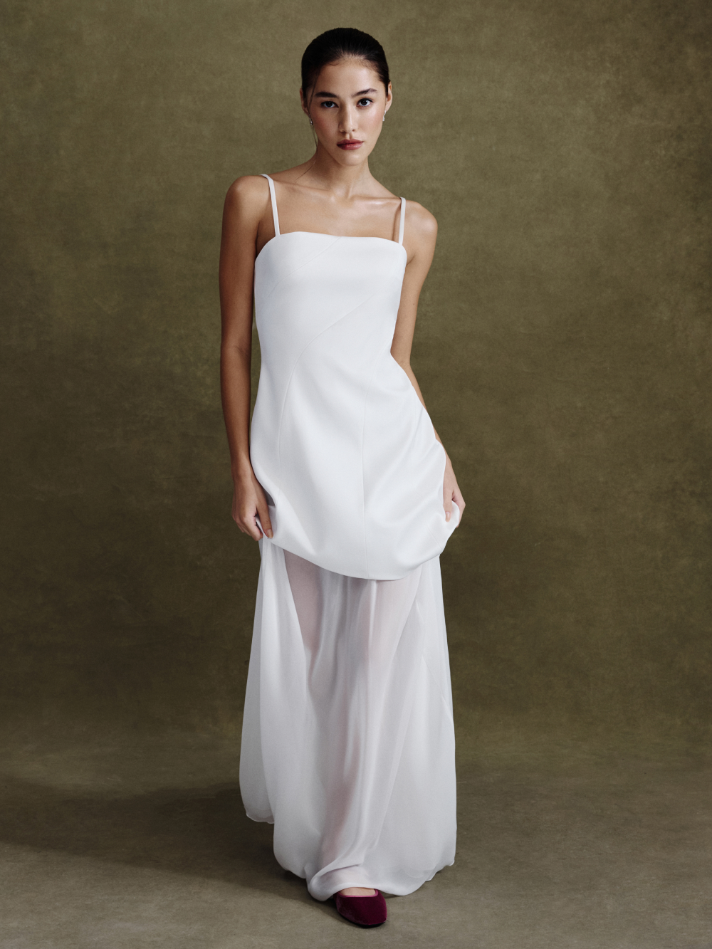 Нижняя юбка макси – из невесомого, воздушного шифона, придаёт образу визуальную лёгкость. Юбка с удобной посадкой на комфортной резинке.