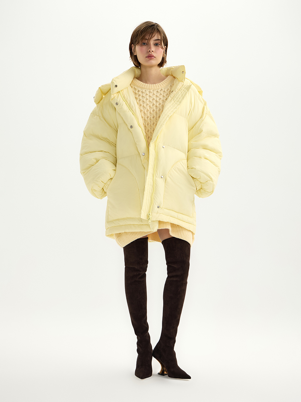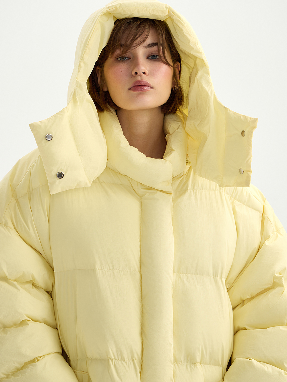 Объёмный пуховик с капюшоном – очень тёплый, уютный и комфортный. Актуальный О-силуэт: стильная дутая форма со “стекающими” плечами и объёмными рукавами. Пуховик выполнен из ткани с водоотталкивающей пропиткой, которой не страшны дождь и снег. Особенность модели – удобный портплед для хранения и перевозки, вшитый внутри пуховика.