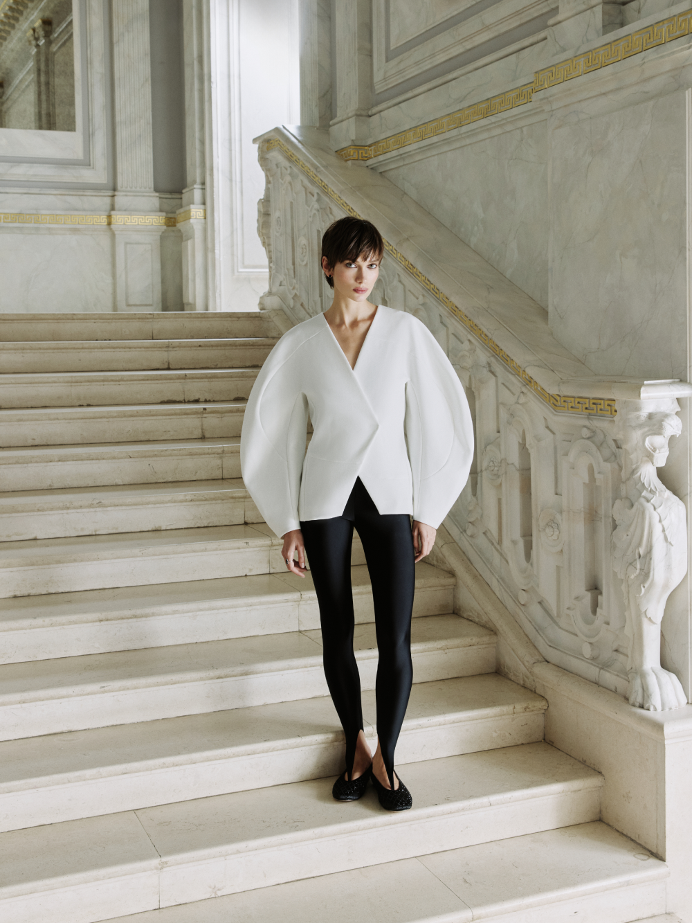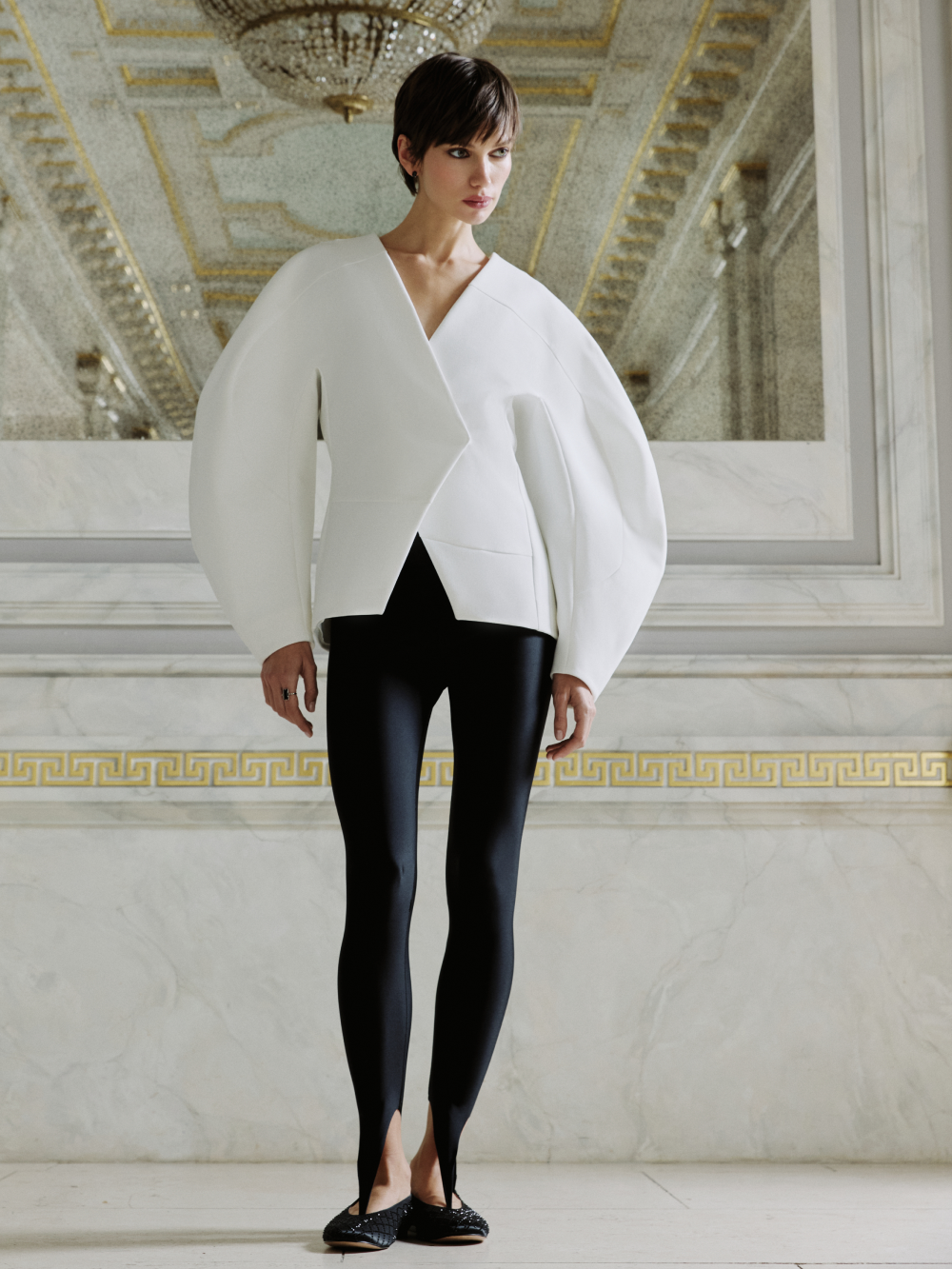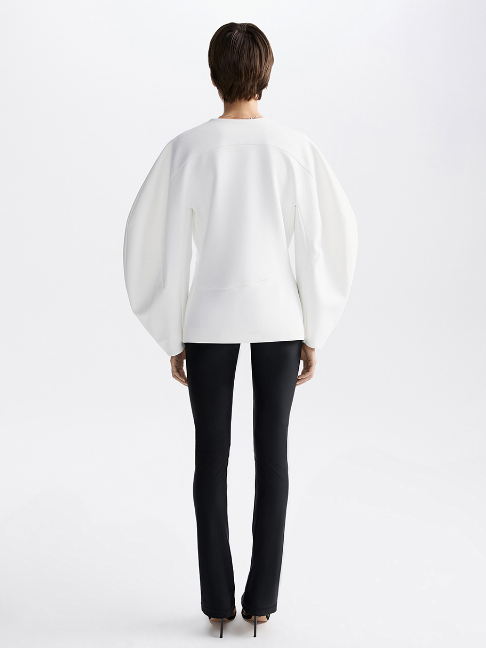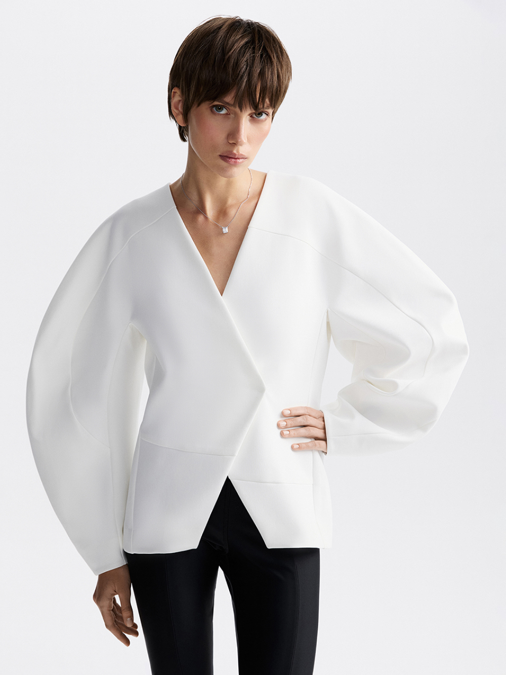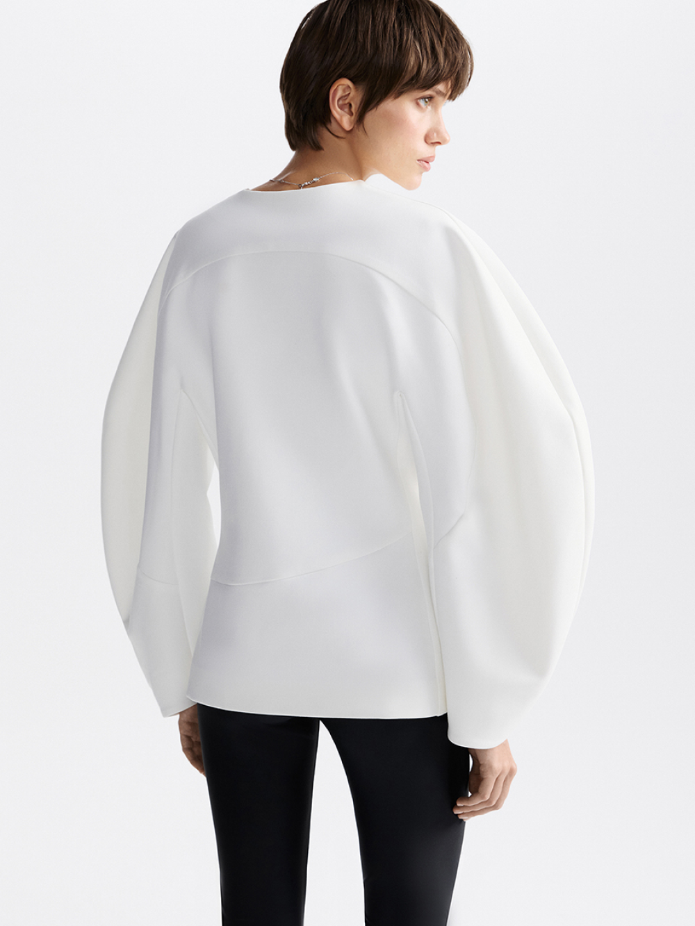 Эффектный жакет с акцентом на талии, скруглёнными плечами и выразительными рукавами вошёл в лимитированную вечернюю коллекцию. Для создания красивой формы мы выполнили сложный крой с рельефами и фигурными подрезами и выбрали плотную костюмную ткань, чтобы поддержать округлый силуэт. Гармония пропорций: красивые геометричные линии сочетаются с мягкостью линий силуэта. Есть подкладка с шёлком в составе. Жакет застёгивается на две потайные кнопки.