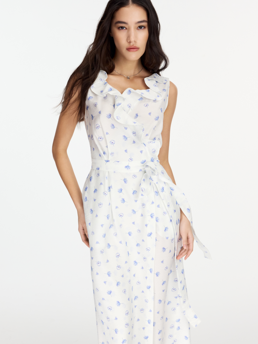 Платье на запах с V-образным вырезом, украшенным воланом – готовый женственный образ. У платья полуприлегающий силуэт и универсальная длина миди. Платье очень комфортное для лета: сшито из нежной вискозной ткани и дополнено мягкой подкладкой из тонкого хлопка. Запах надёжно фиксируется поясом из основной ткани. Есть карманы.