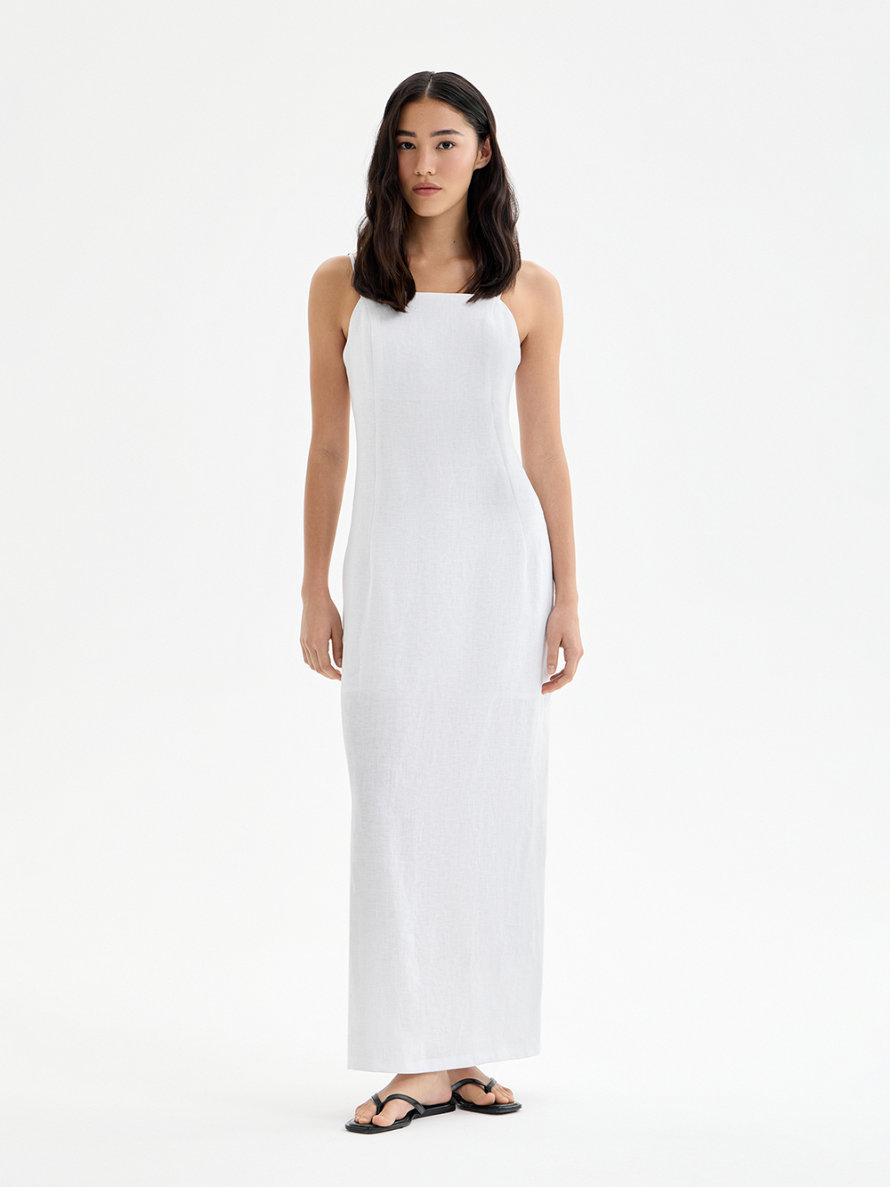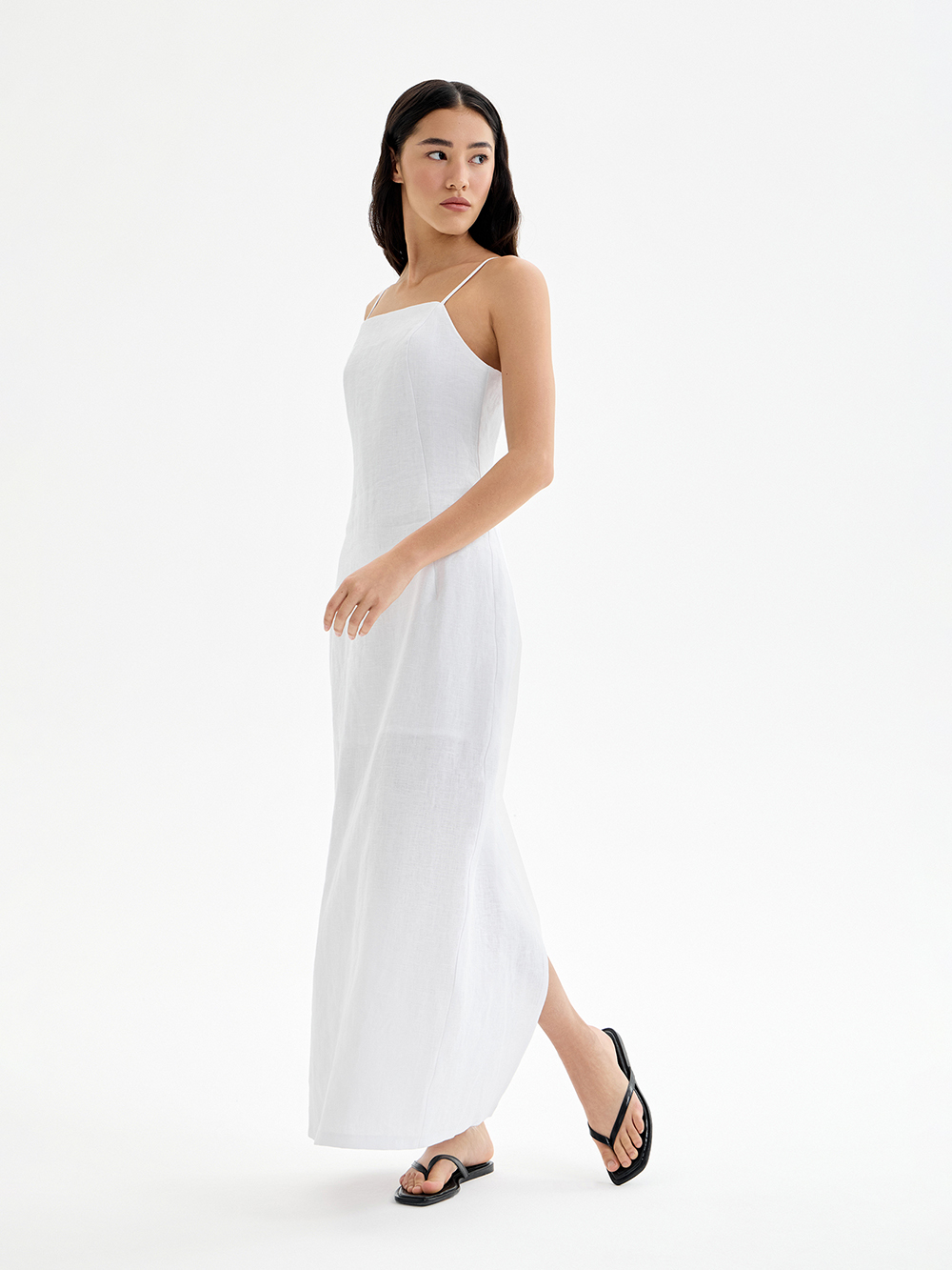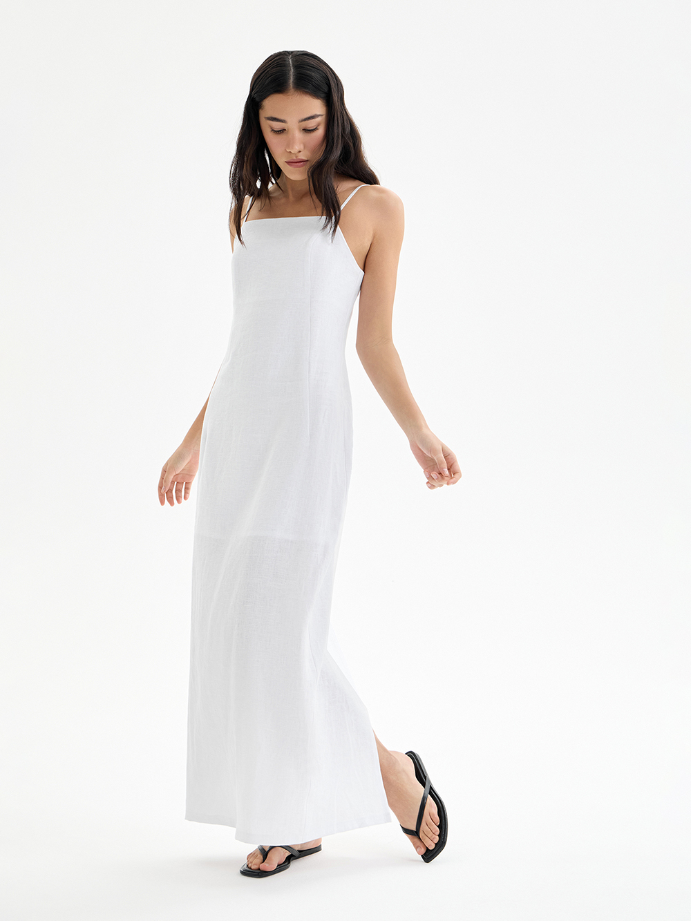 Платье-комбинация в длине макси из 100% льна – идеальный женственный образ для лета в городе и на отдыхе. Лёгкая, не слишком плотная, комфортная и дышащая ткань дарит ощущение приятной прохлады в жаркую погоду. Есть тонкая подкладка из мягкого хлопка. Платье застёгивается на молнию сзади. Бретели можно регулировать по длине.