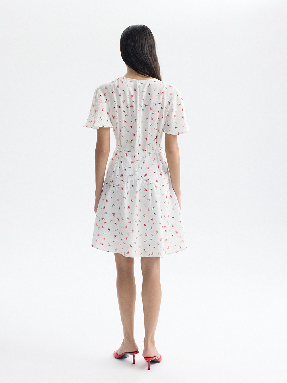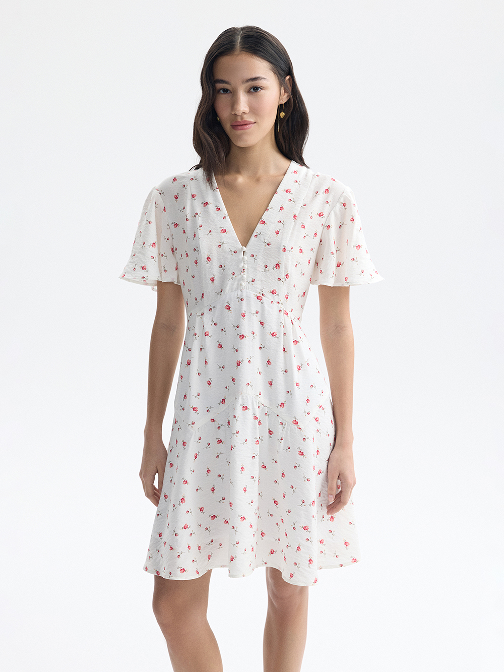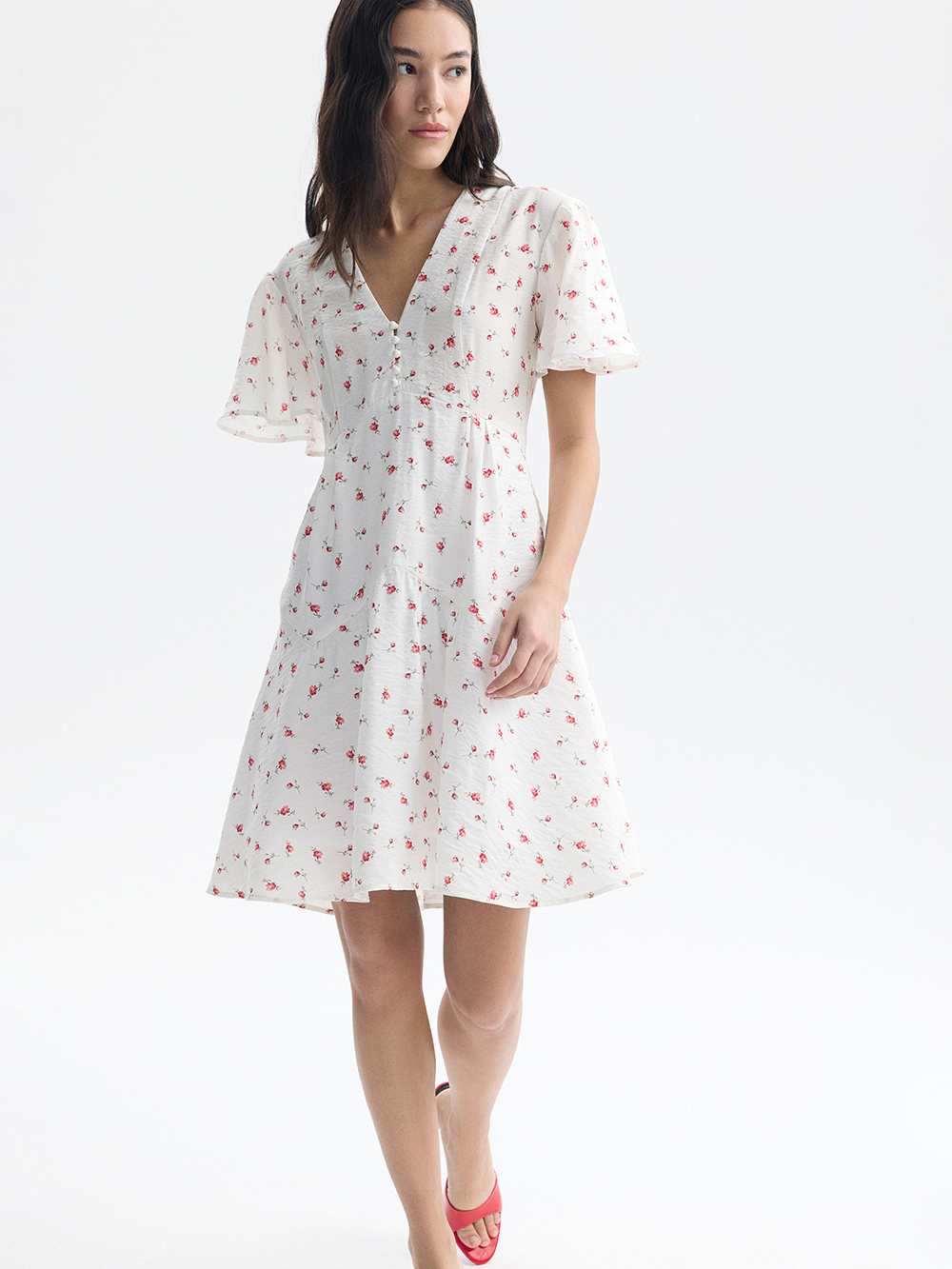 Платье мини с V-образным вырезом идеально подходит для лета и отпуска. Воздушная динамичная модель из лёгкой приятной вискозы, в которой комфортно даже в жаркий день. Рукава по форме перекликаются с конической юбкой, этот приём делает талию визуально тоньше. Спереди – пуговицы-бусины с воздушными петлями. Платье застёгивается на молнию сзади. Есть подкладка из хлопка.