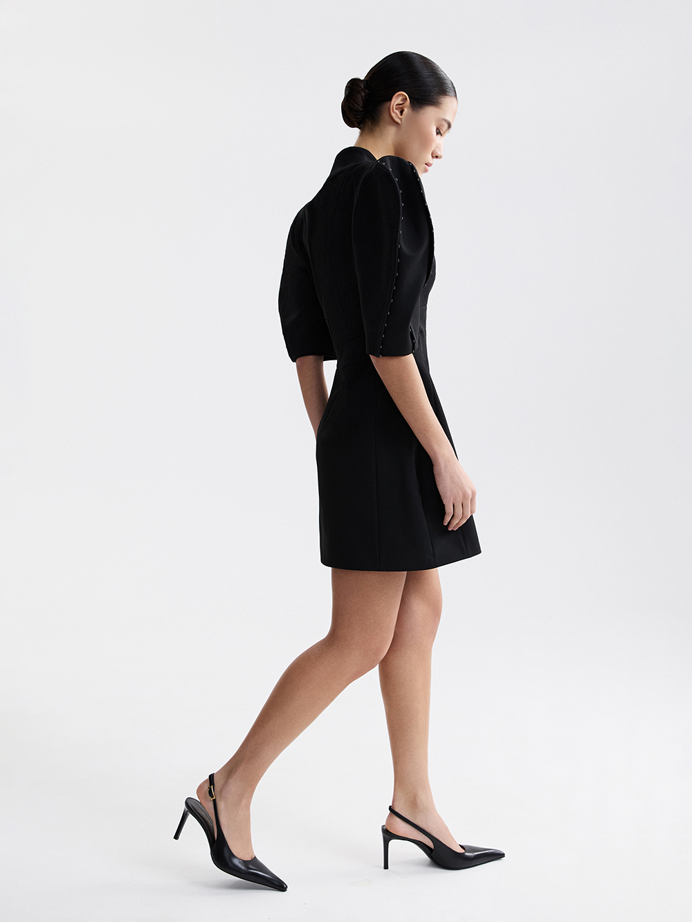 На модели платье размера S