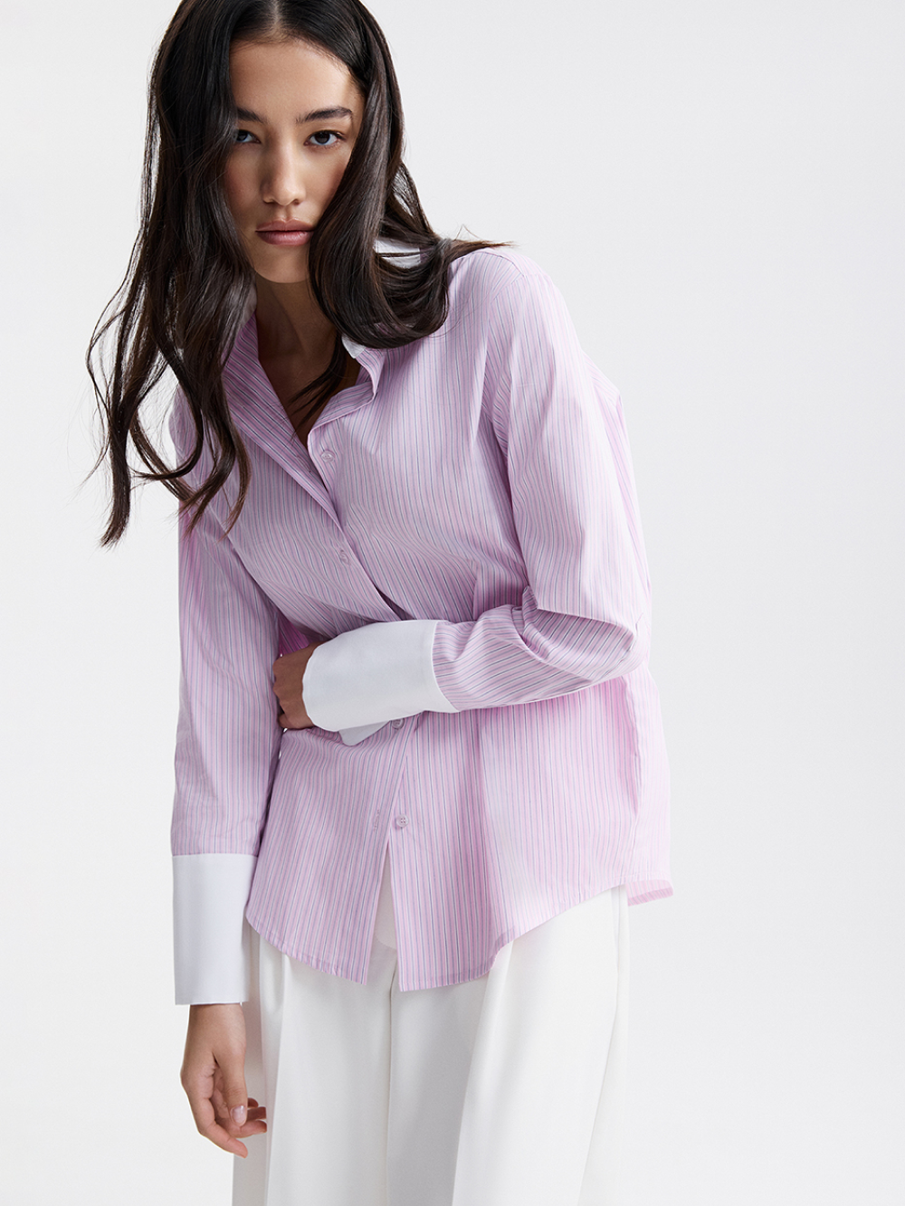 Рубашка из хлопка – базовая модель, лежащая в основе делового и повседневного гардероба. Мы сделали классическую сорочку акцентной за счёт контрастного воротника и манжетов. У рубашки актуальная посадка, дающая свободу, но аккуратная, без лишнего объёма. Рубашка выполнена из приятной к телу хлопковой ткани с долей искусственных волокон, чтобы ткань меньше мялась, не теряла форму и за ней было проще ухаживать.