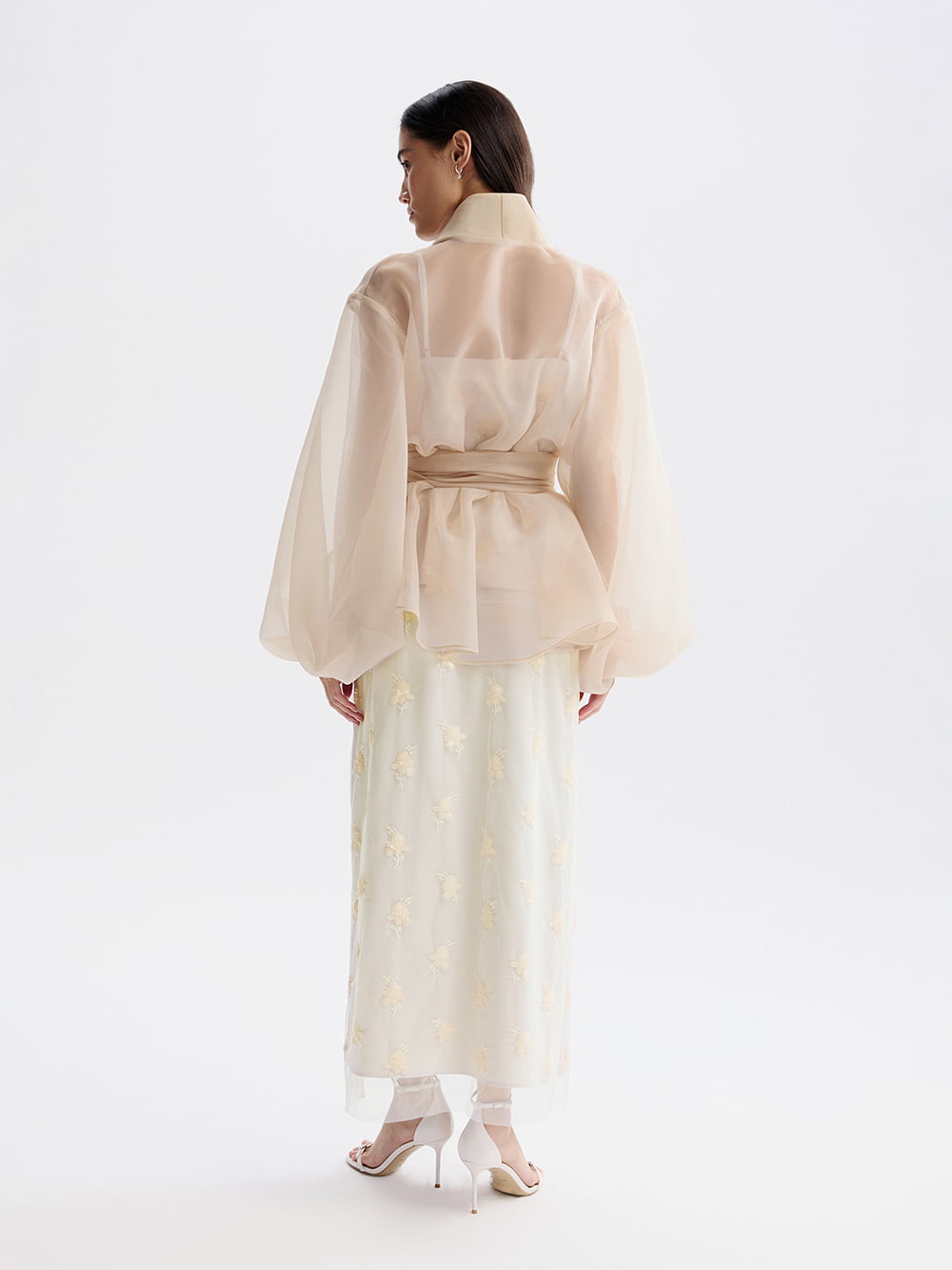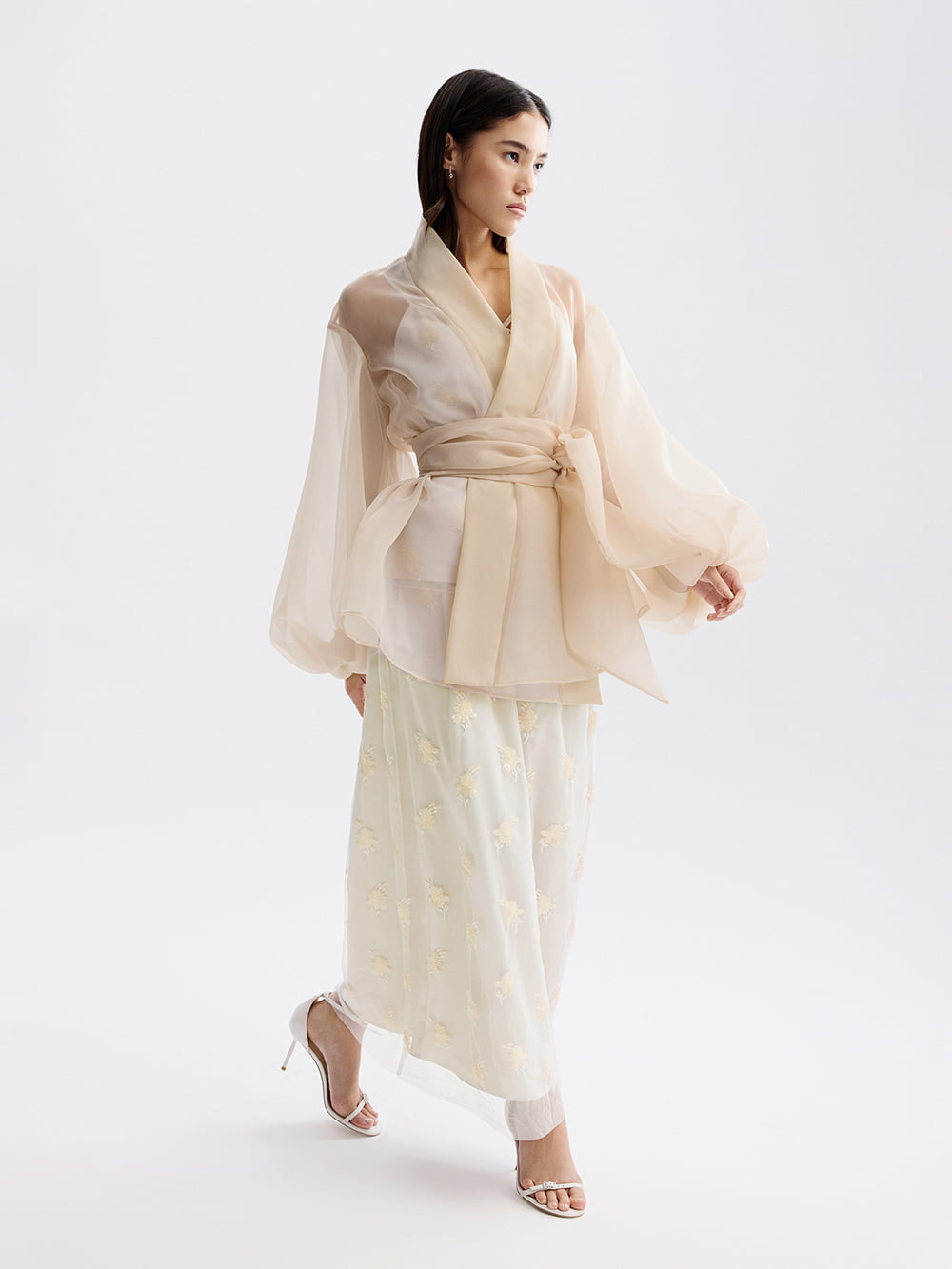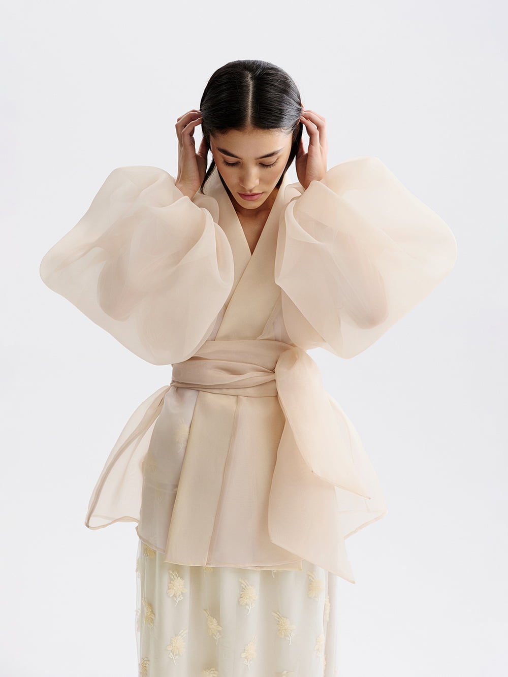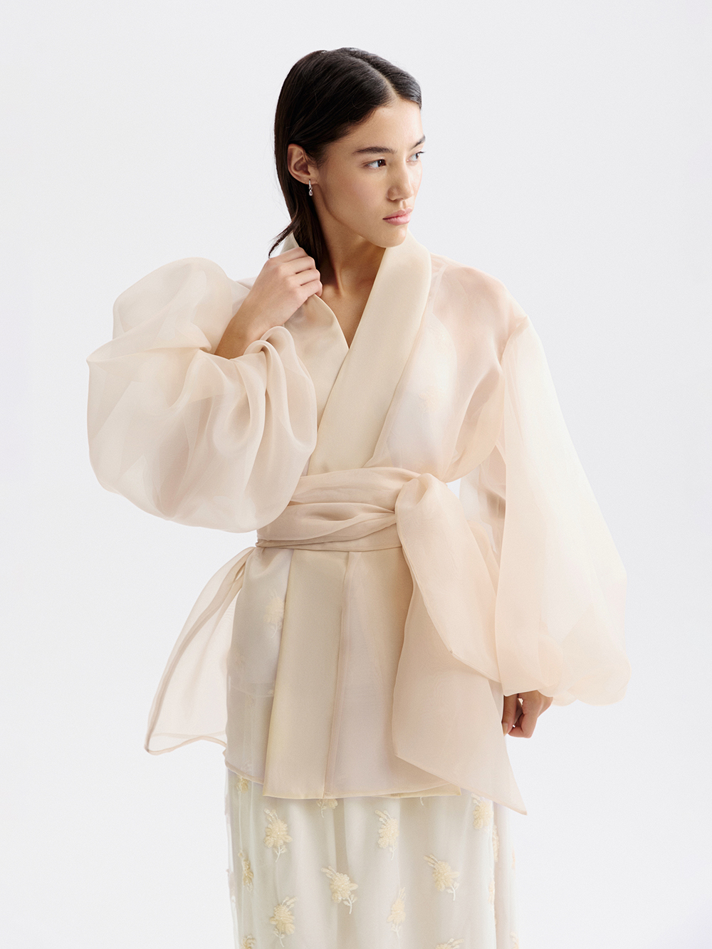 Туника из органзы – знаковая модель и наш бестселлер. Выполнена из матовой органзы, которая великолепна в драпировке и приятна к телу. Выразительные рукава зафиксированы на внутреннюю мягкую сетку и сохраняют форму. Внутренние швы аккуратно закрыты. В комплект входит широкий пояс-лента из основной ткани. Туника идеальна в дуэте с топами в бельевом стиле.