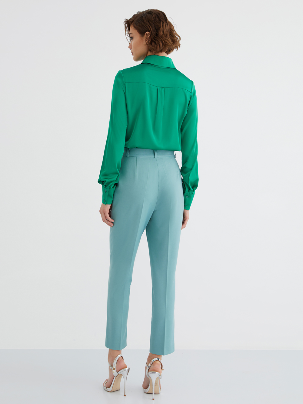 Базовые брюки для делового и повседневного образа. Классическая модель идеально сочетается как с жакетом, так и трикотажем. Брюки с высокой посадкой, пояс дополнен шлёвками. Есть карманы. Застёгиваются на потайной крючок и молнию. Брюки выполнены из поливискозы высокого качества. Эта ткань приятна на ощупь, хорошо держит форму и почти не мнётся.