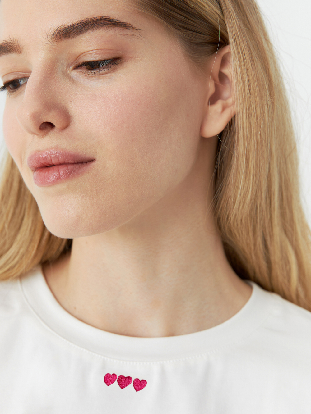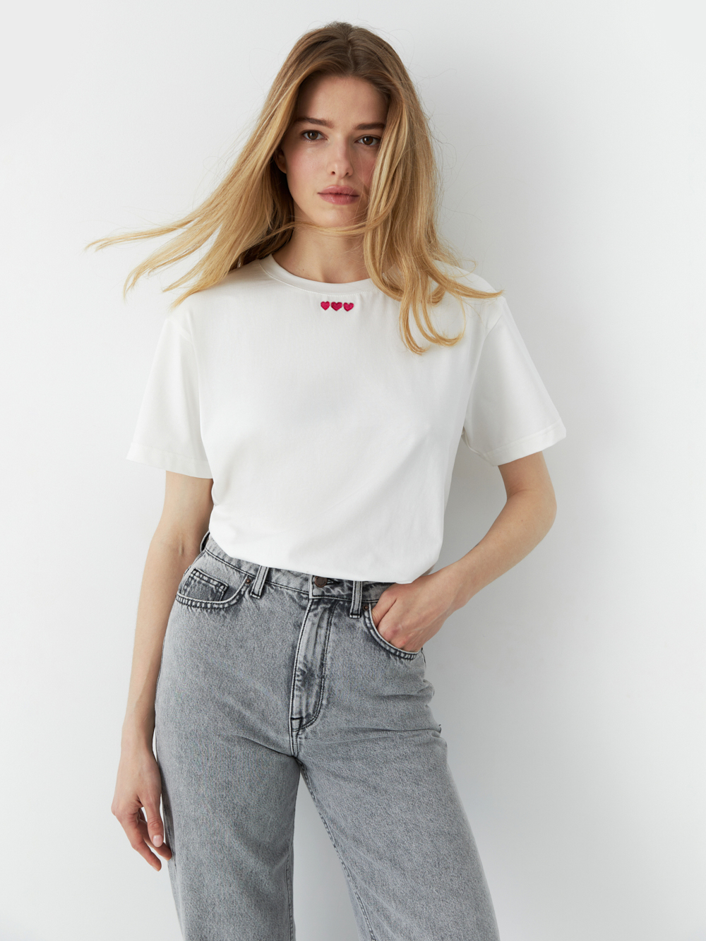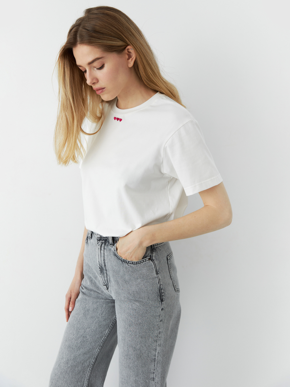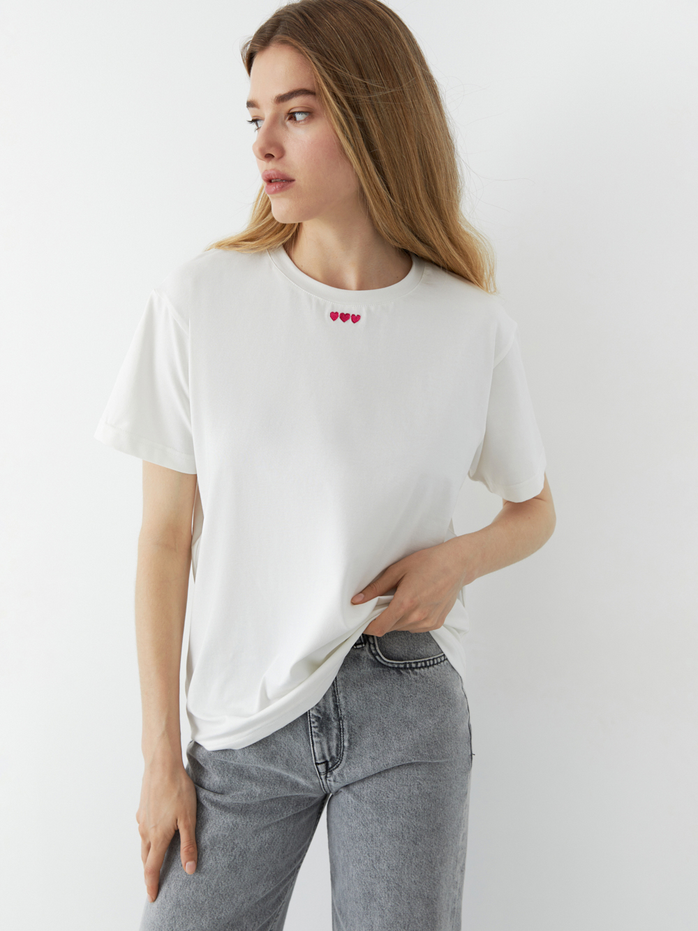 Базовая футболка с вышивкой. Универсальная модель со свободной посадкой для повседневных образов. Выполнена из мягкого, приятного к телу хлопка с добавлением эластана, чтобы ткань не теряла форму, меньше мялась и за ней было легко ухаживать.