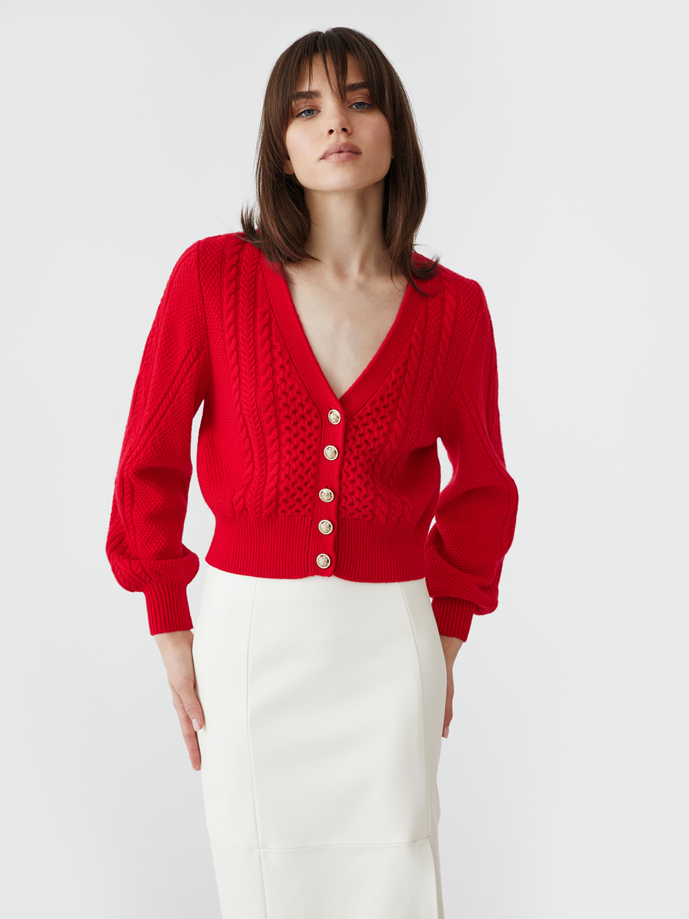 Вязаный кардиган с объёмным ажурным узором. Выполнен из согревающей, мягкой и неколкой пряжи с тёплой ангорой, нежной вискозой и искусственной нитью для долговечности, сохранения формы и цвета. Кардиган застёгивается на металлические пуговицы. Резинки на манжетах фиксируют рукава на запястьях, придавая рукаву красивый объём. Предлагаем сочетать актуальную модель как с классическими юбками и брюками, так и с денимом и экокожей.