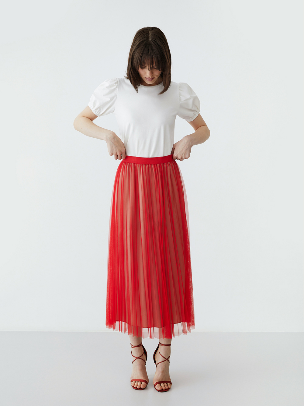 Юбка в длине миди состоит из двух слоёв: гофрированной сетки и нижней юбки с шёлком в составе. Воздушная и нежная модель, лёгкость которой подчёркнута контрастом яркой прозрачной сетки и нюдового шёлка. Юбка на комфортной широкой резинке. Юбку можно стилизовать как для вечерних выходов, так и для повседневных луков.