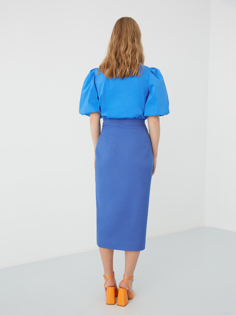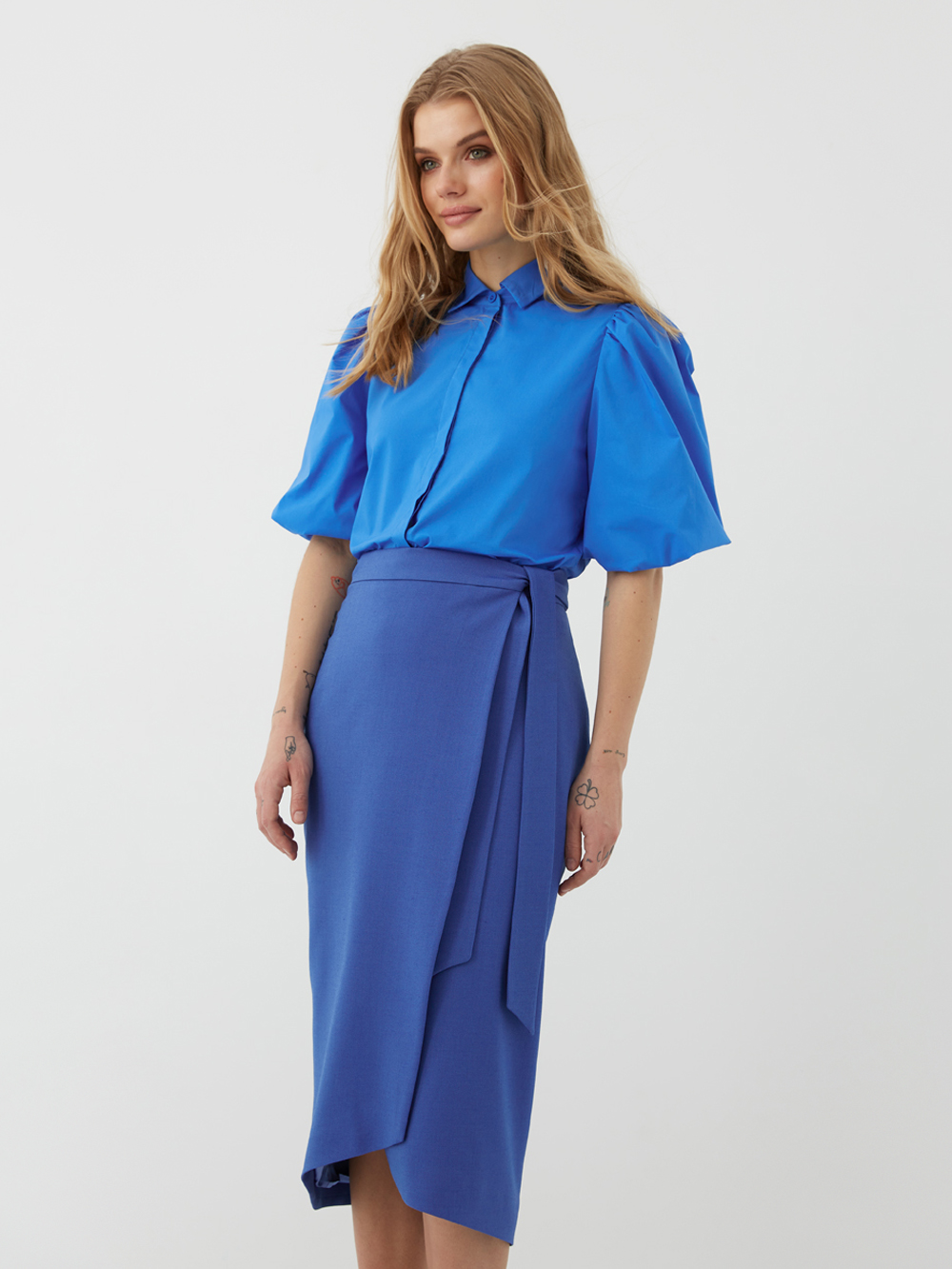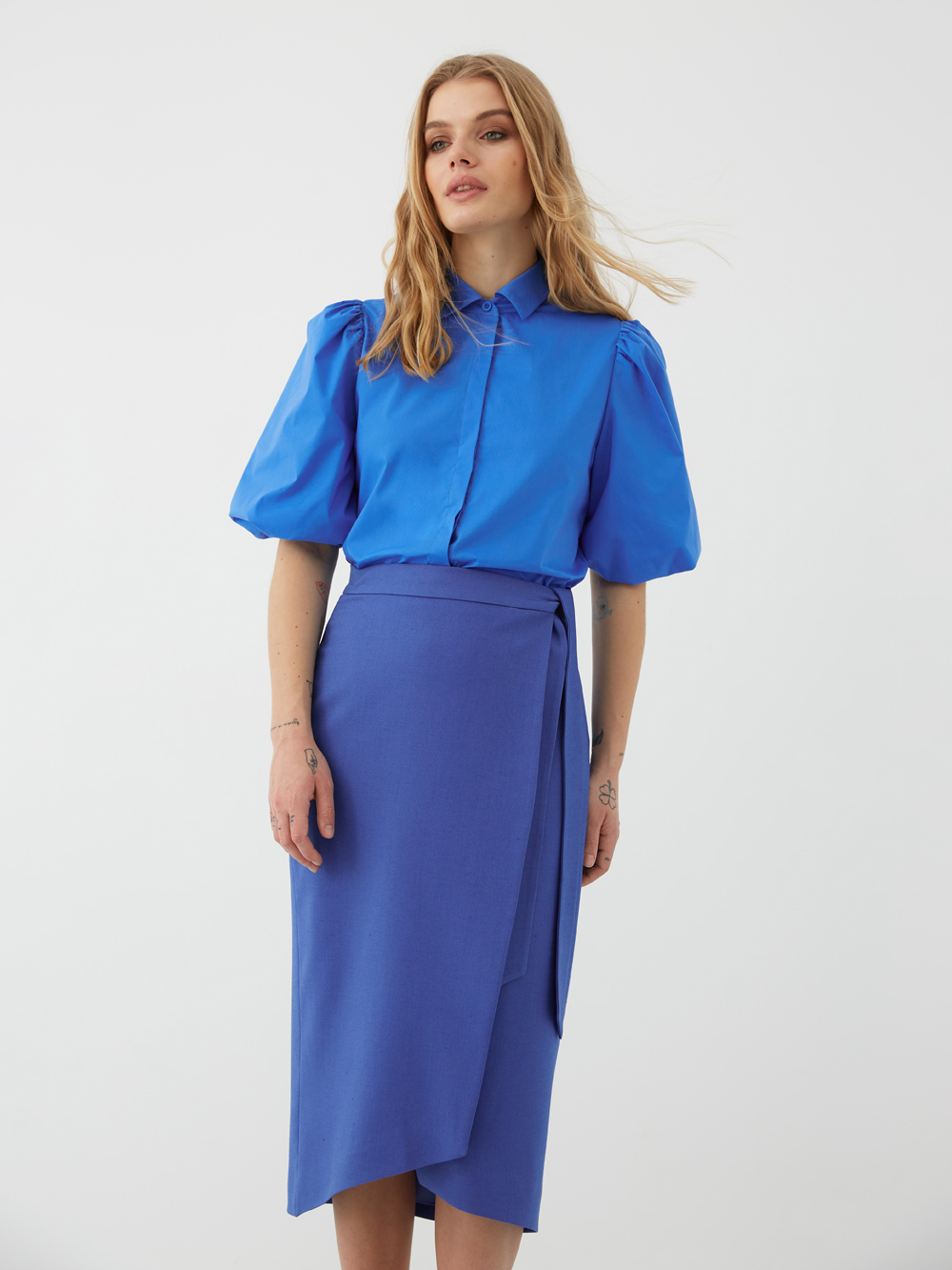 Юбка на запах длины миди. Главное преимущество этой модели - она визуально вытягивает и создаёт стройный женственный силуэт. В зависимости от стилизации юбка подойдёт как для свободных повседневных, так и для формальных образов. Фиксируется на талии поясом и внутренней пуговицей. Юбка выполнена из костюмной поливискозы высокого качества и дополнена подкладкой с шёлком.