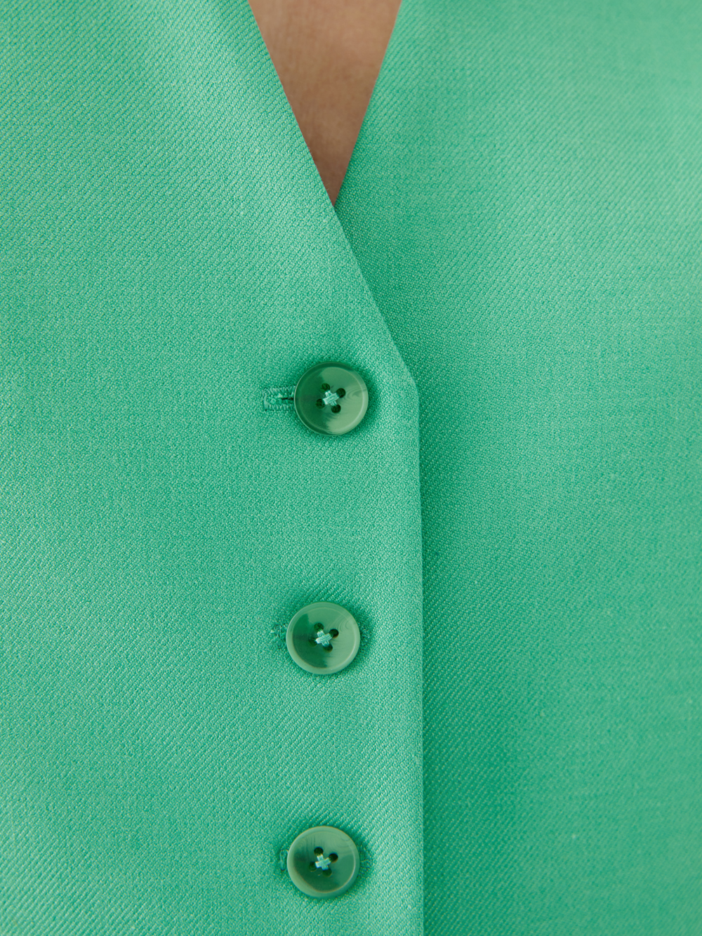 Жилет на пуговицах. Элегантная модель с полуприлегающим силуэтом отлично смотрится и сольно, и в сочетании с жакетом. Жилет выполнен из поливискозы высокого качества, а благодаря подкладке с шёлком его можно носить на голое тело.