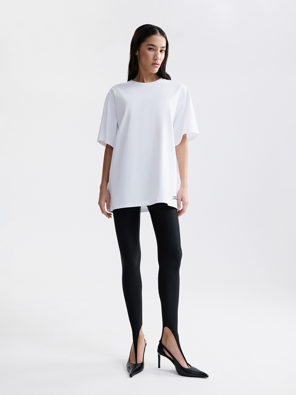 Футболка украшена уникальной вышивкой, созданной дизайнерами бренда. Для выполнения сложного рисунка вышивальной машине требуется пять часов. Мы выбрали для футболки ткань из плотного хлопка, гладкого и пластичного. Свободная модель со спущенной линией плеча отличается расслабленной, при этом аккуратной посадкой.