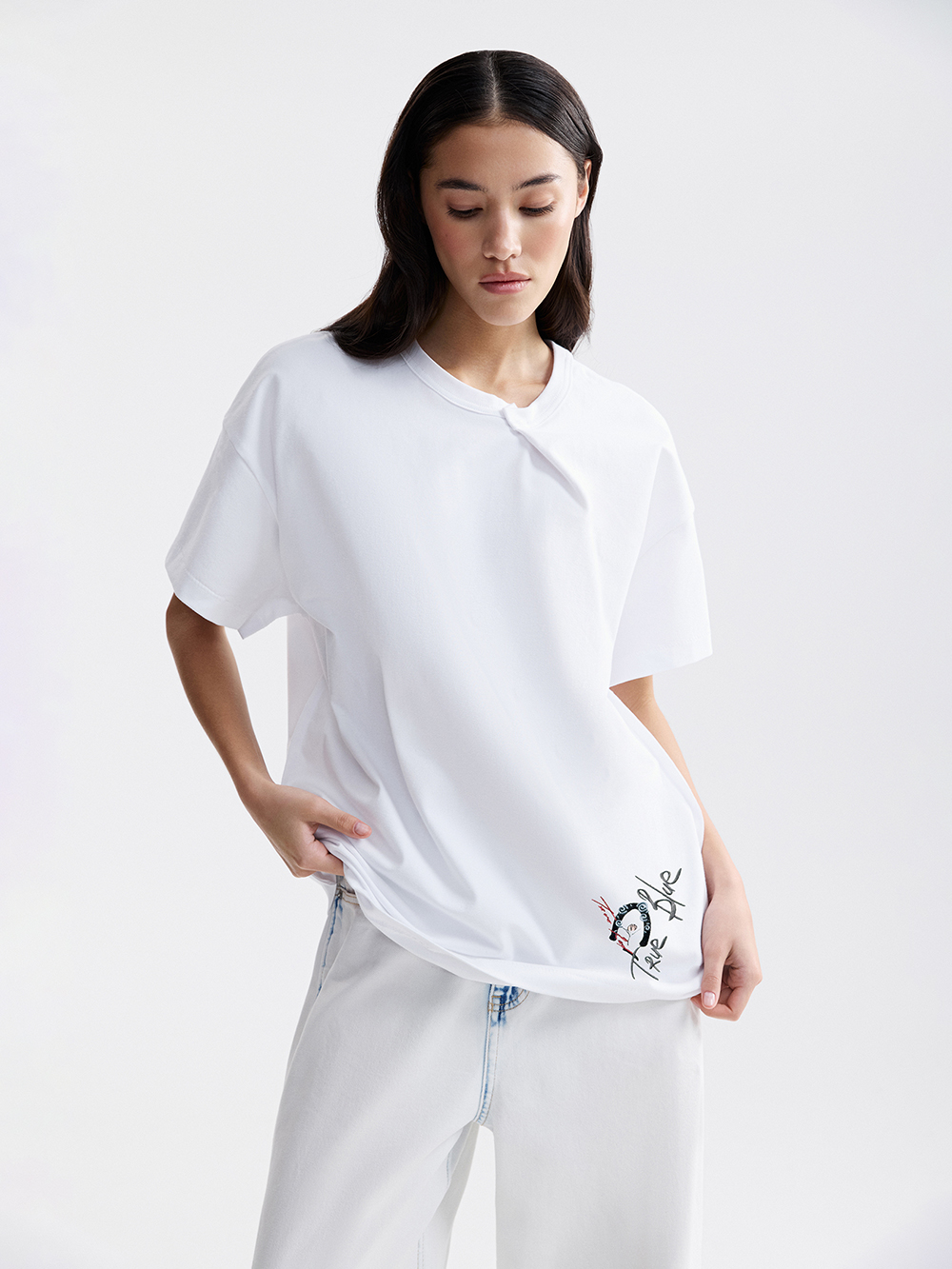 Футболка средней длины, в меру свободная, но не объёмная – её легко включить в образы на каждый день. Мы выбрали комфортный хлопок с небольшой долей эластана, чтобы ткань сохраняла упругость и форму.