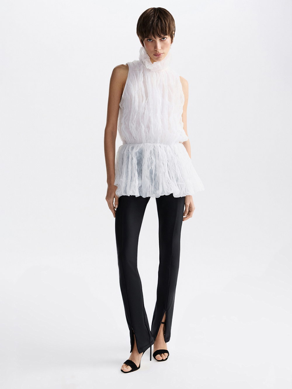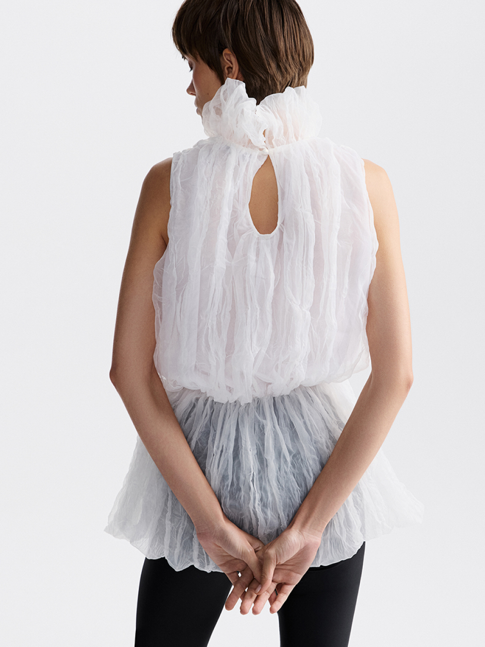 Воздушный топ с баской создан для лимитированной вечерней коллекции – он сделает образ нарядным и заметным без усилий. Топ выполнен из шифона с эффектом гофре. Визуальную лёгкость полупрозрачной ткани подчёркивают баска и мягкая стойка воротника. Топ очень комфортный: на поясе удобная резинка, есть приятная тактильно подкладка. Топ застёгивается на жемчужную пуговицу на спинке.