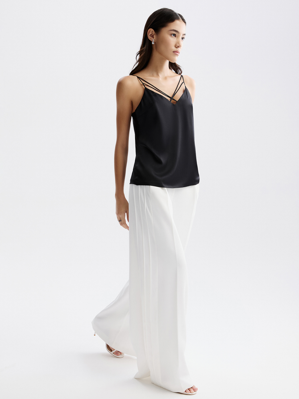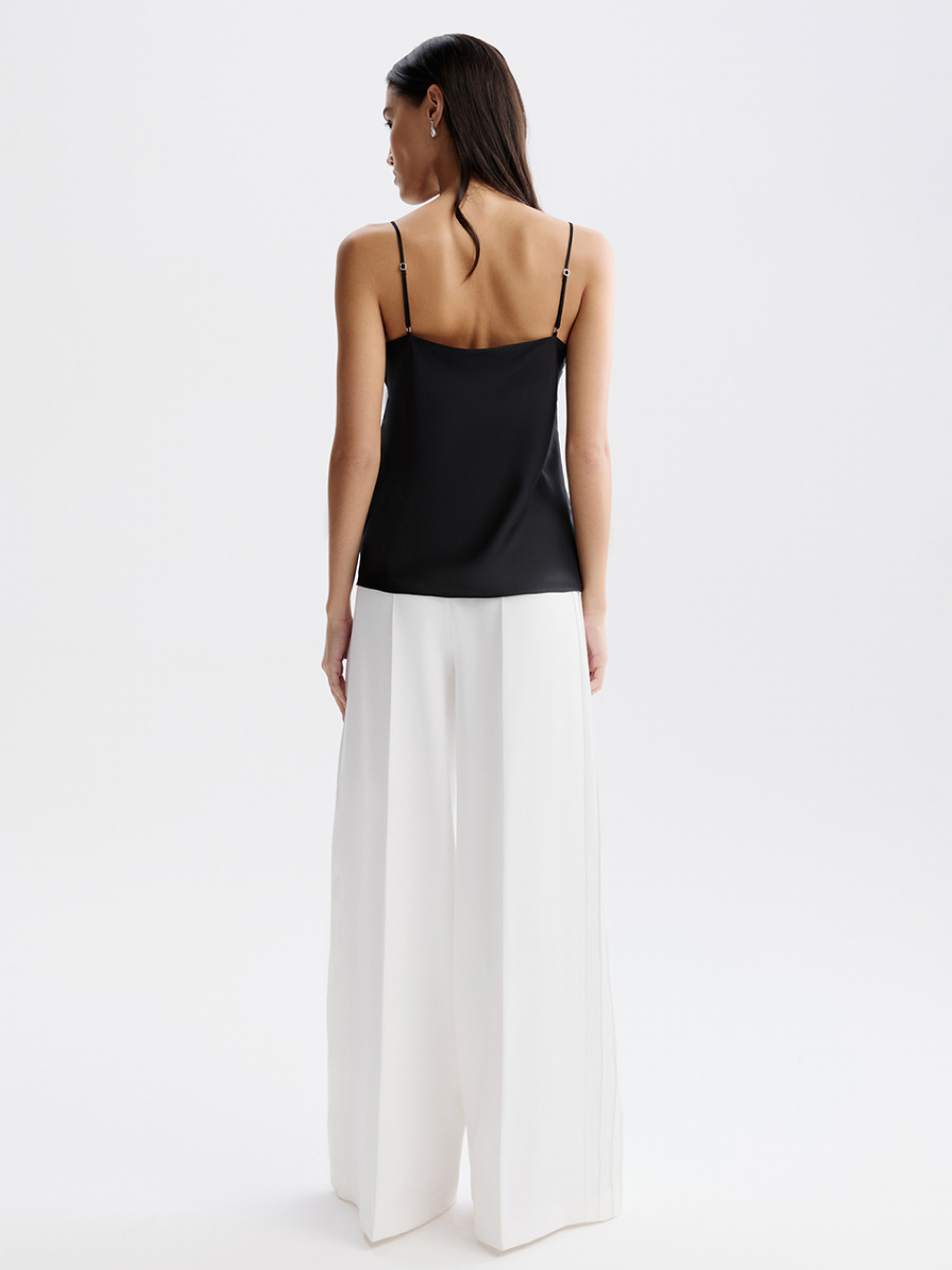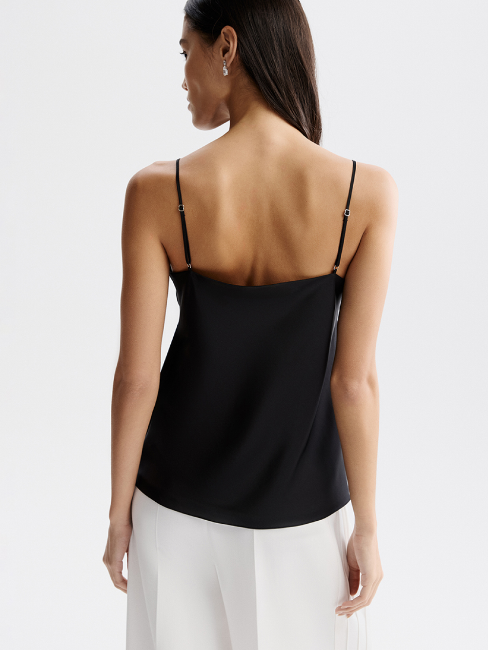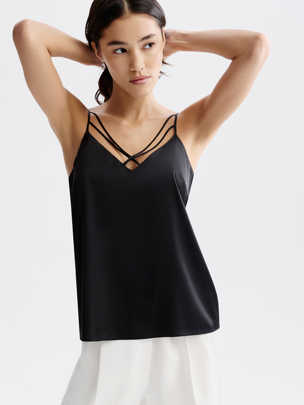Топ на тонких бретелях с изящной зоной декольте создан для дневного и вечернего гардероба. Выполнен из гладкой струящейся ткани с шёлком в составе. Она приятна к коже, мало мнётся, долговечна и не требует сложного ухода. Топ двойной, поэтому не просвечивается и отличается красивой посадкой.