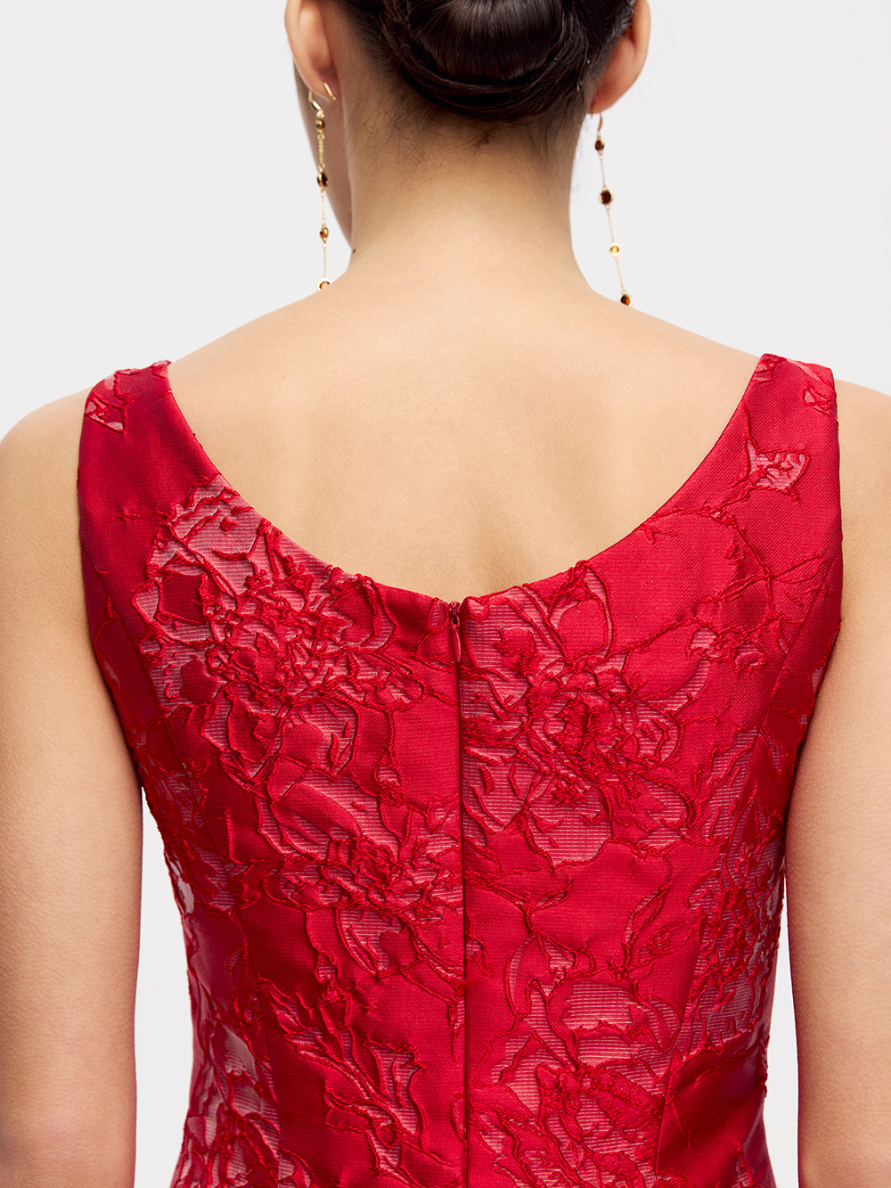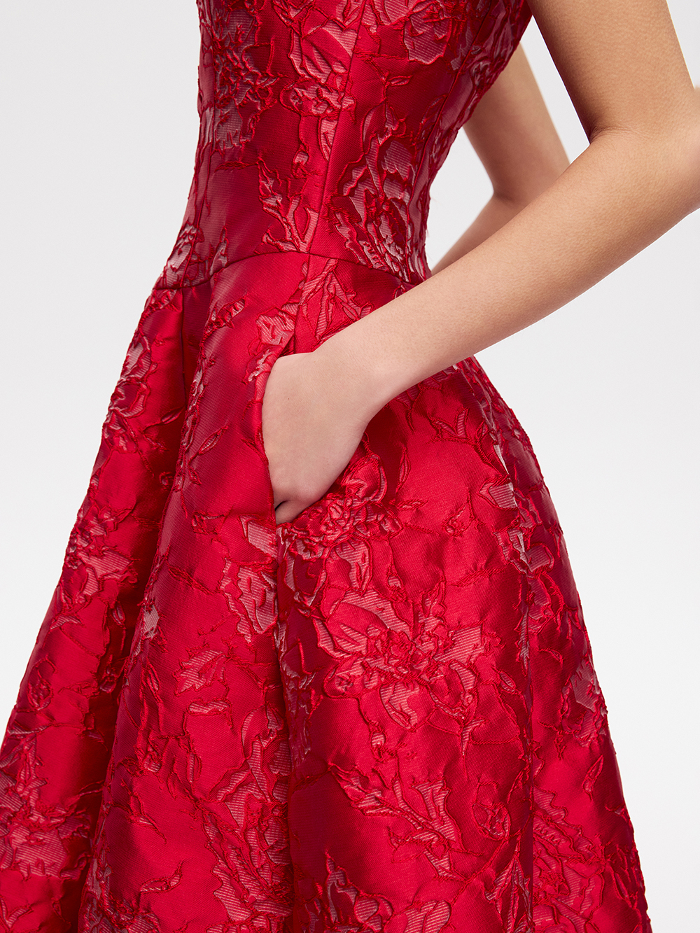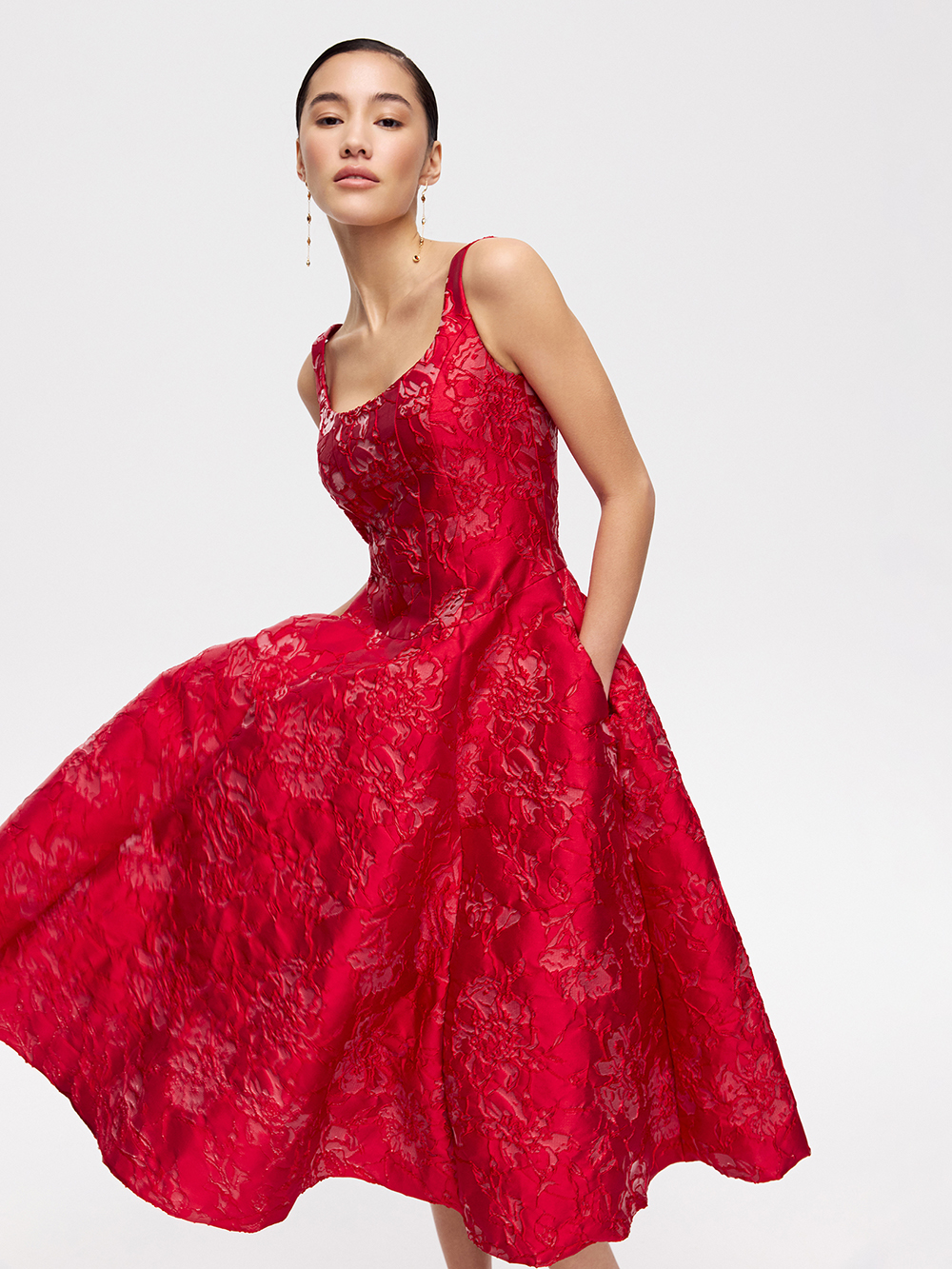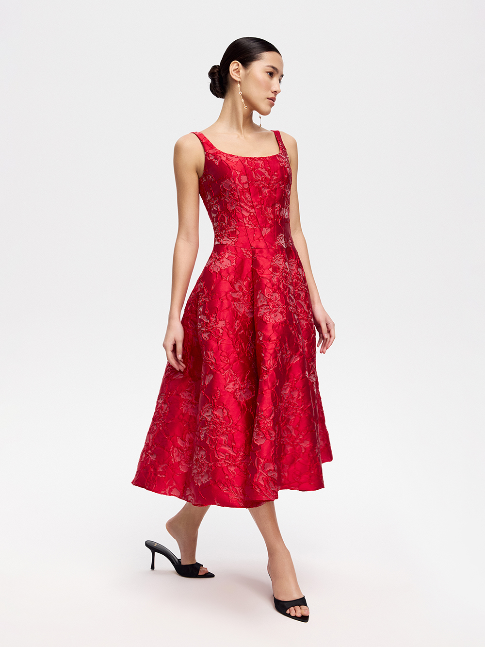 Платье из тафты с фактурным цветочным орнаментом создано для особенных событий. Корсетный лиф с рельефами и пышная юбка подчёркивают талию и формируют женственный силуэт. Декоративная плотная ткань, созданная специально для нарядных изделий, красиво держит форму. Платье дополнено приятной тактильно подкладкой с шёлком в составе. Платье застёгивается на молнию сзади.