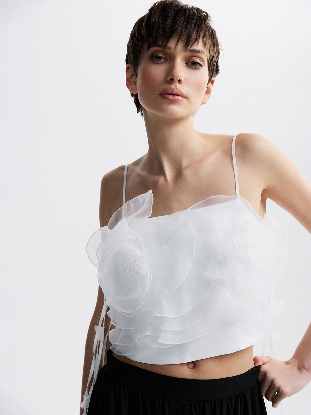 Топ Camellia – неизменный бестселлер. Изящный топ с камелией из органзы может послужить основой вечернего образа и украсить дневной – в сочетании с джинсами. В создании модели много сложной ручной работы, поэтому топ входит в серию limited. Топ выполнен из гладкой приятной ткани с шёлком в составе и дополнен декором из прозрачной органзы. Тонкие бретели можно регулировать по длине. Топ застёгивается на удобную молнию сбоку.