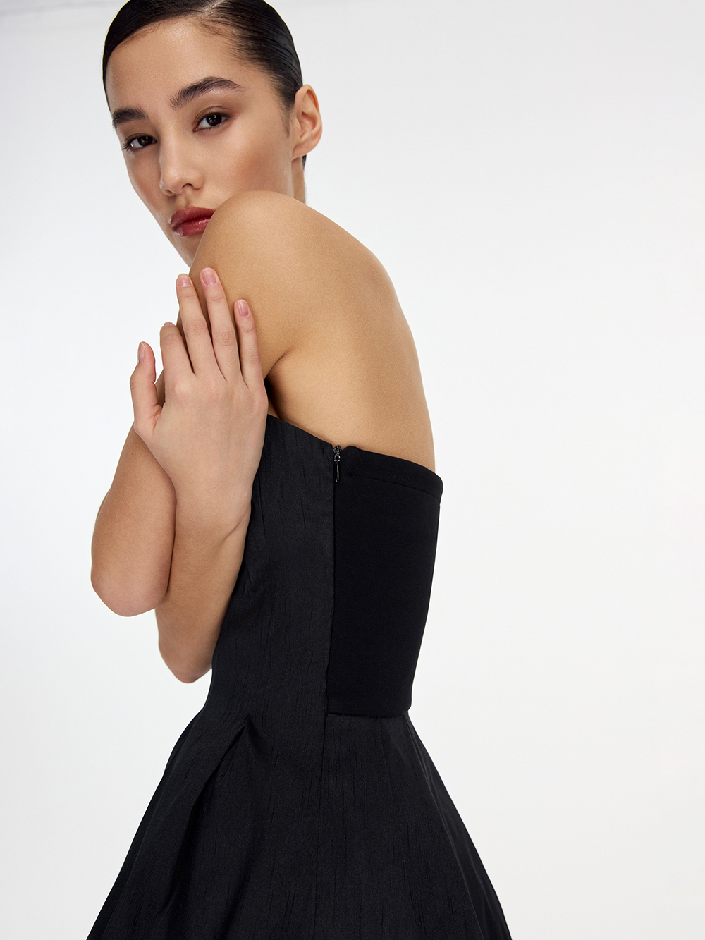 Корсетный топ с открытыми плечами сделает образ эффектным и заметным. Топ выполнен из комфортной, приятной к телу хлопковой трикотажной основы и корсета со встречными складками из тафты с красивой фактурой. Трикотажная основа-бандо хорошо тянется, а для лучшей фиксации топа мы предусмотрели силиконовую вставку по внутреннему краю лифа. Топ застёгивается на молнию сбоку.