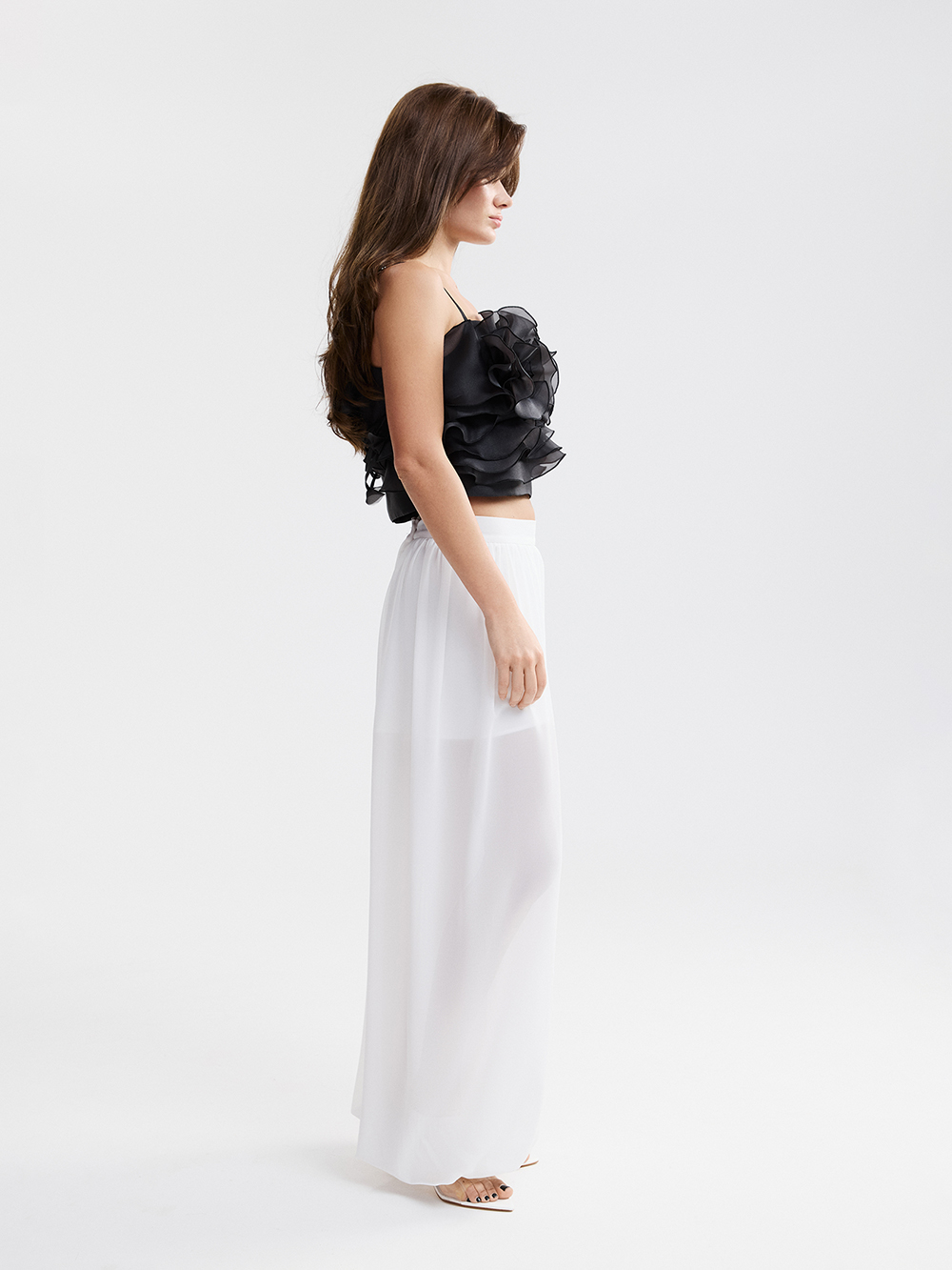 Брюки-шаровары, или “алладины”, из шифона идеальны для создания эффектных образов. Чтобы поддержать визуальную лёгкость прозрачного шифона, мы сделали нижний слой в виде коротких шорт. Сборка на широком поясе и резинка внизу делают силуэт более собранным и создают красивую форму. Брюки застёгиваются на молнию сзади.
