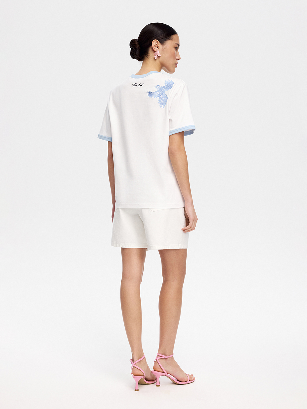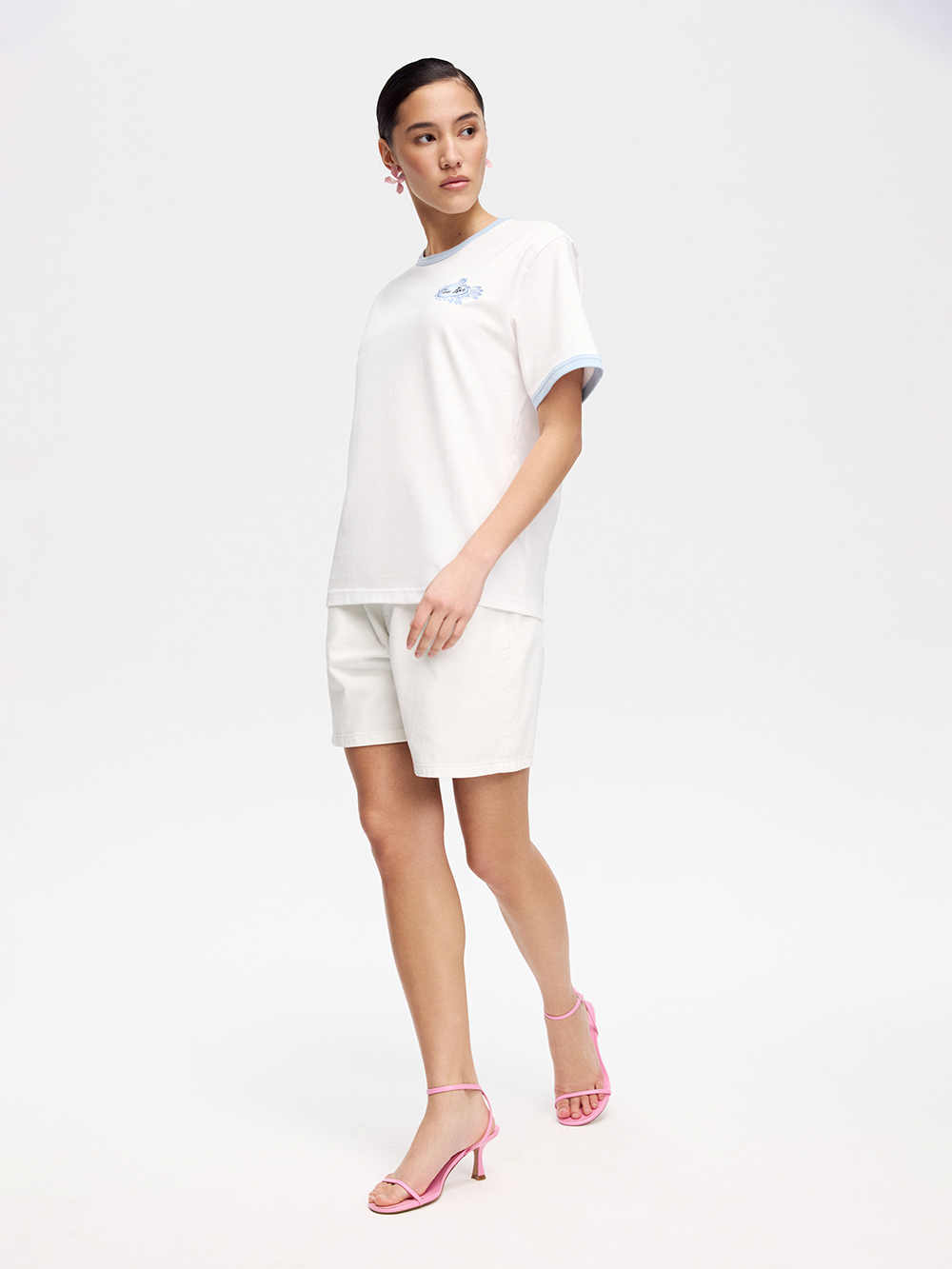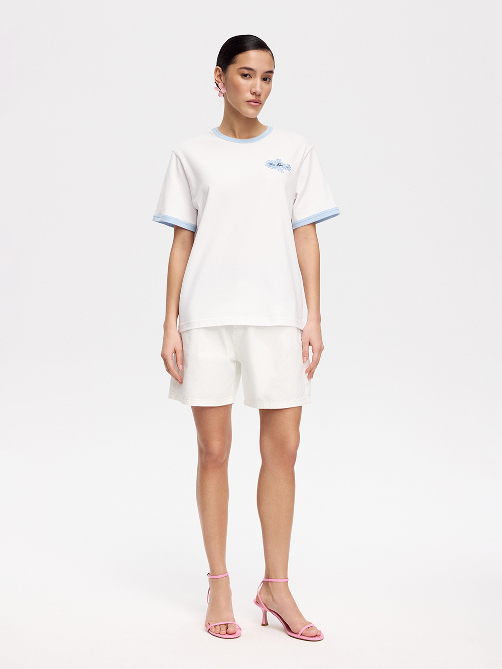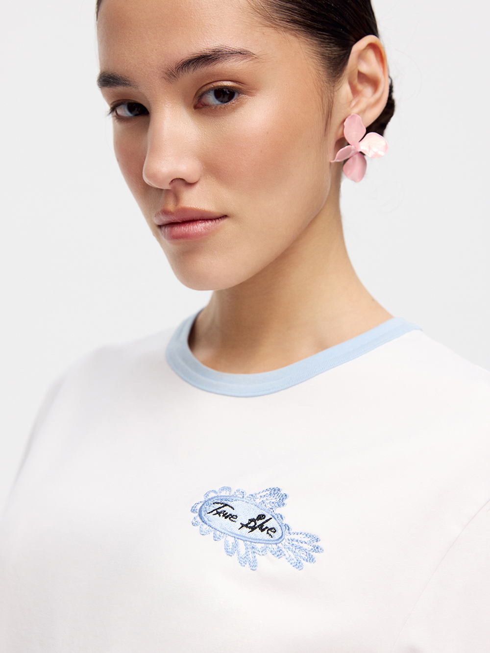 На модели футболка размера S