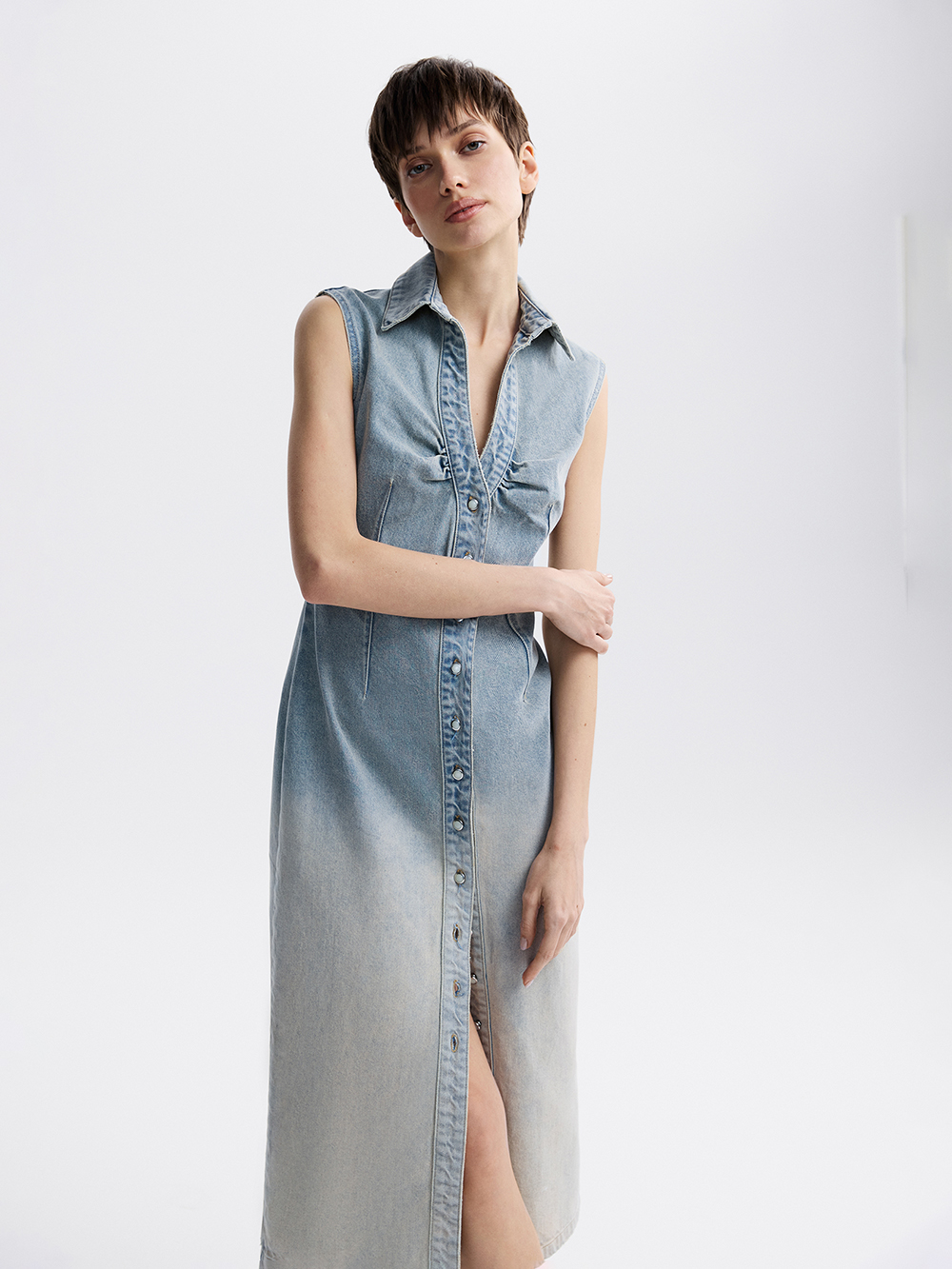 На модели платье размера S