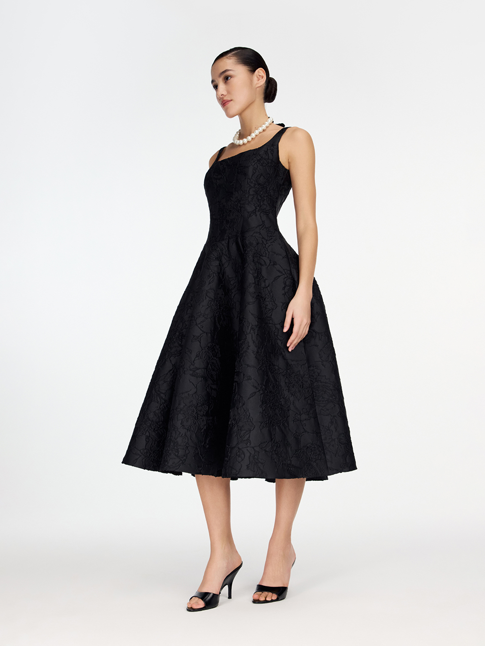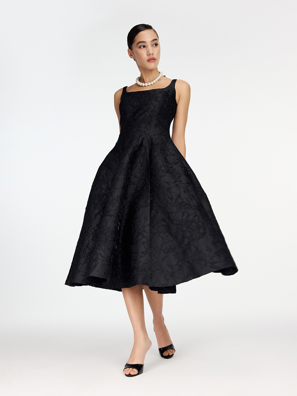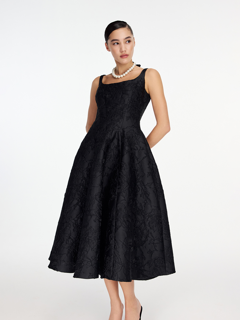 Платье из тафты с фактурным цветочным орнаментом создано для особенных событий. Корсетный лиф с рельефами и пышная юбка подчёркивают талию и формируют женственный силуэт. Декоративная плотная ткань, созданная специально для нарядных изделий, красиво держит форму. Платье дополнено приятной тактильно подкладкой с шёлком в составе. Платье застёгивается на молнию сзади.