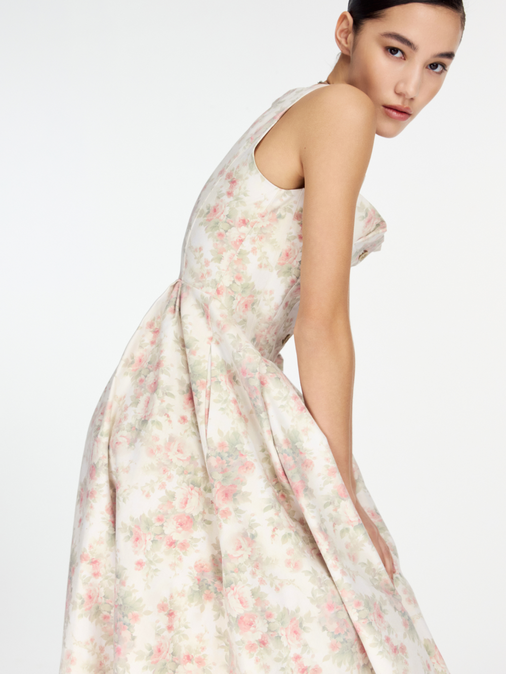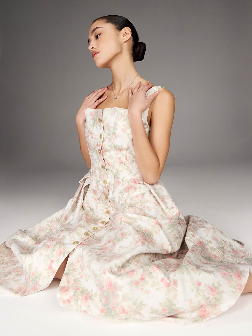 Платье миди для создания хрупкого женственного образа. Корсетный лиф и пышная юбка формируют очерченный силуэт и подчёркивают тонкость талии. Красивую форму юбки помогают поддерживать глубокие складки и внутренняя баска, предусмотренная нашими дизайнерами. Платье выполнено из плотной ткани на основе хлопка и дополнено мягкой хлопковой подкладкой. Застегивается на пуговицы.