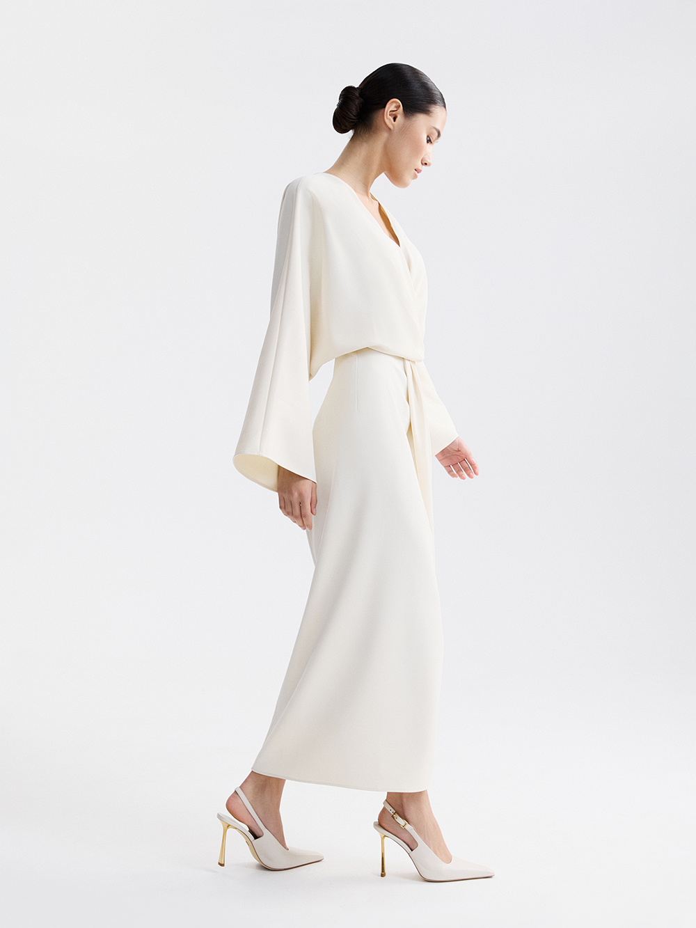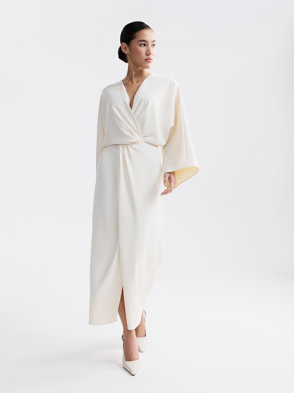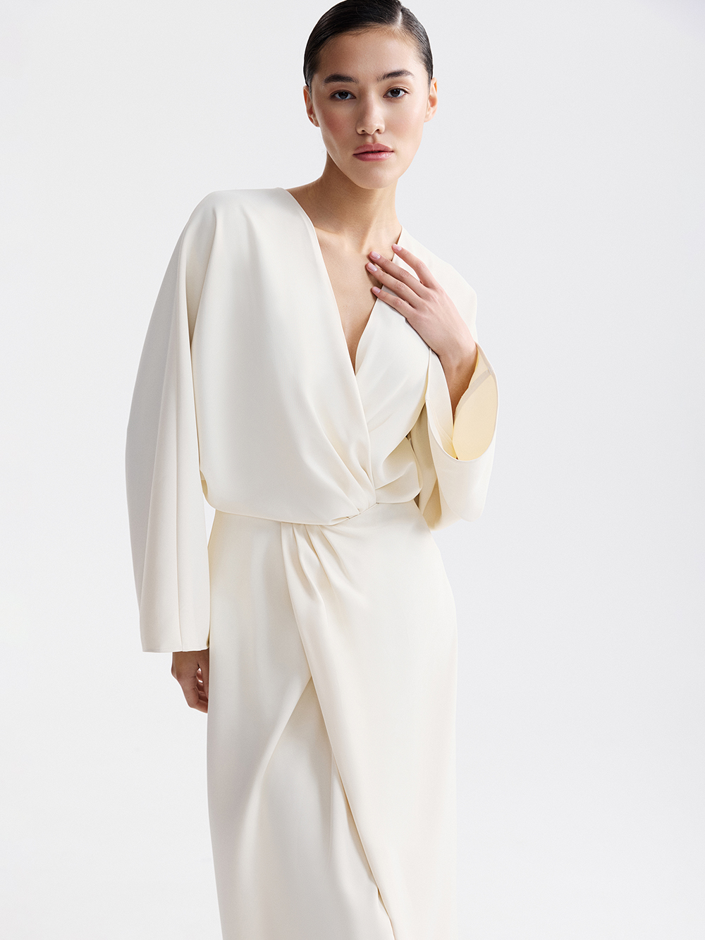 Вечернее платье со сложным эффектным кроем: драпировкой в виде необычного узла на талии, высоким разрезом спереди и продольным вырезом на спине. Широкие рукава добавляют выразительности образу и подчёркивают вечернюю стилистику платья. Платье выполнено из мягкой, красиво ниспадающей по телу ткани с лёгкой фактурой. Застёгивается на молнию сзади, вниз от линии талии.