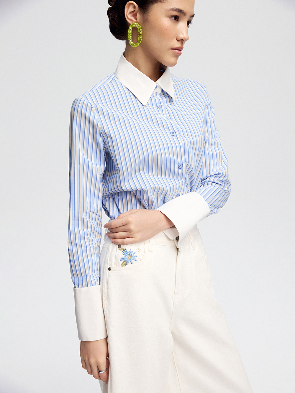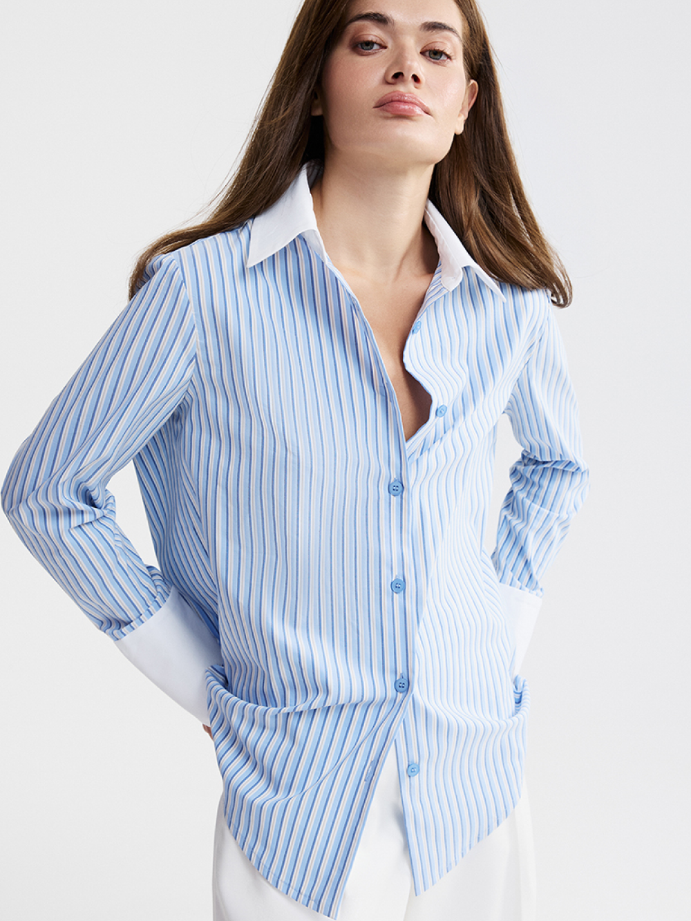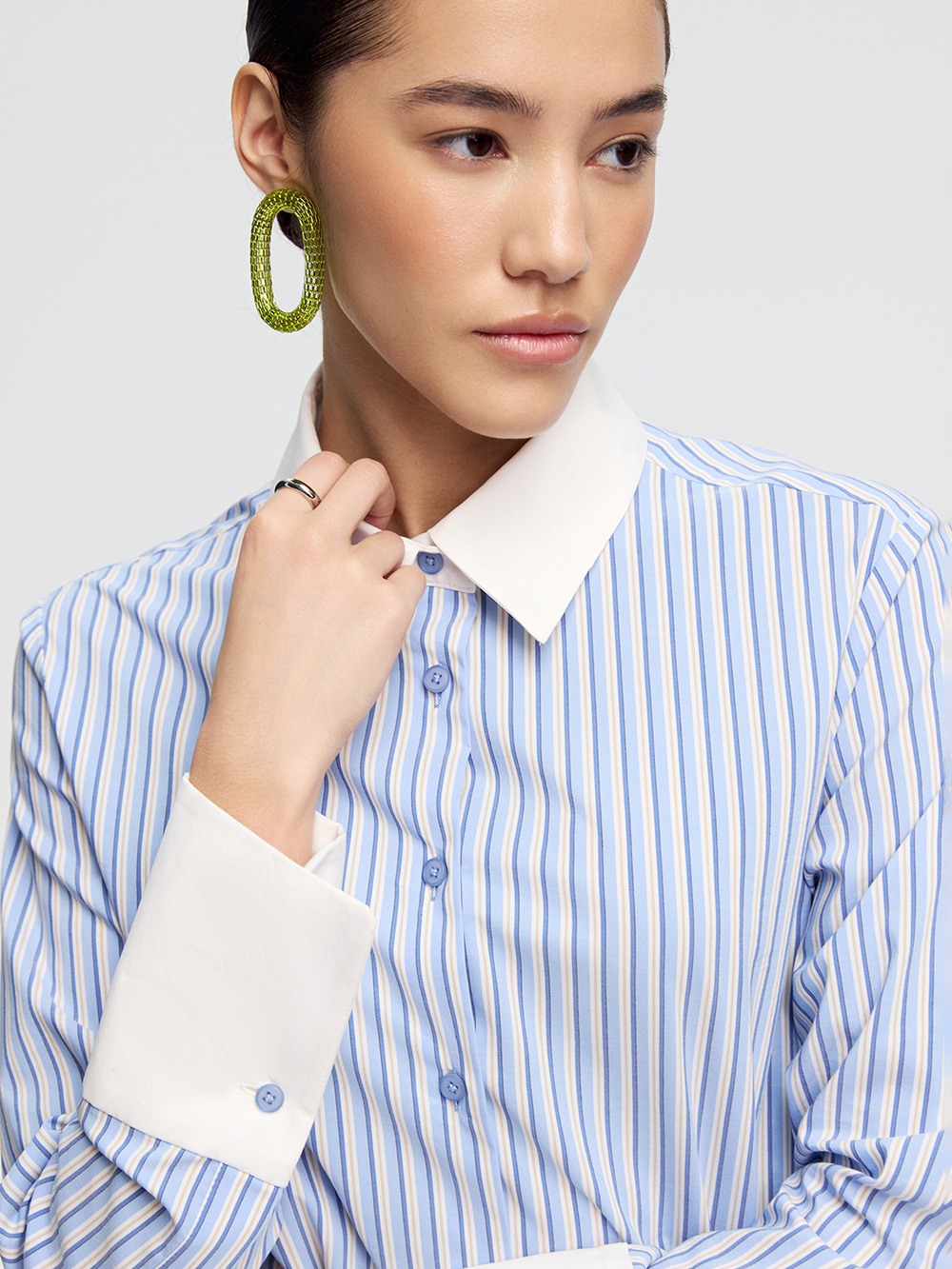 Рубашка из хлопка – базовая модель, лежащая в основе делового и повседневного гардероба. Мы сделали классическую сорочку акцентной за счёт контрастного воротника и манжетов. У рубашки актуальная посадка, дающая свободу, но аккуратная, без лишнего объёма. Рубашка выполнена из приятной к телу хлопковой ткани с долей искусственных волокон, чтобы ткань меньше мялась, не теряла форму и за ней было проще ухаживать.