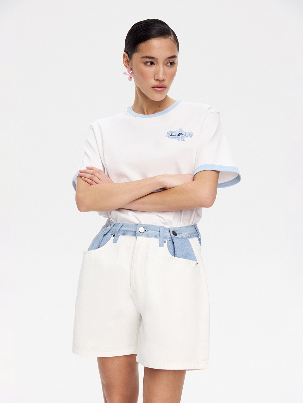 Шорты с контрастным поясом – летний вариант нашего бестселлера, джинсов с защипом. Пояс из денима другого оттенка делает модель актуальной, интересной и акцентной. Выполнены из комфортного хлопкового денима, прочного и долговечного. Шорты застёгиваются на молнию и металлическую пуговицу, такие же пуговицы фиксируют защипы. Есть карманы.