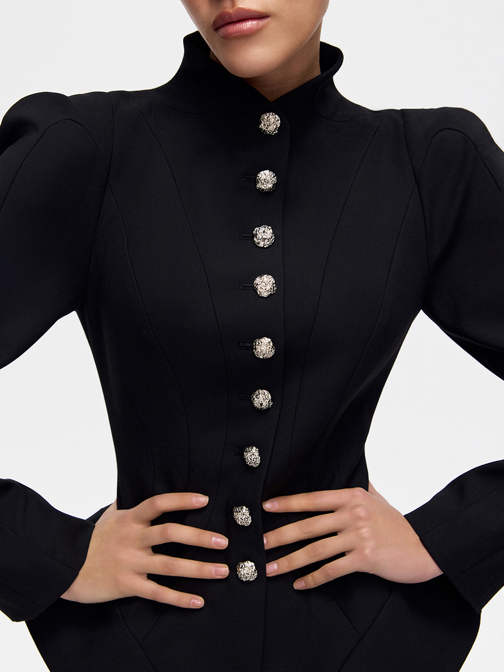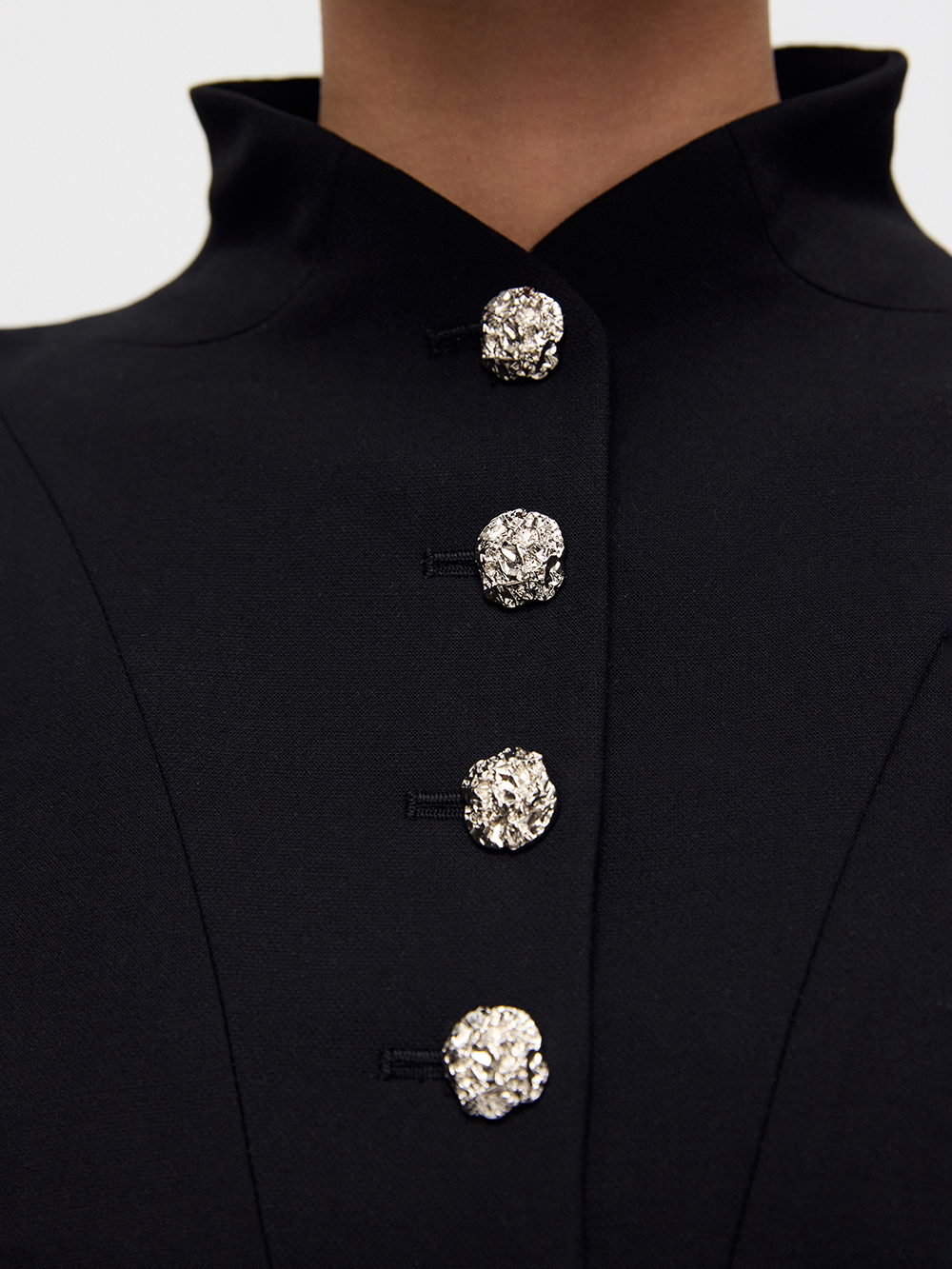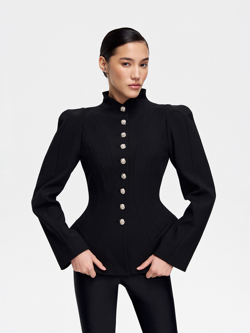 Изящный жакет с металлическими пуговицами вошёл в дроп, вдохновлённый эстетикой русского авангарда. Рукав с высоким плечом, фигурная выразительная баска и акцент на талии усиливают образ. Жакет выполнен из костюмной ткани и дополнен подкладкой с шёлком в составе.