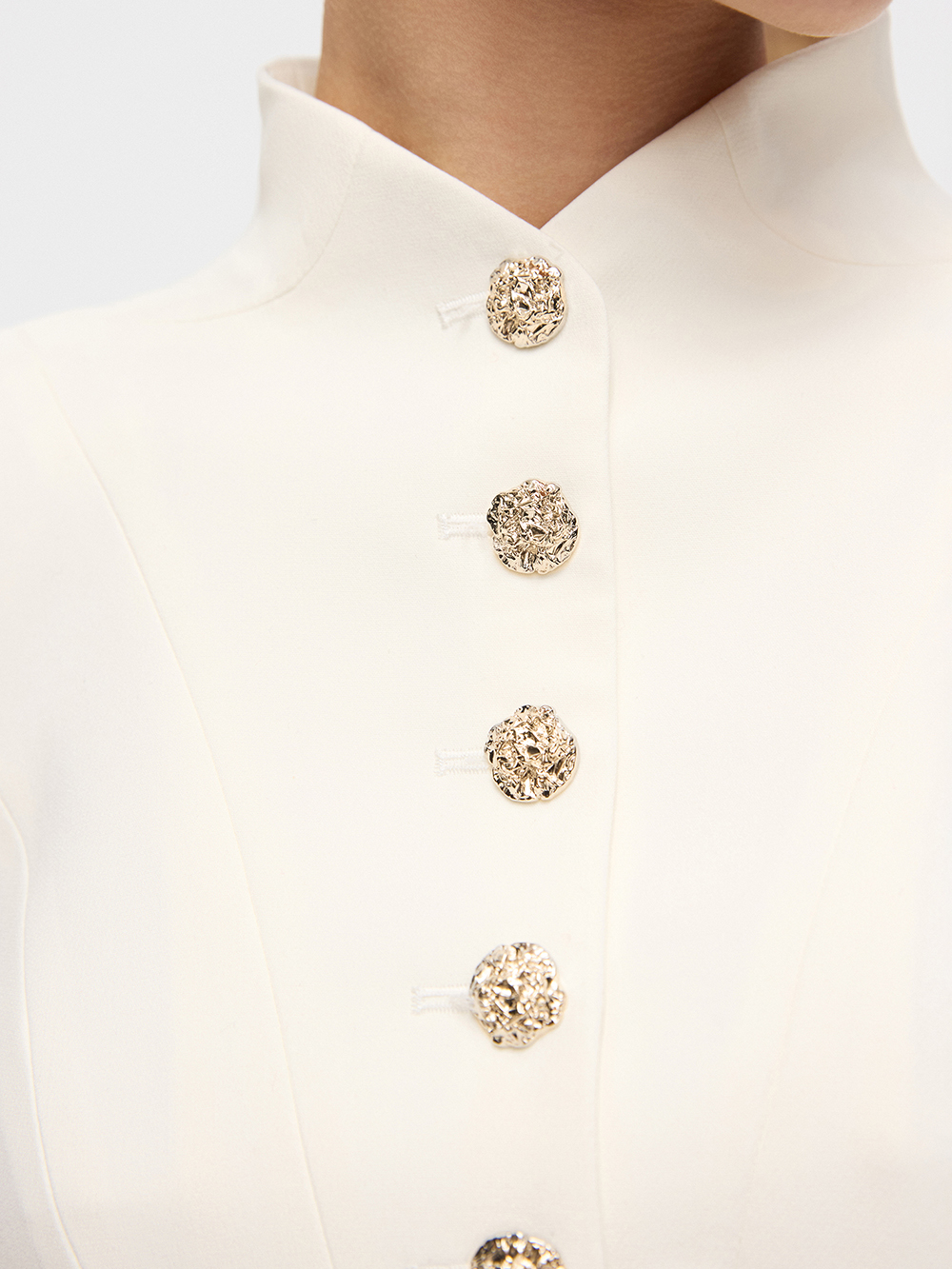 Изящный жакет с металлическими пуговицами вошёл в дроп, вдохновлённый эстетикой русского авангарда. Рукав с высоким плечом, фигурная выразительная баска и акцент на талии усиливают образ. Жакет выполнен из костюмной ткани и дополнен подкладкой с шёлком в составе.
