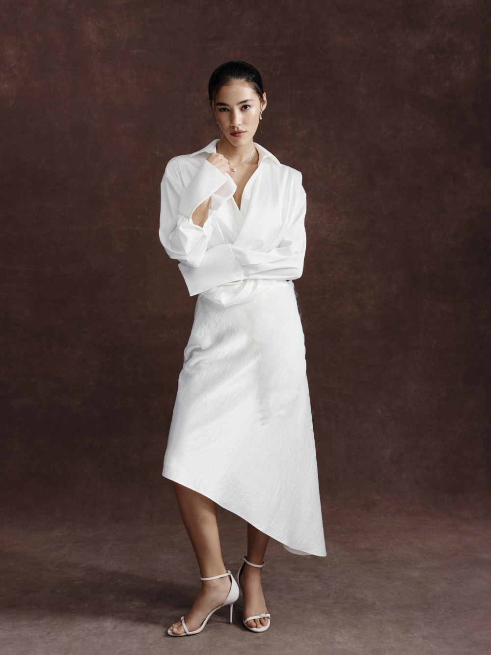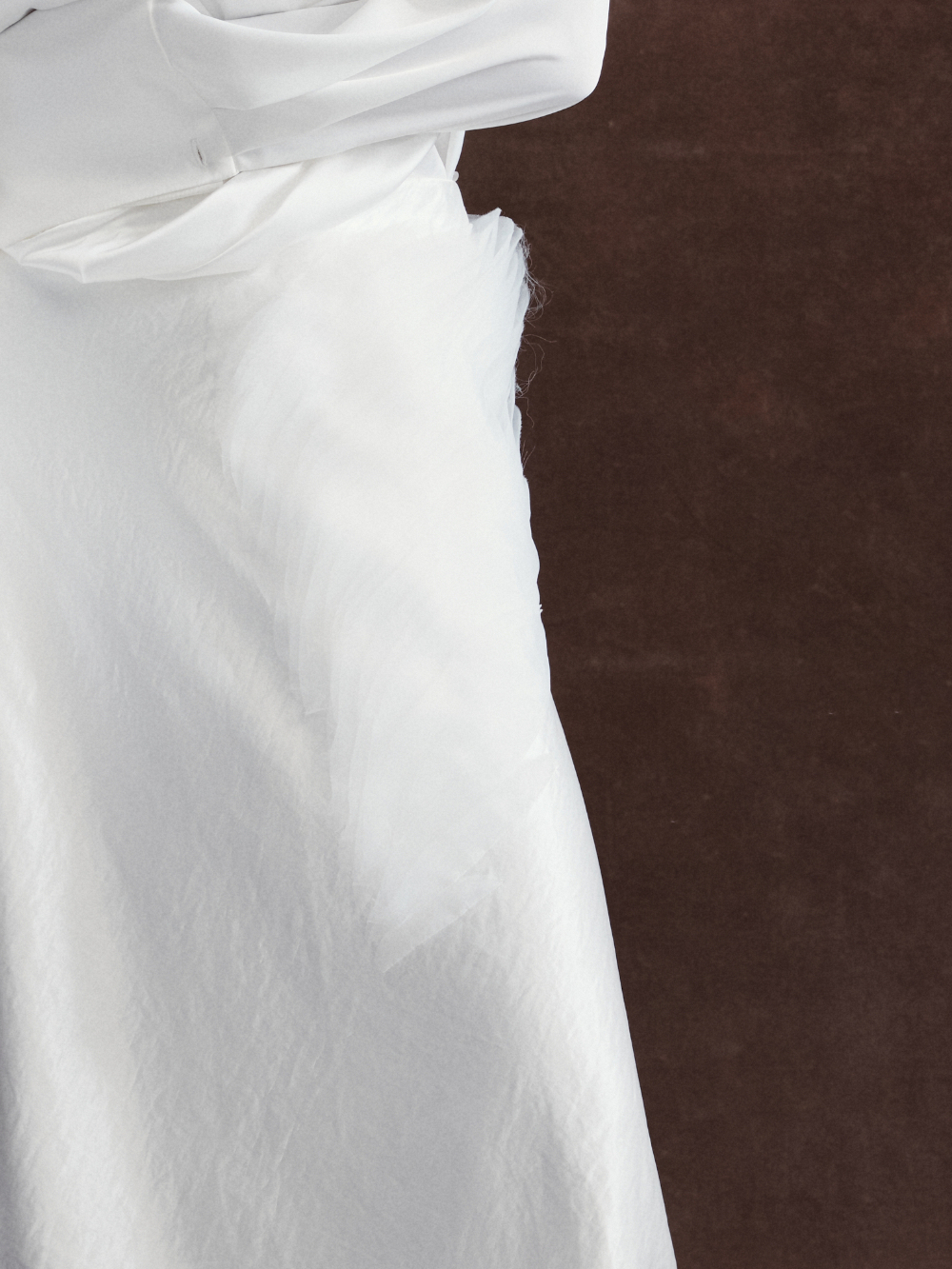 Асимметричная юбка украшена лепестками из органзы. Изящный многослойный декор подчёркивает воздушное, невесомое звучание образа. Модель скроена по косой, поэтому красиво струится и обволакивает силуэт. Юбка выполнена из нежного струящегося сатина с лёгкой фактурой и дополнена подкладкой с шёлком в составе. Застёгивается на молнию сбоку.