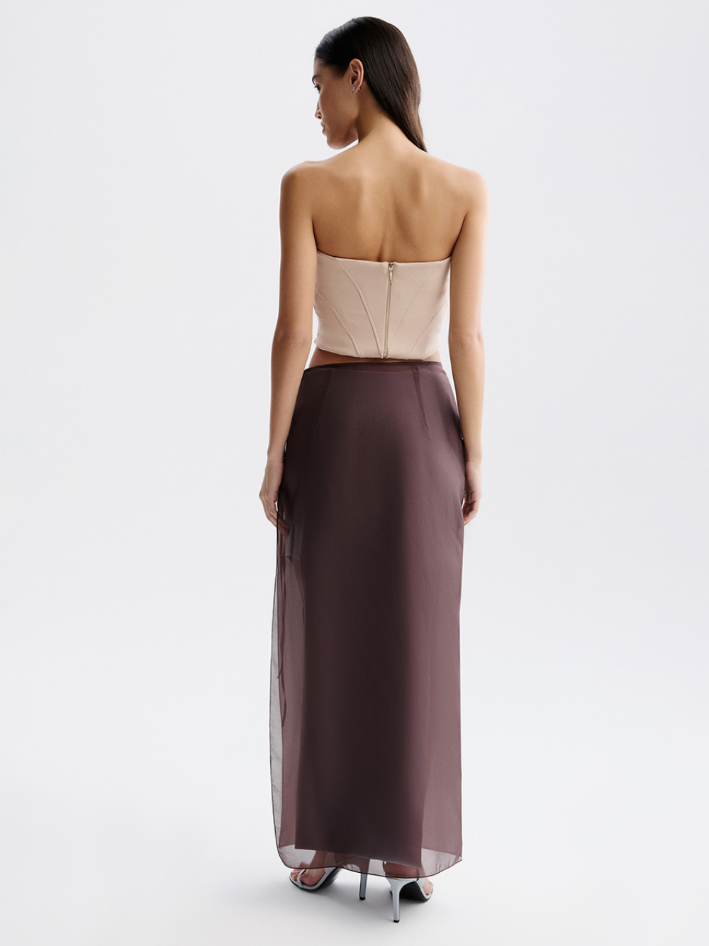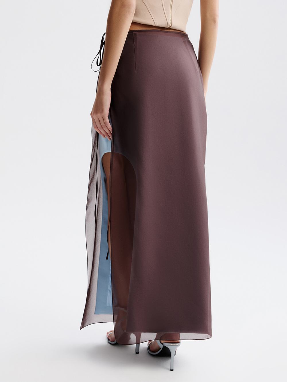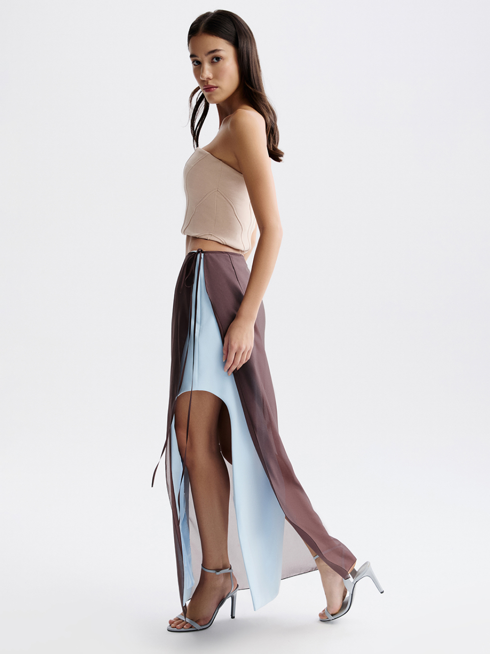 При создании нижней юбки мы использовали приём деконструкции, выполнив высокие вырезы, красиво открывающие ноги. Юбка сшита из костюмной ткани с подкладкой на основе шёлка. Застёгивается на молнию сбоку.