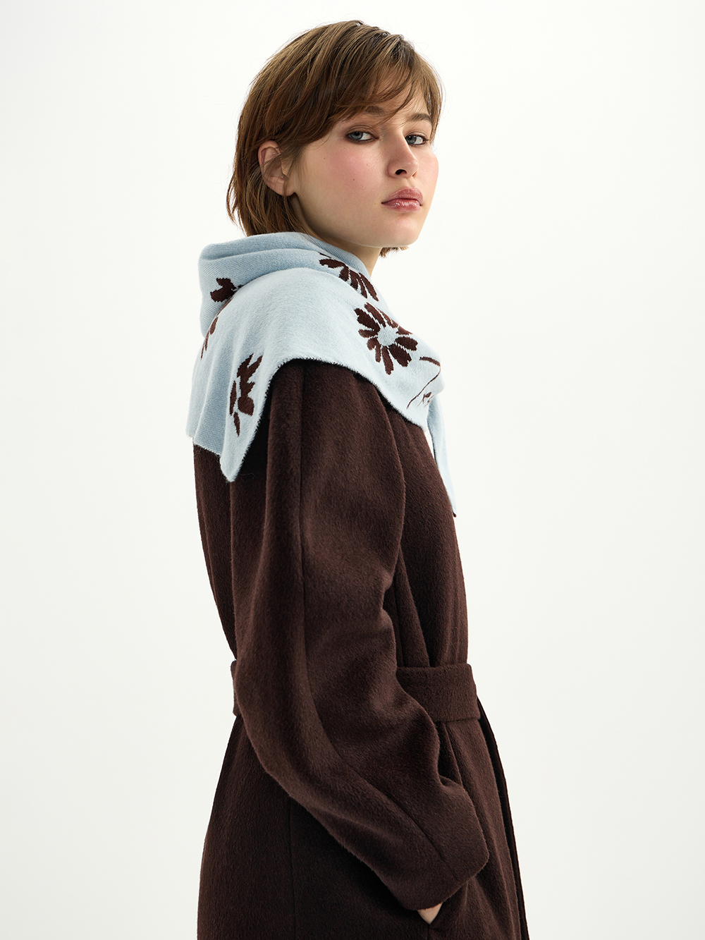 Косынка связана из мягкой и тёплой пряжи с шерстью, кашемиром и нежной вискозой. Косынка двухсторонняя, с вязаным цветочным принтом и логотипом бренда. Включите косынку в свой образ: повяжите на голову, накиньте как согревающий шарф или акцентный аксессуар со свитером, пальто или пуховиком.