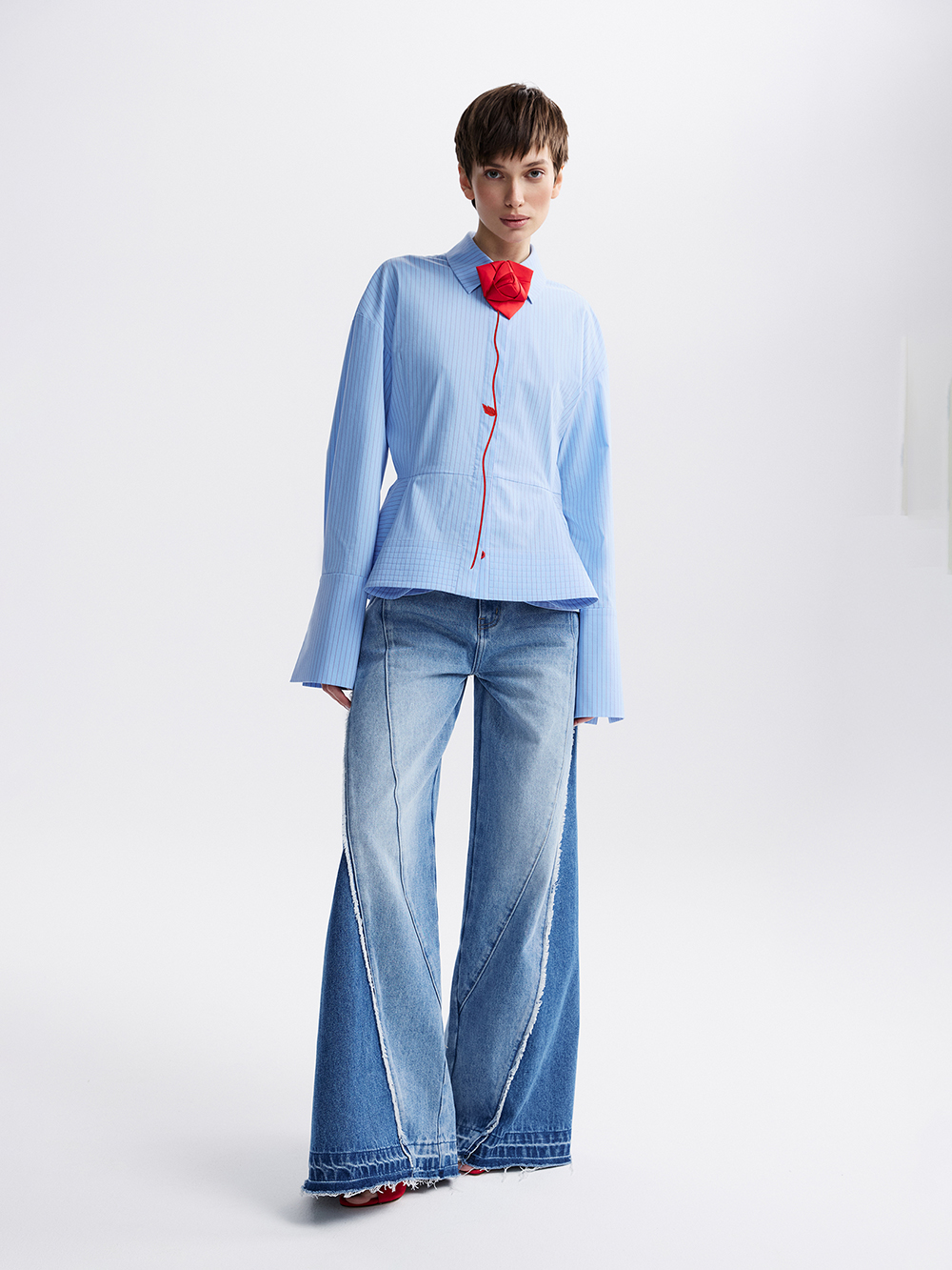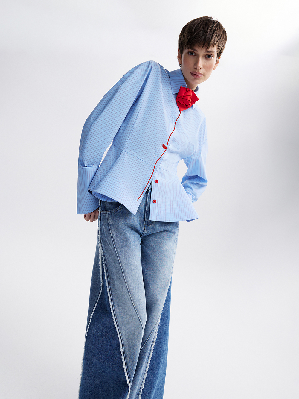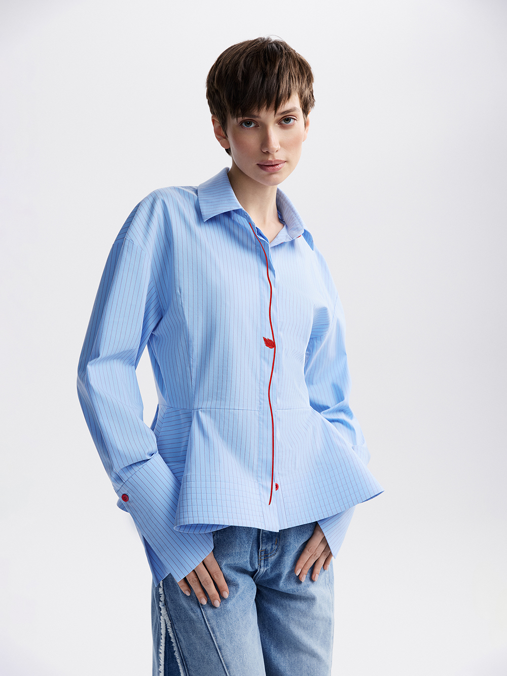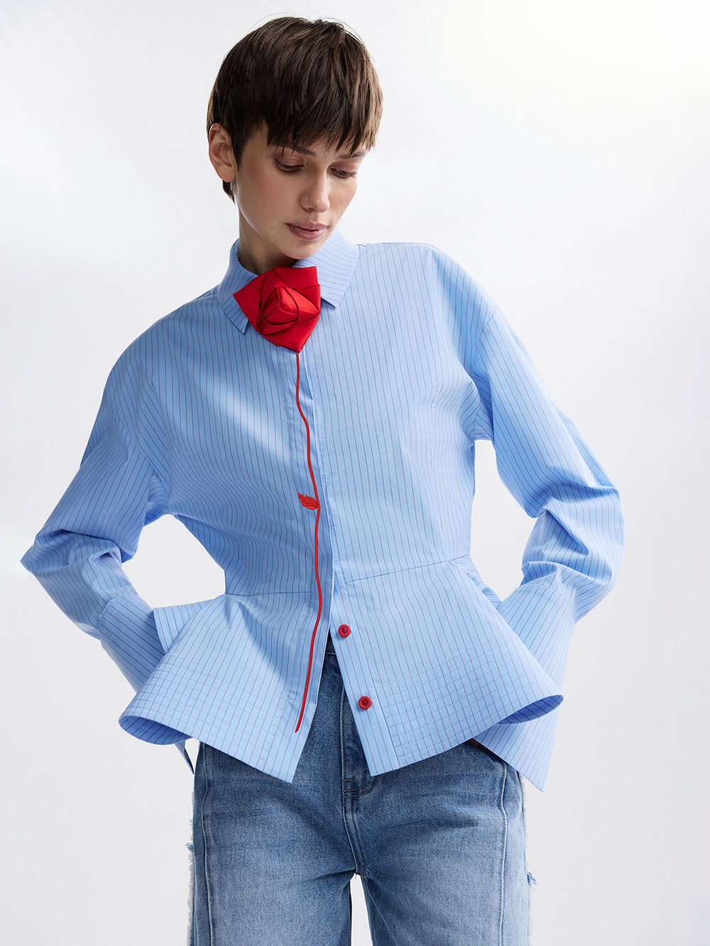 Рубашка с баской украшена вышивкой и розой, выполненной в технике оригами. Роза крепится на петлю и пуговицу под воротником, её можно снять при желании. Выразительный силуэт с акцентом на талии: баска, собранная в складки и дополнительно уплотнённая прострочкой, перекликается с широкими манжетами. Рубашка выполнена из приятной к телу хлопковой ткани с долей искусственных волокон, чтобы ткань меньше мялась, не теряла форму и за ней было проще ухаживать.
