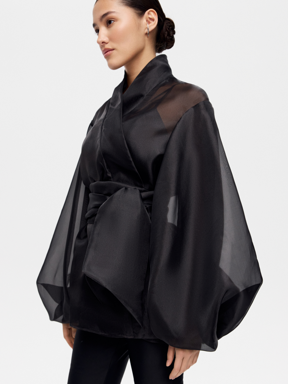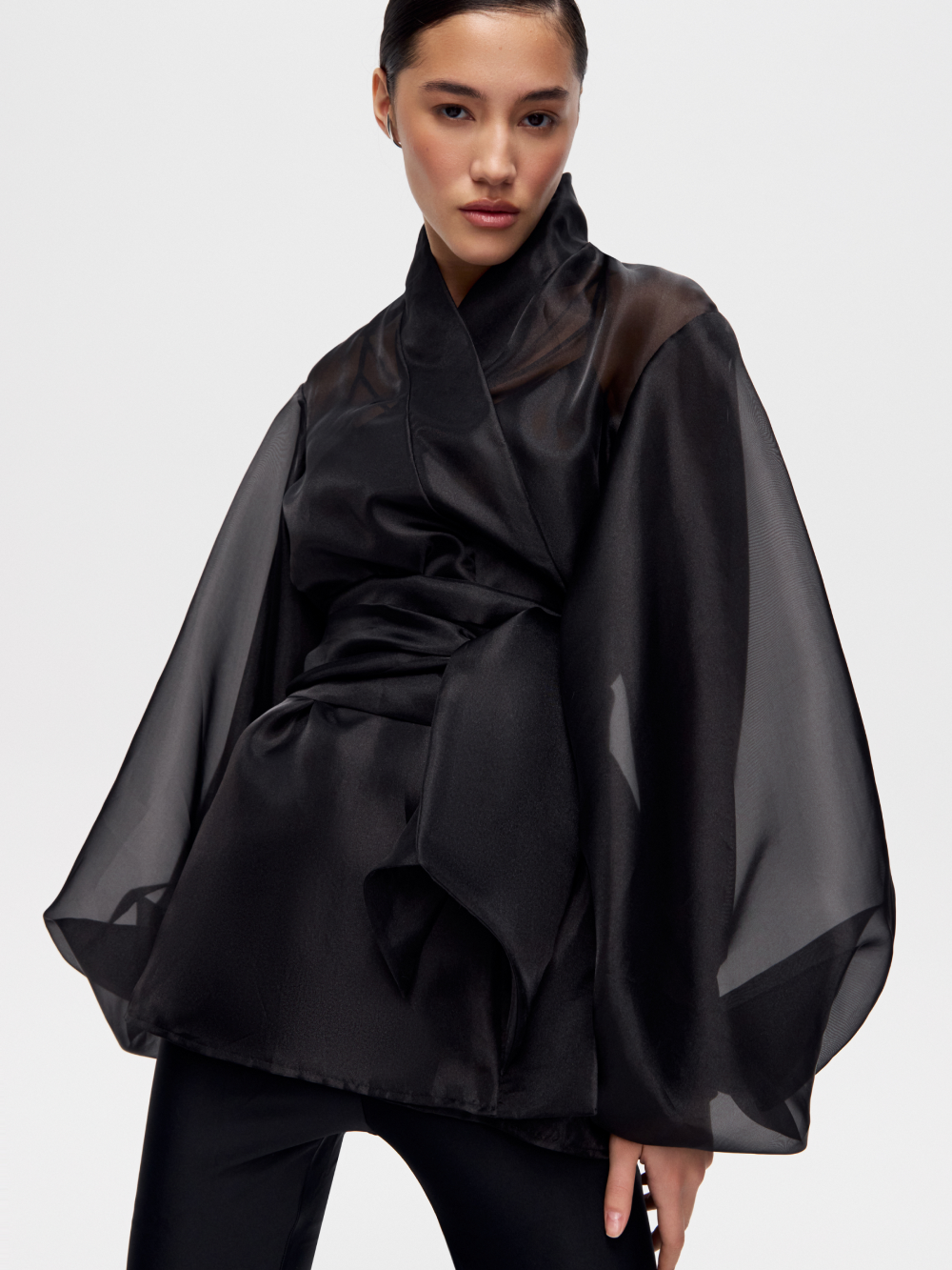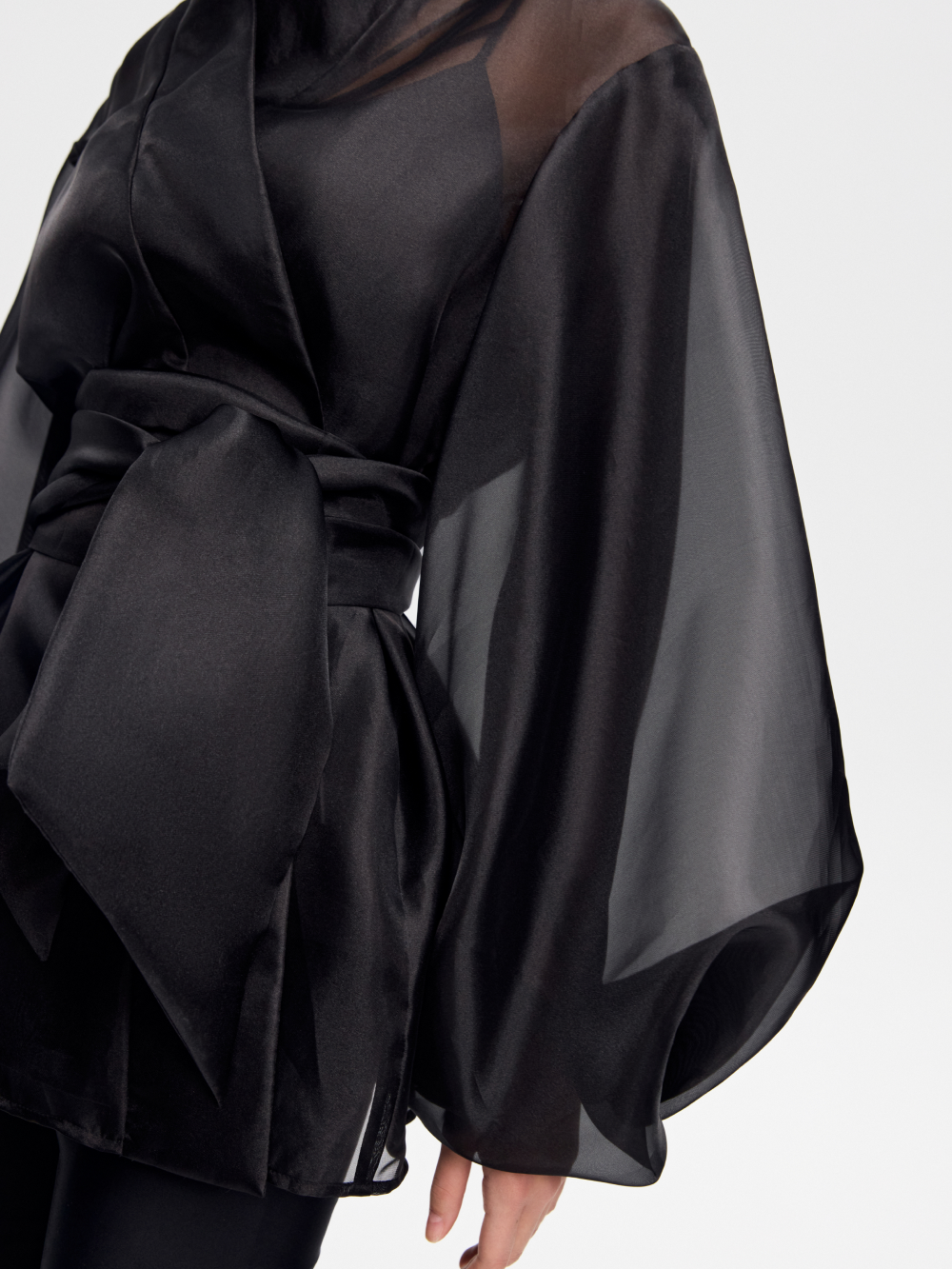 Туника из органзы – знаковая модель и наш бестселлер. Выполнена из матовой органзы, которая великолепна в драпировке и приятна к телу. Выразительные рукава зафиксированы на внутреннюю мягкую сетку и сохраняют форму. Внутренние швы аккуратно закрыты. В комплект входит широкий пояс-лента из основной ткани. Туника идеальна в дуэте с топами в бельевом стиле.