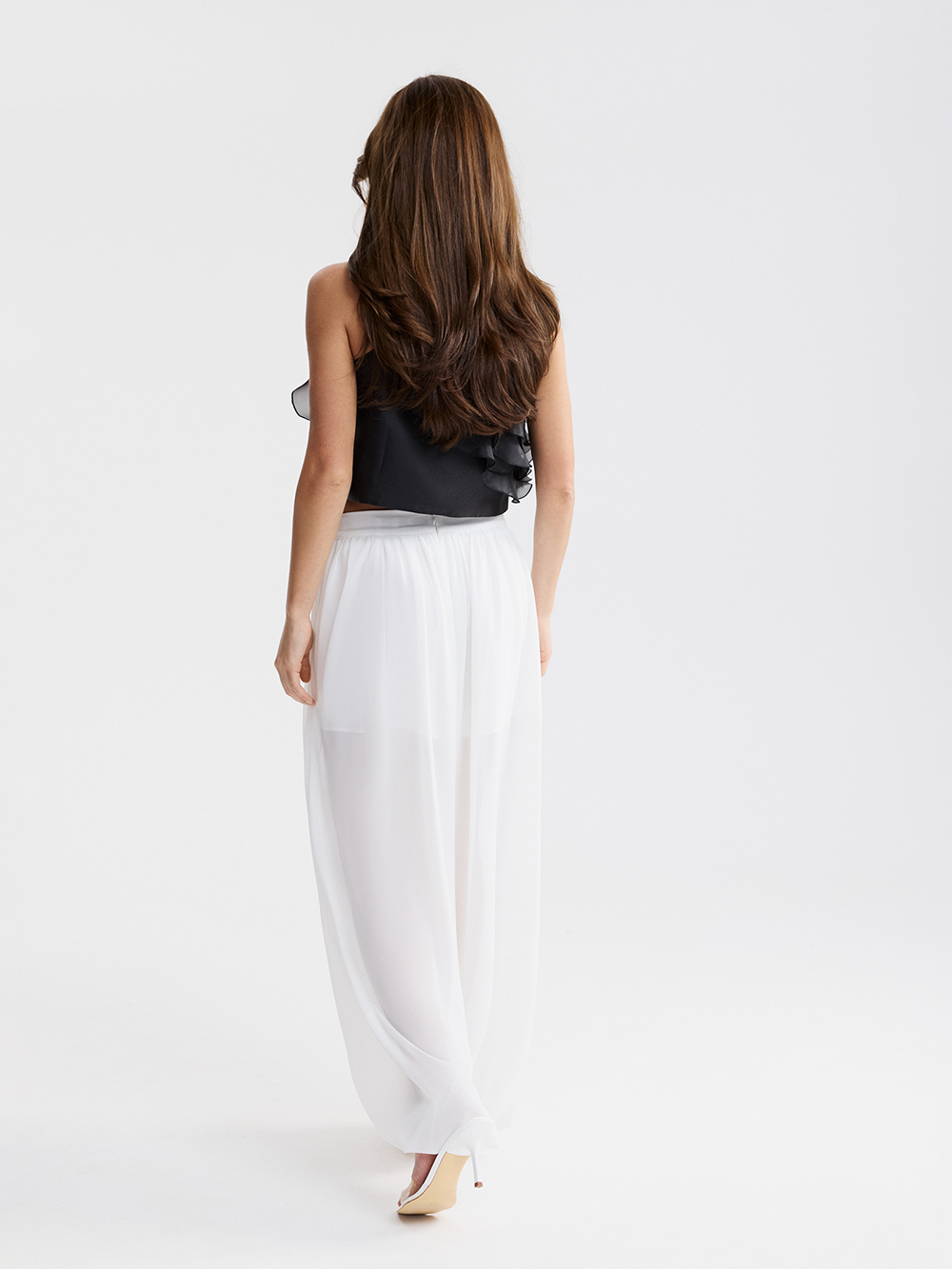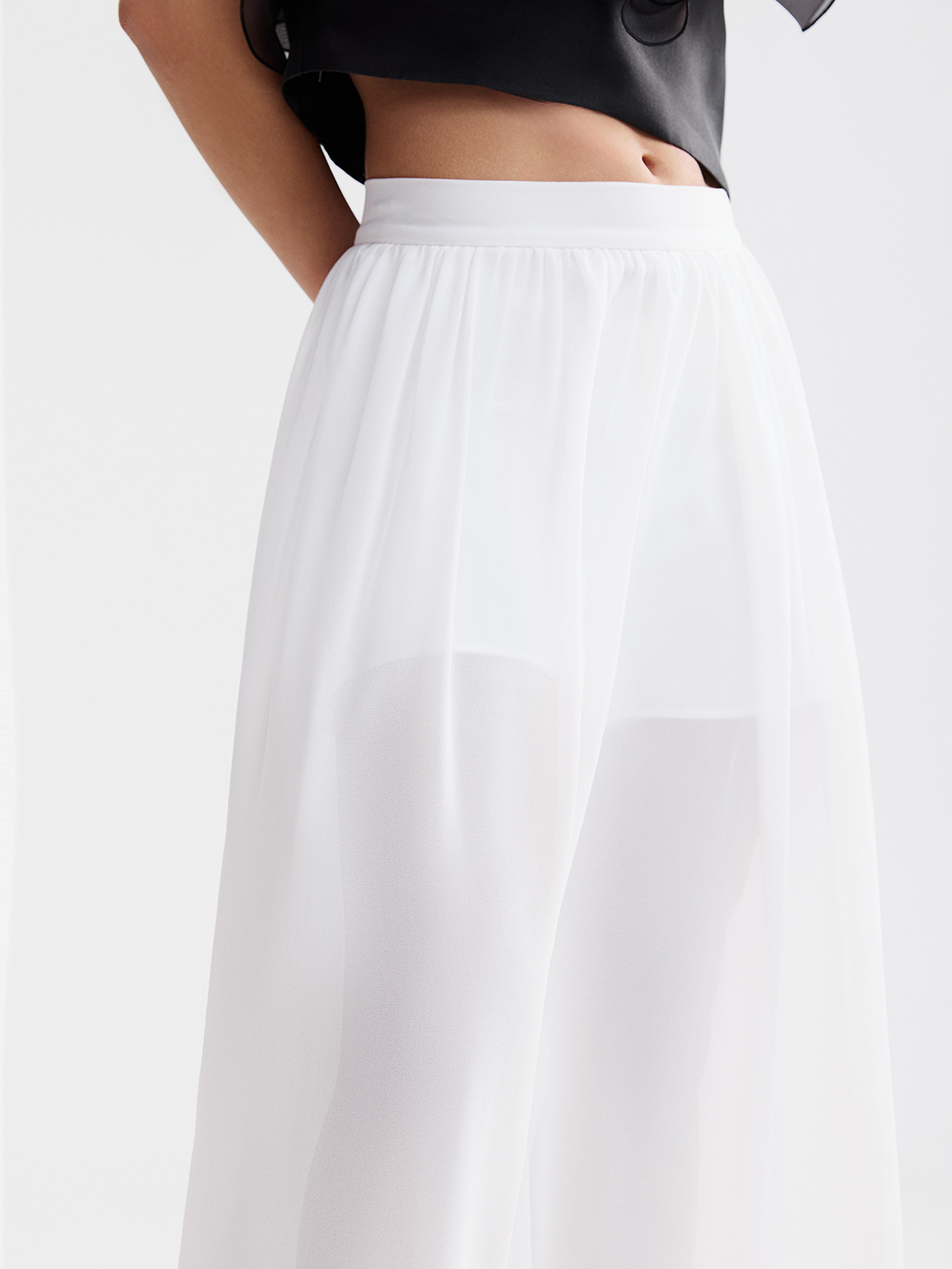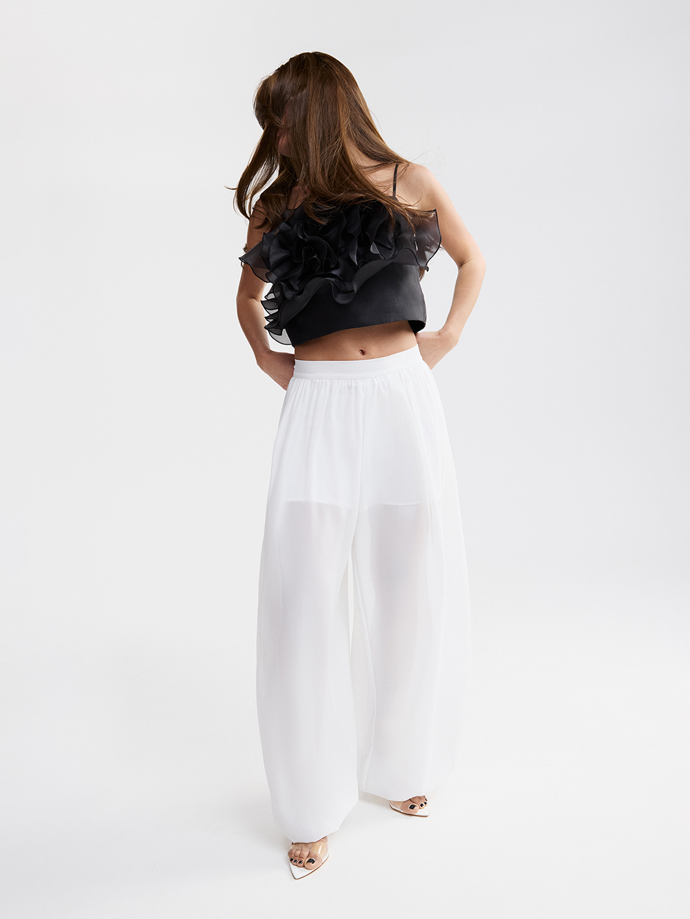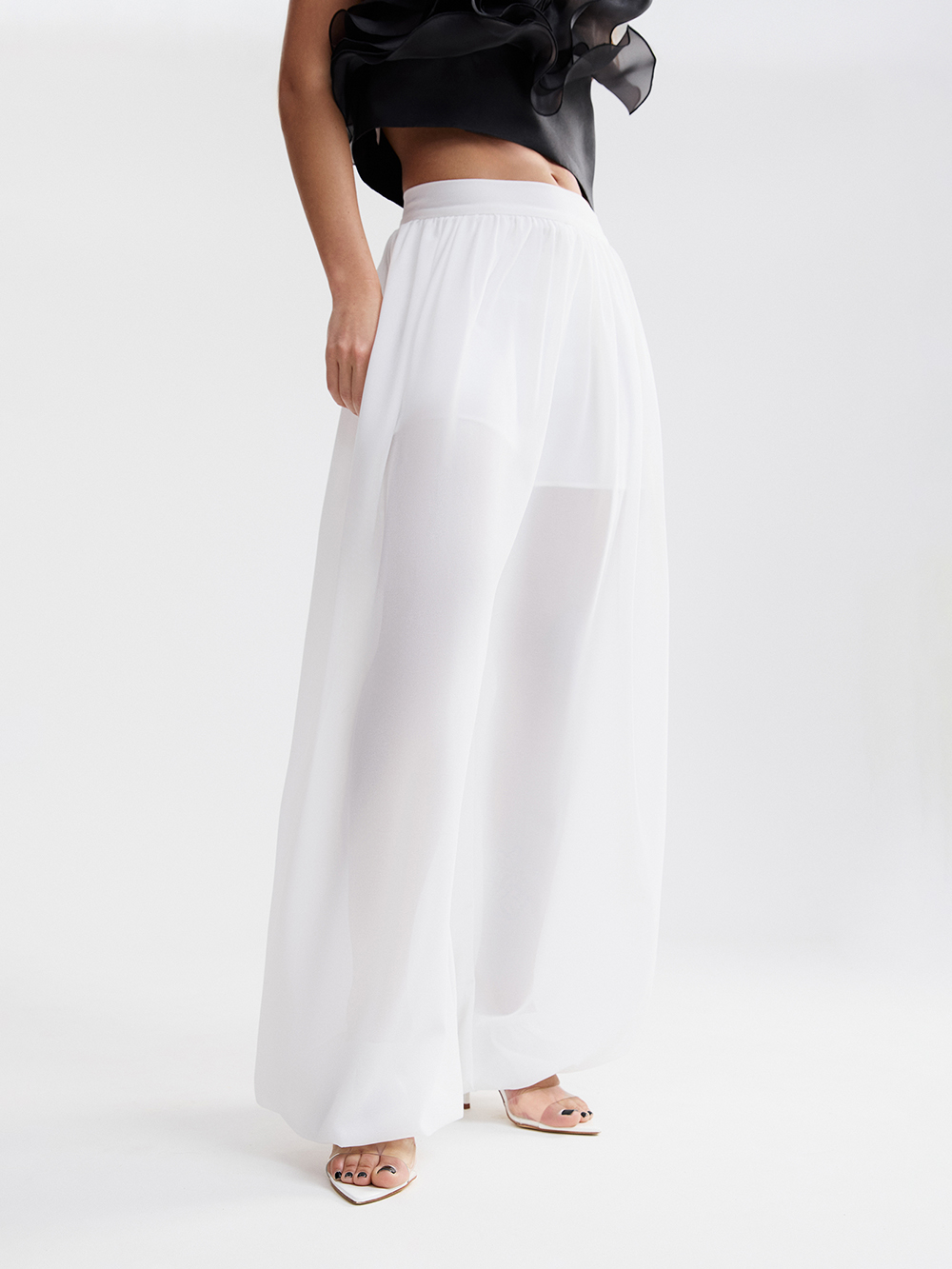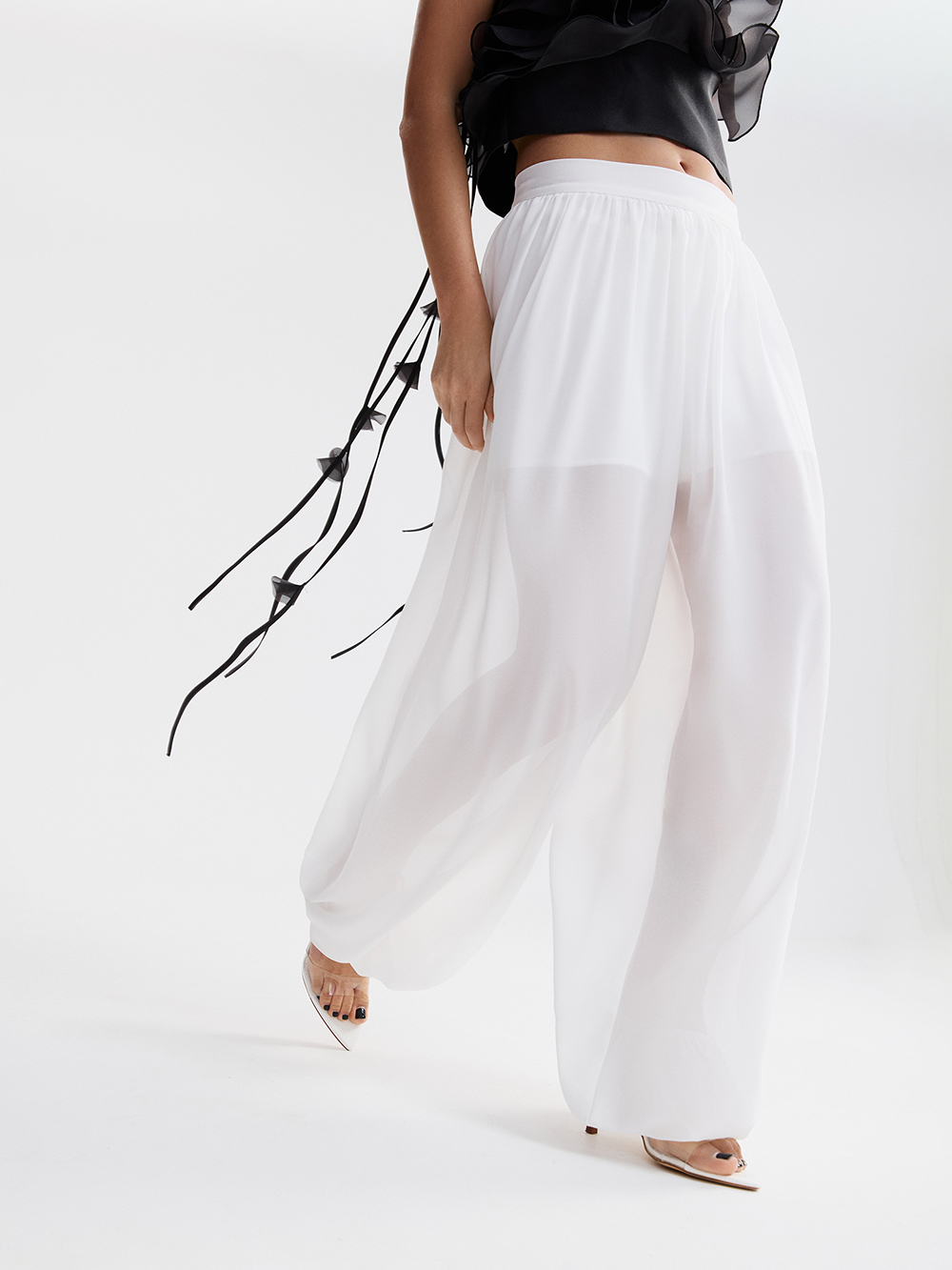 Брюки-шаровары, или “алладины”, из шифона идеальны для создания эффектных образов. Чтобы поддержать визуальную лёгкость прозрачного шифона, мы сделали нижний слой в виде коротких шорт. Сборка на широком поясе и резинка внизу делают силуэт более собранным и создают красивую форму. Брюки застёгиваются на молнию сзади.