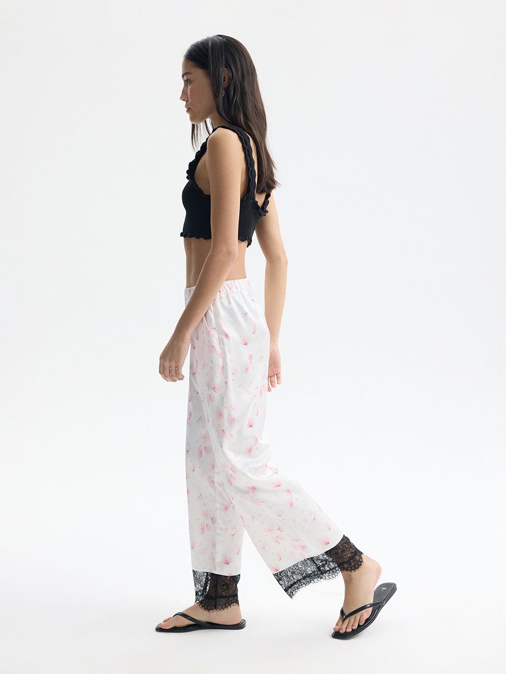 Брюки из гладкого вискозного шёлка мы украсили кружевом шантильи. Нежные цветы сакуры для принта отрисовали наши дизайнеры. Брюки легко струятся, удобно сидят и особенно приятны для лета. Комфортная продуманная посадка: широкая резинка и сбоку застёжка на пуговицу и молнию. Есть карманы.